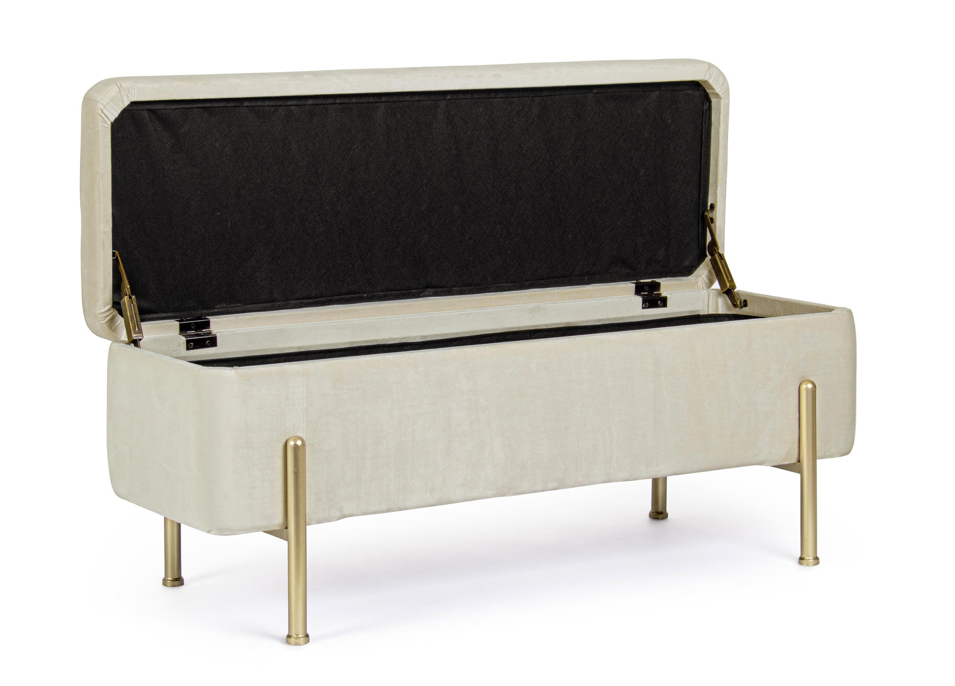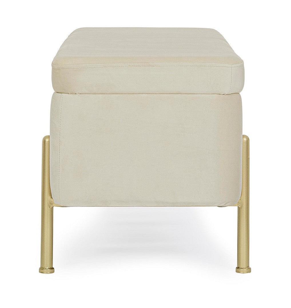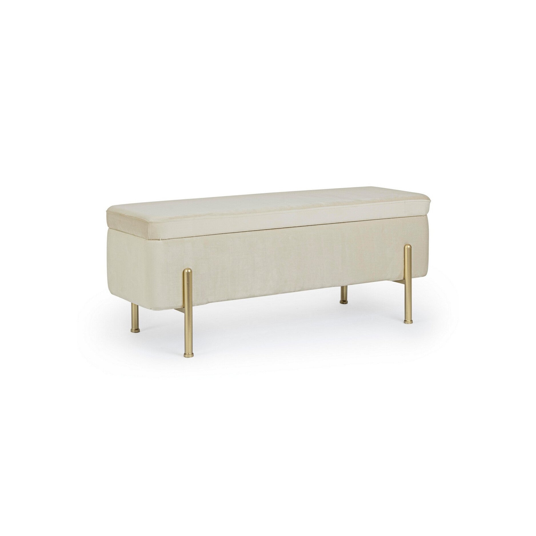 Banqueta Irina Longa Natural, pernas metal dourado, com arrumação. Apresentamos uma das peças de mobiliário mais práticas e funcionais que conhecemos. Pensado para o ajudar na sua vida quotidiana. Banqueta Irina é um banco que não só permite sentar-se aos pés da cama, ajudá-lo no vestuário ou completar a decoração da sua casa, mas também pode guardar cobertores, almofadas ou todos aqueles complementos e acessórios de que necessita. Um design que combina um tecido de veludo macio com pernas metálicas finas para criar uma peça de mobiliário elegante e sofisticada. Uma arrumação prática e funcional que proporciona espaço de armazenamento extra em qualquer divisão. Graças ao seu design simples e intemporal nunca sairá de moda e será fácil de combinar com qualquer estilo decorativo.