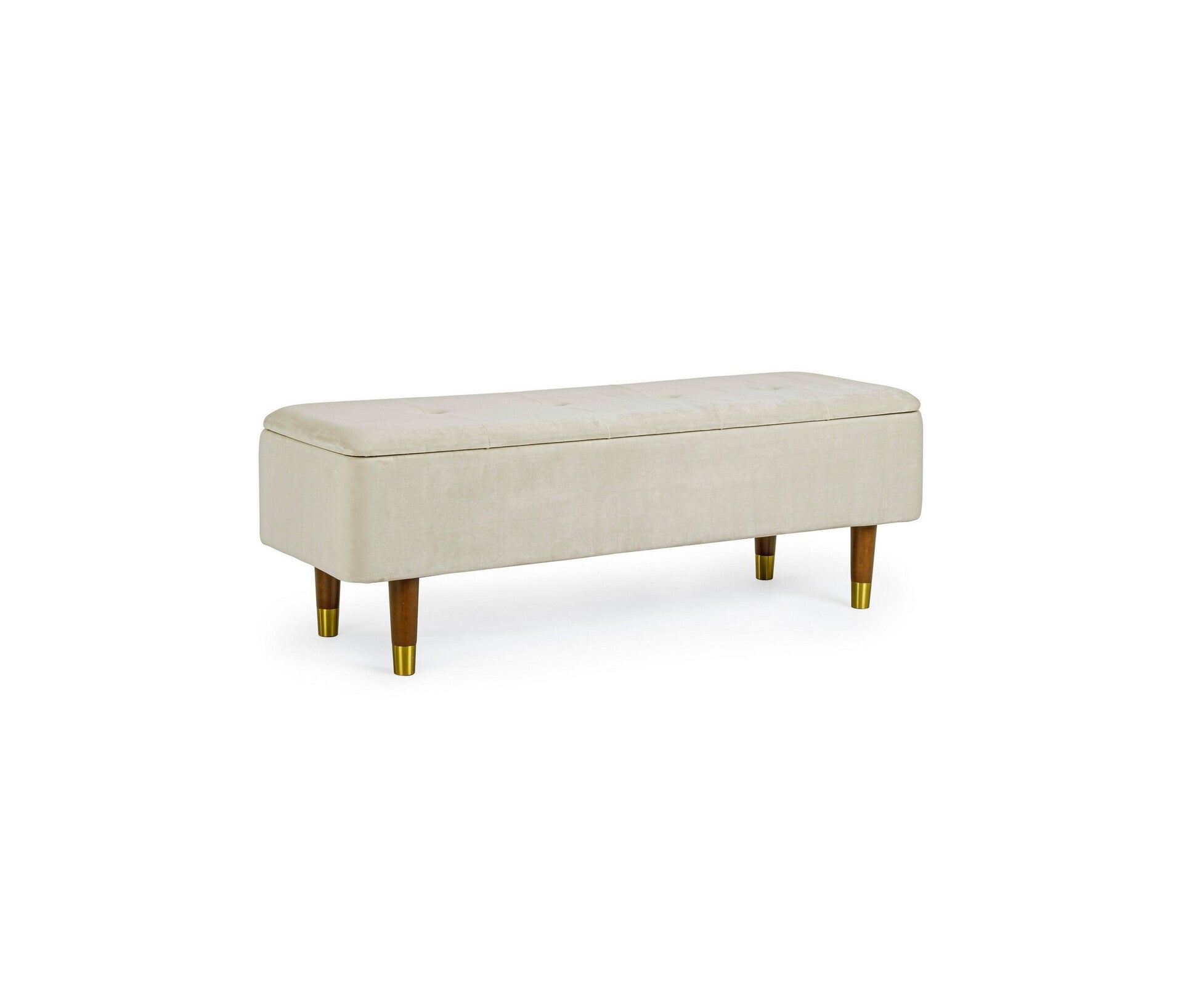 Banco Kira longo creme, pernas madeira e dourado, com arrumação. Apresentamos uma das peças de mobiliário mais práticas e funcionais que conhecemos, pensado para o ajudar na sua vida quotidiana.