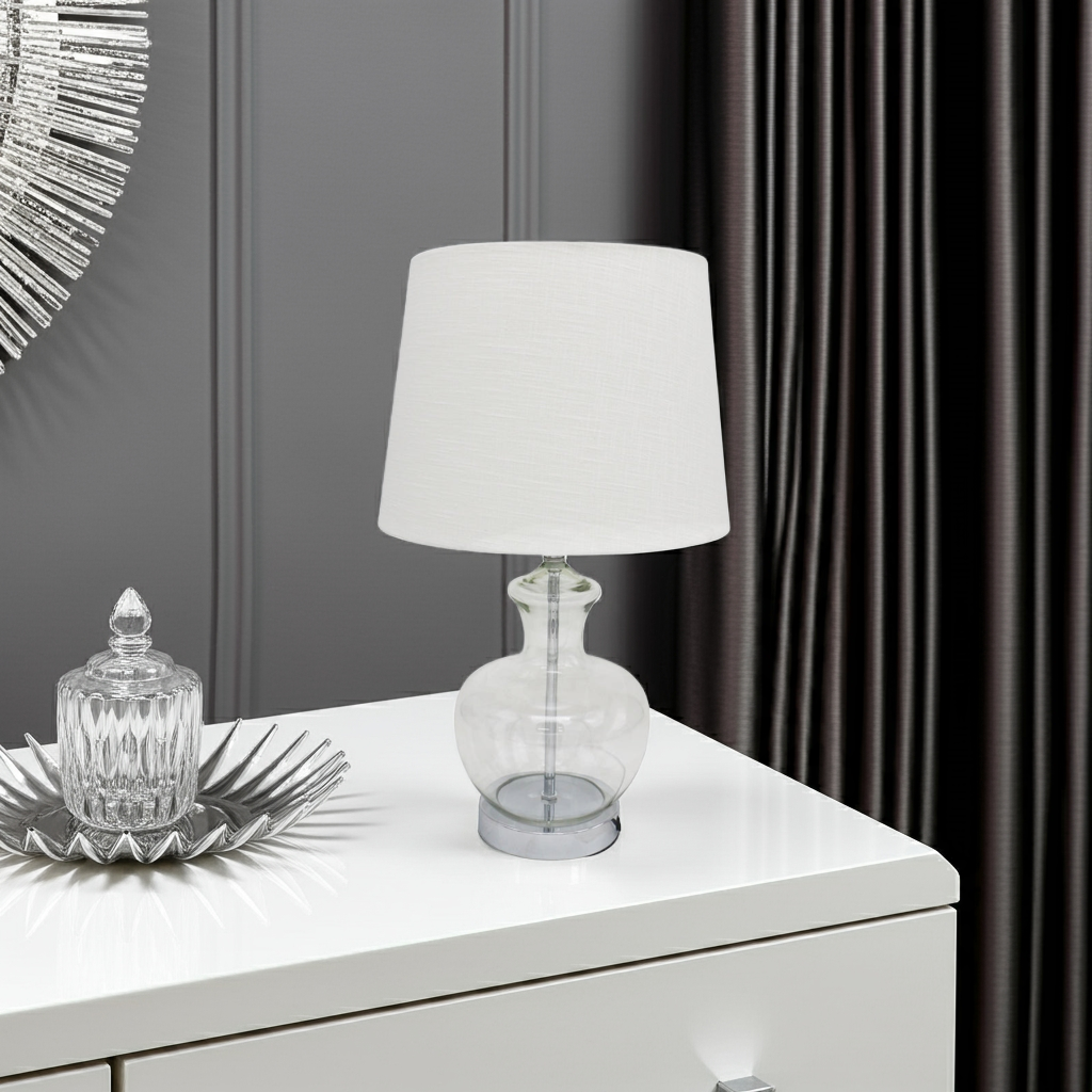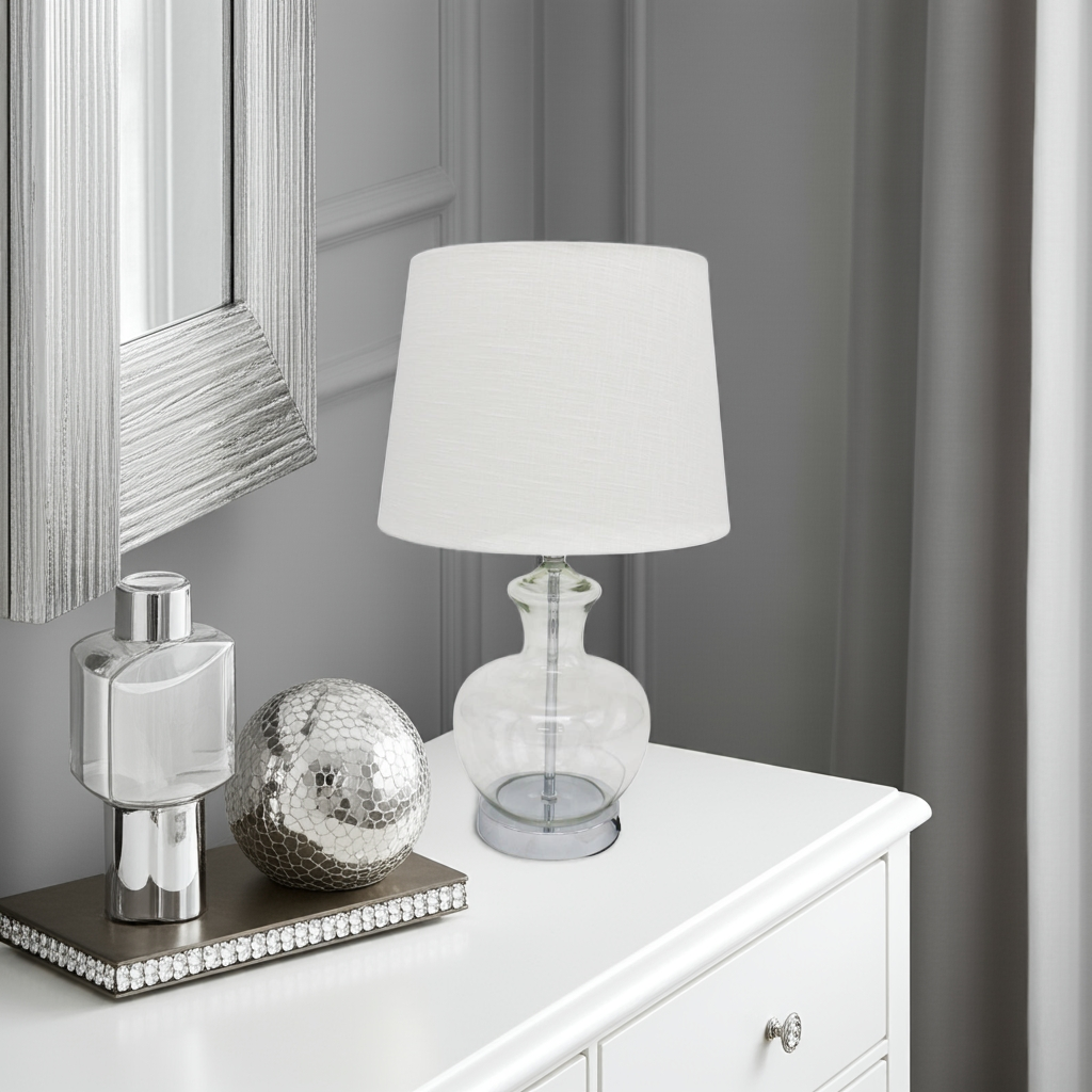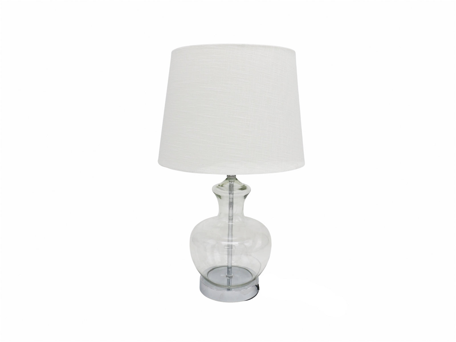 Tischlampe mit antikgoldenem Metallsockel und passendem Lampenschirm aus Baumwolle.