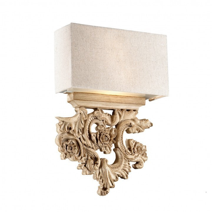 Peter AP2 Wandleuchte mit Leinenschirm. Lampenschirm aus Leinen mit Sockel aus Harz, handgefertigt nach einer originalgetreuen Reproduktion der Holzschnitzerei. Eine hochwertige Lampe!