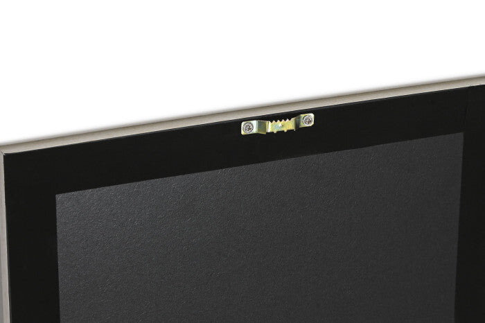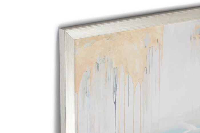 Conjunto 4 Quadros Quadrados Abstratos, com imagens em tons de azul, branco e dourado, com moldura prateada fosca.