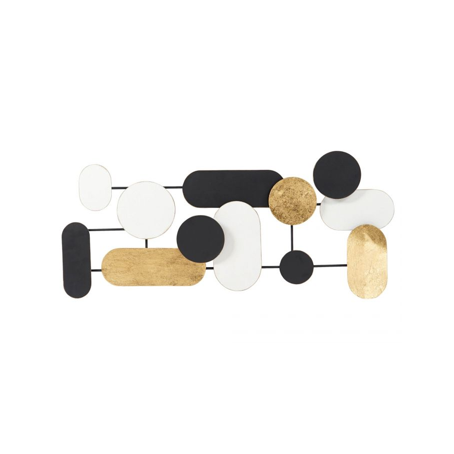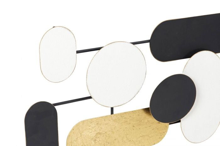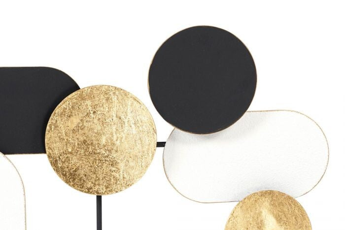 Wanddekoration Kreise und Ovale Weiß Schwarz und Gold. Dekoratives Metallstück mit geometrischen Formen in Gold-, Schwarz- und Weißtönen. Es handelt sich um ein Produkt, das dazu bestimmt ist, einem Eingang, einem Flur, einem Schlafzimmer oder einem Wohnzimmer eine anspruchsvolle und sehr attraktive Note zu verleihen.