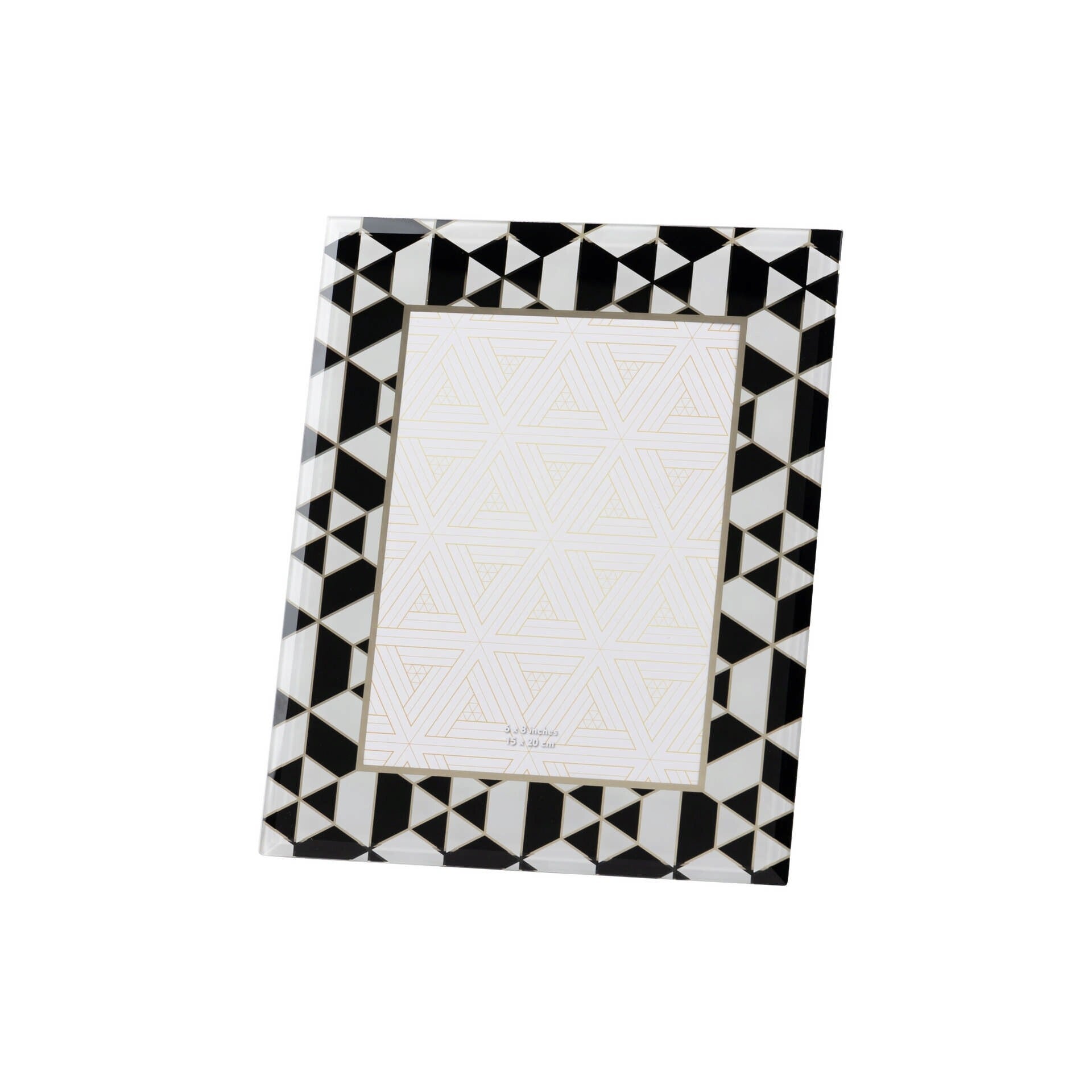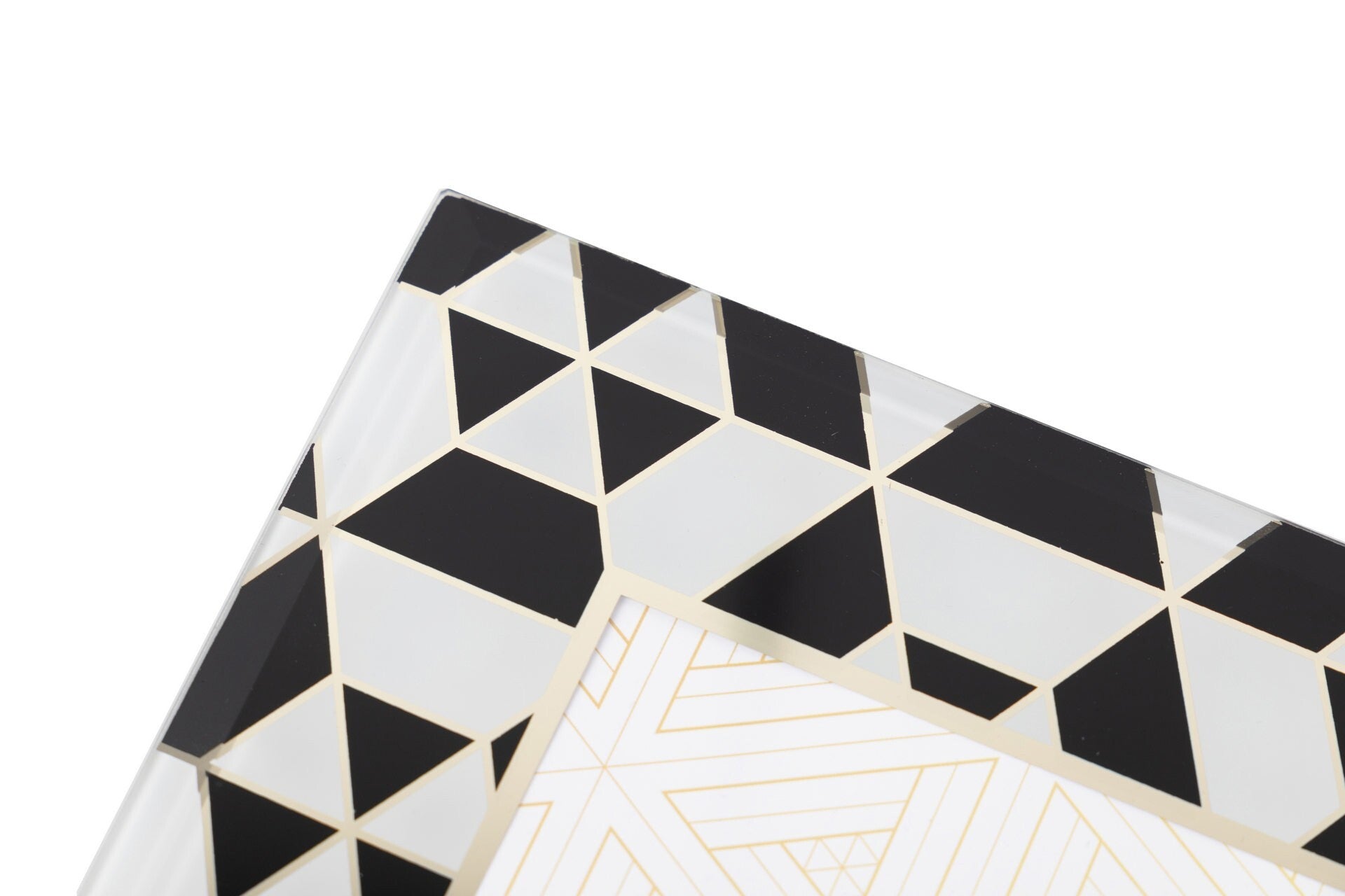 Moldura Larga em vidro, com motivos geométricos pretos em fundo branco, com fina linha em dourado. Nada como relembrar os seus melhores momentos numa fotografia impressa, e por isso moldura tem um design elegante é feita de vidro brilhante branco com motivos em preto e tem uma proteção frontal. É fácil trocar as fotos e pode colocá-la na parede também. Prática e simples, vai sempre manter as suas lembranças favoritas por perto.