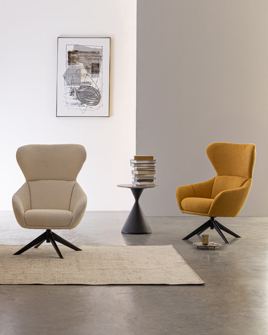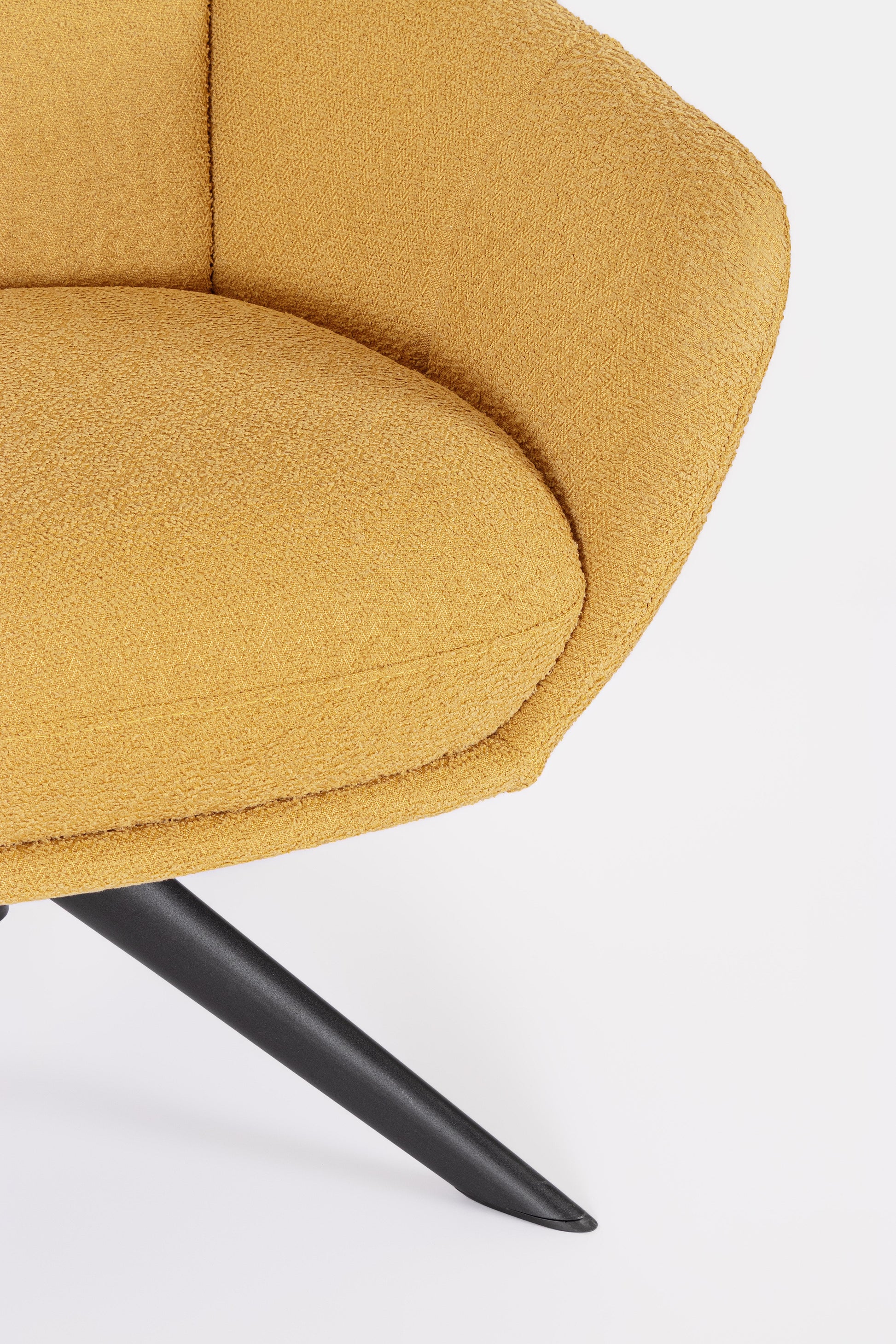 Estrutura e base em aço com acabamento em pó epóxi. Revestimento em poliéster. Acolchoamento em espuma de poliuretano com densidade de 28 kg/m³ no assento e 24 kg/m³ no encosto. Assento giratório 360°.