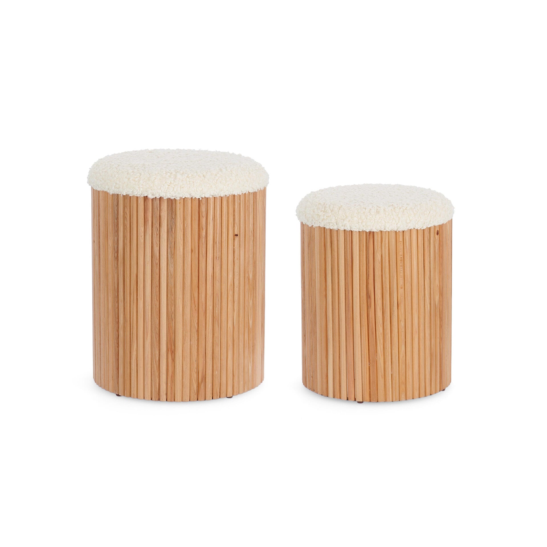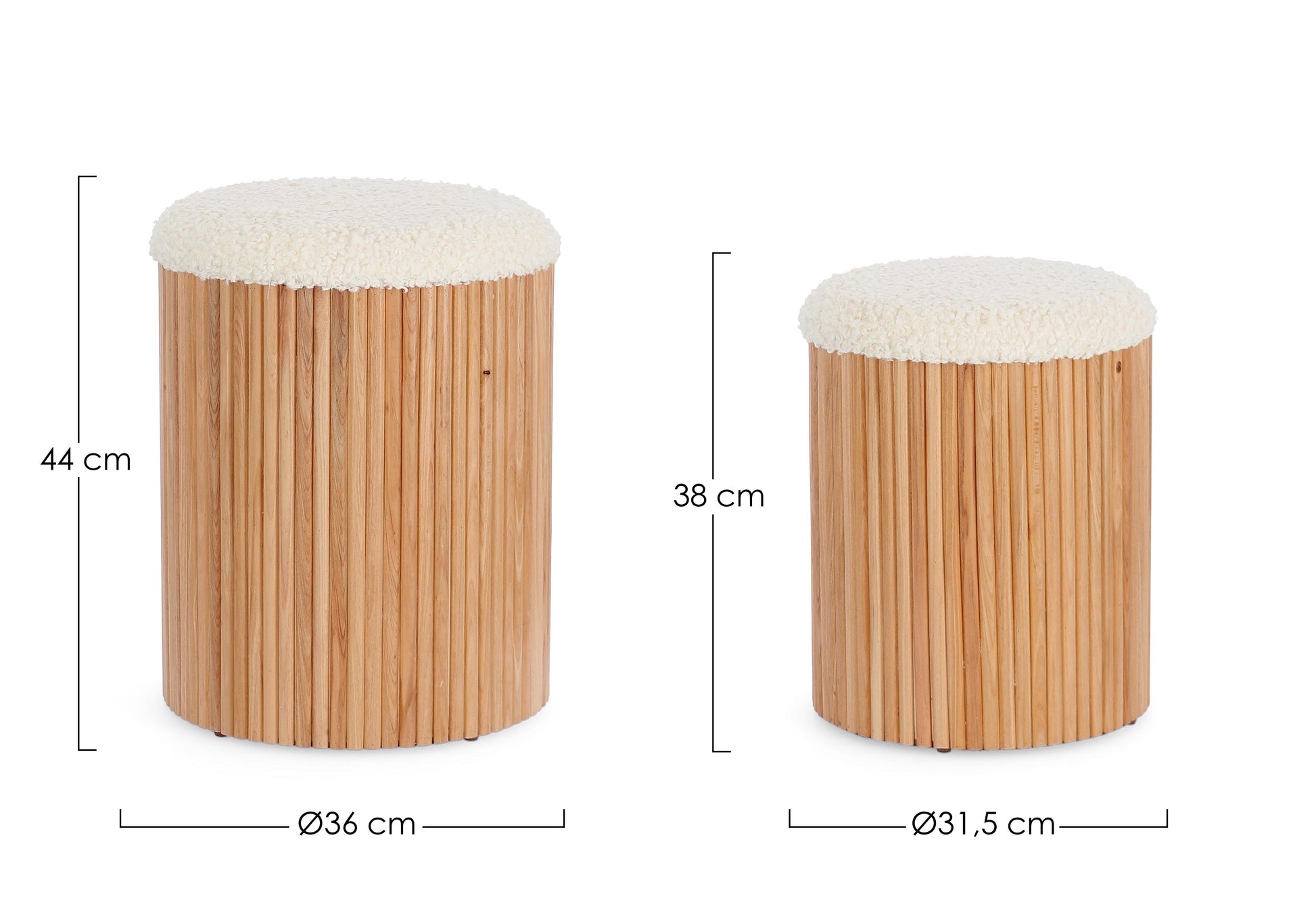 Disponível em dois tamanhos — pequeno (38 cm de altura, Ø 31.5 cm) e grande (44 cm de altura, Ø 36 cm) — adapta-se perfeitamente ao seu espaço e às suas necessidades. É fabricado com estrutura em MDF, revestido em poliéster bouclé e acabamento em madeira de pinho, e chega até si pronto a usar — sem montagem, sem complicações.