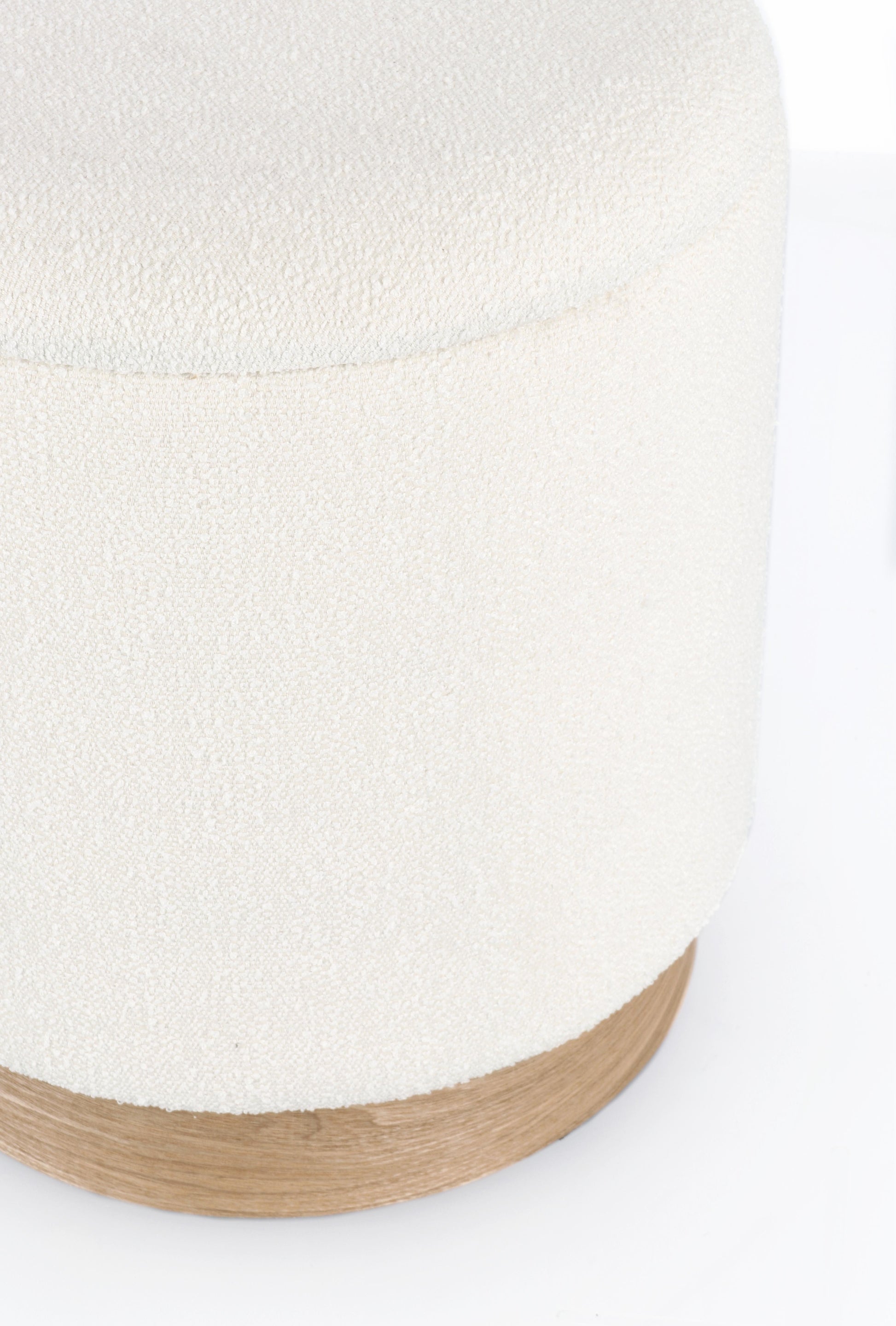 Estrutura MDF, poliester bouclé, madeira. Branco e cor natural de madeira.