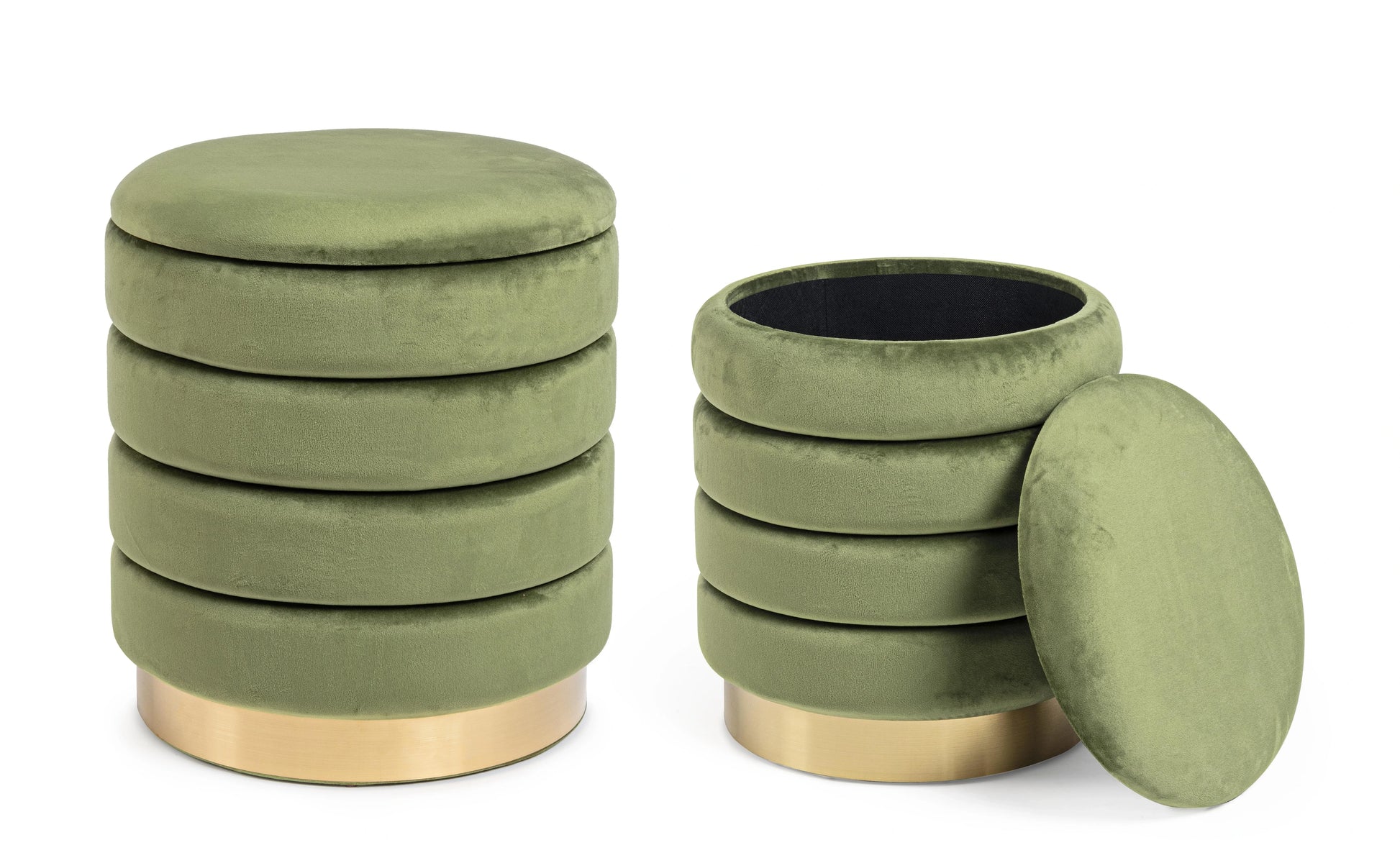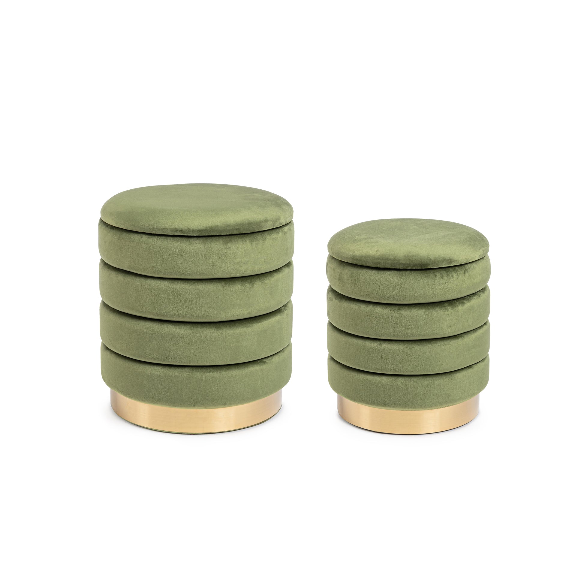 Conjunto de 2 Pufes Darina, estofado em veludo, com pé em metal dourado. Com arrumação, ideal para a entrada, quarto ou sala.