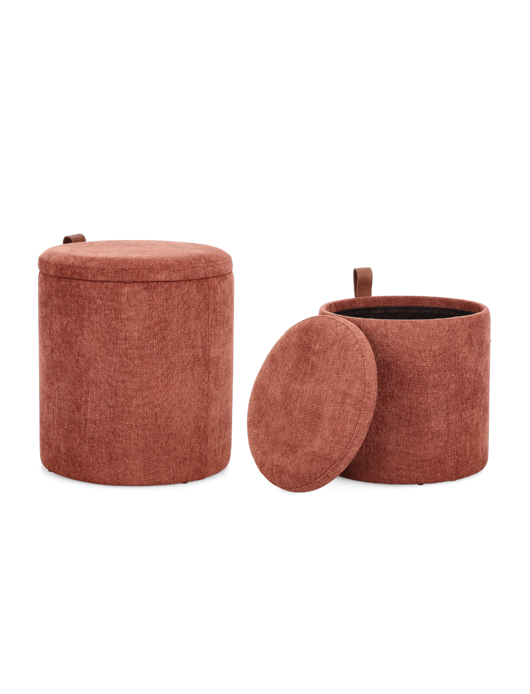Os Pufes Katia com arrumação, 2 uni. são a resposta perfeita. Estofados na cor terracota, trazem calor, personalidade e estilo a qualquer divisão. Para além de bonitos, são incrivelmente práticos: oferecem espaço interior generoso para guardar sapatos, mantas, revistas, brinquedos ou tudo o que quiser manter fora de vista, mas sempre por perto.