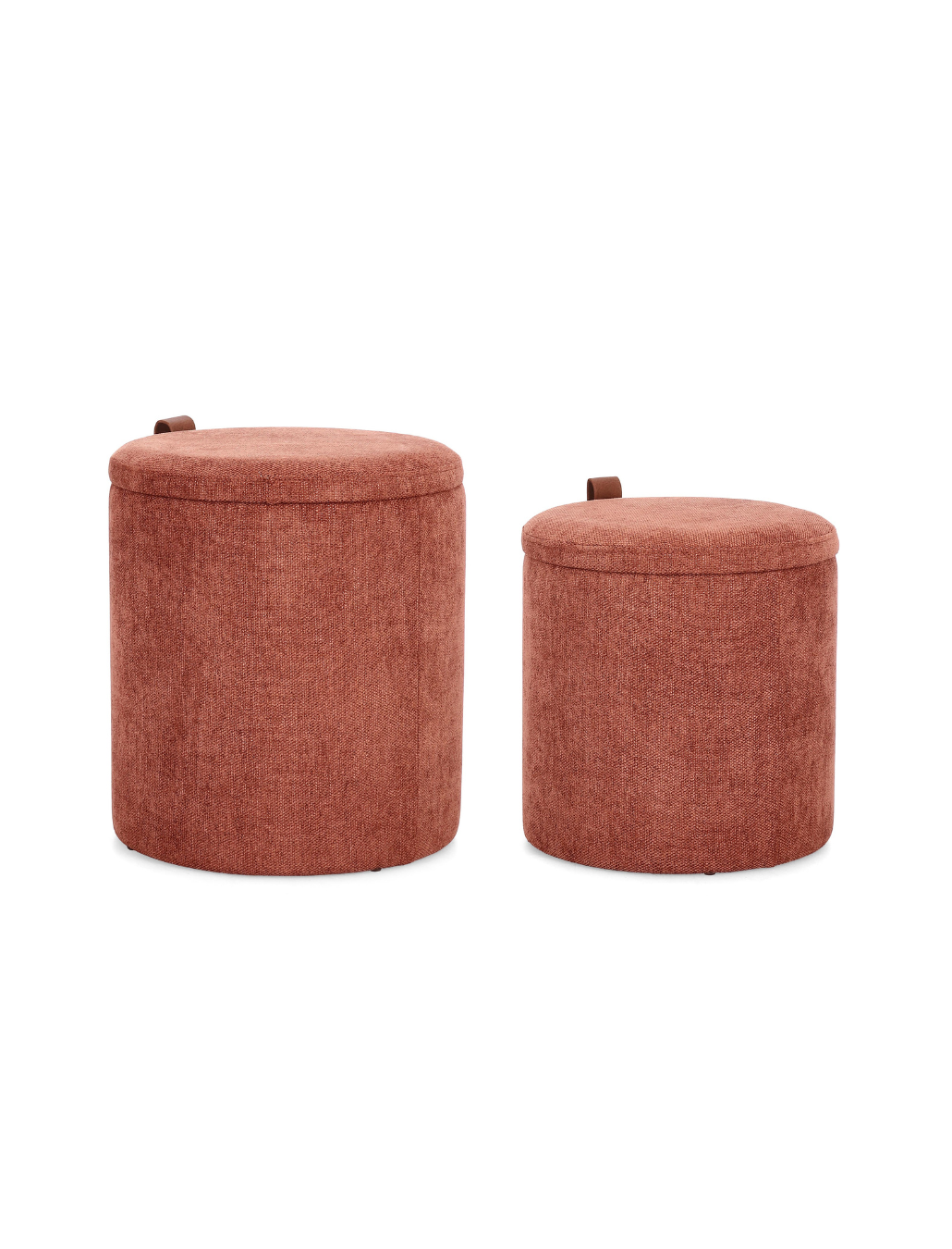 Com dois tamanhos — o mais pequeno com 36 cm de altura e Ø 34,5 cm, e o maior com 44 cm de altura e Ø 39 cm — adaptam-se facilmente ao hall de entrada, à sala ou ao quarto. O tecido em poliéster tem um toque macio e confortável, enquanto a alça decorativa em napa acrescenta um detalhe elegante. A estrutura em MDF garante resistência, e o conjunto chega pronto a usar, sem precisar de montagem.