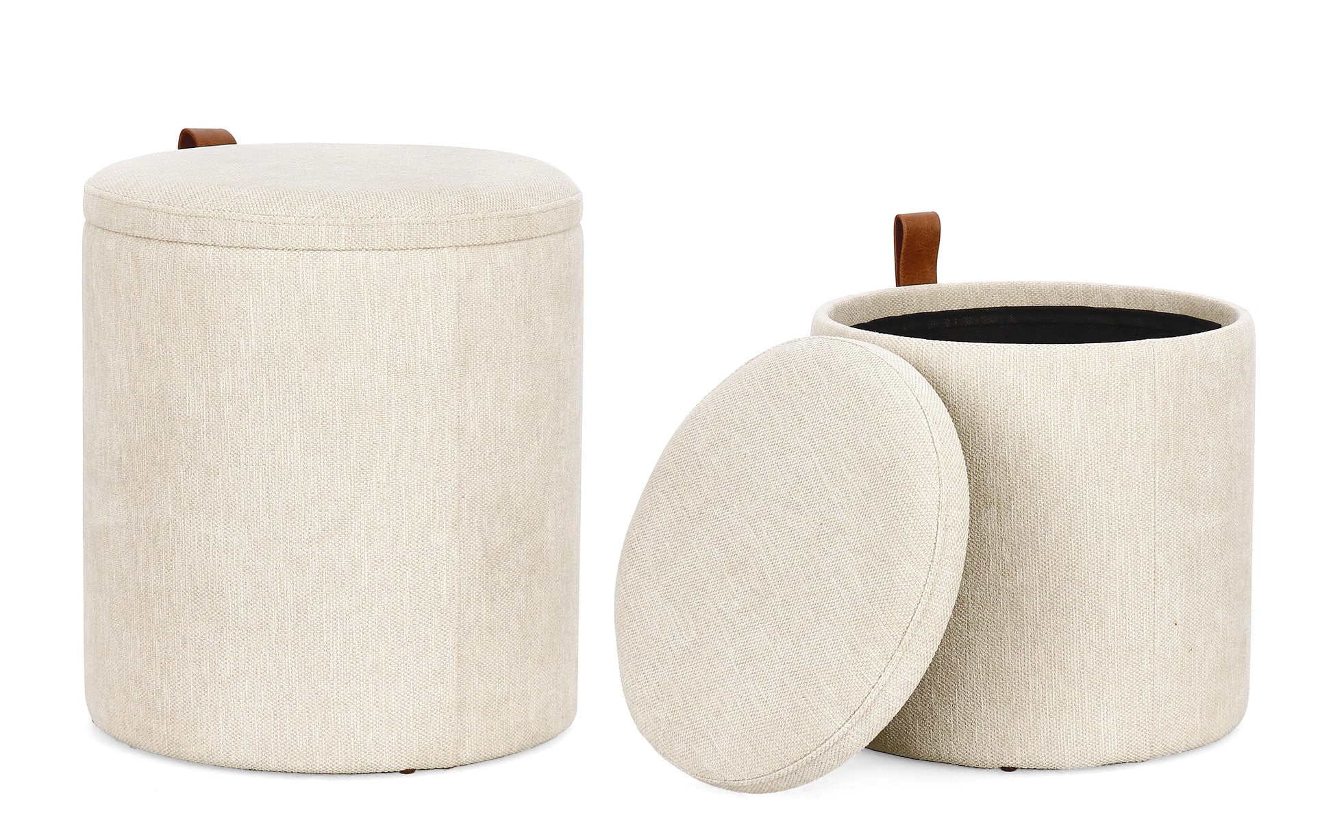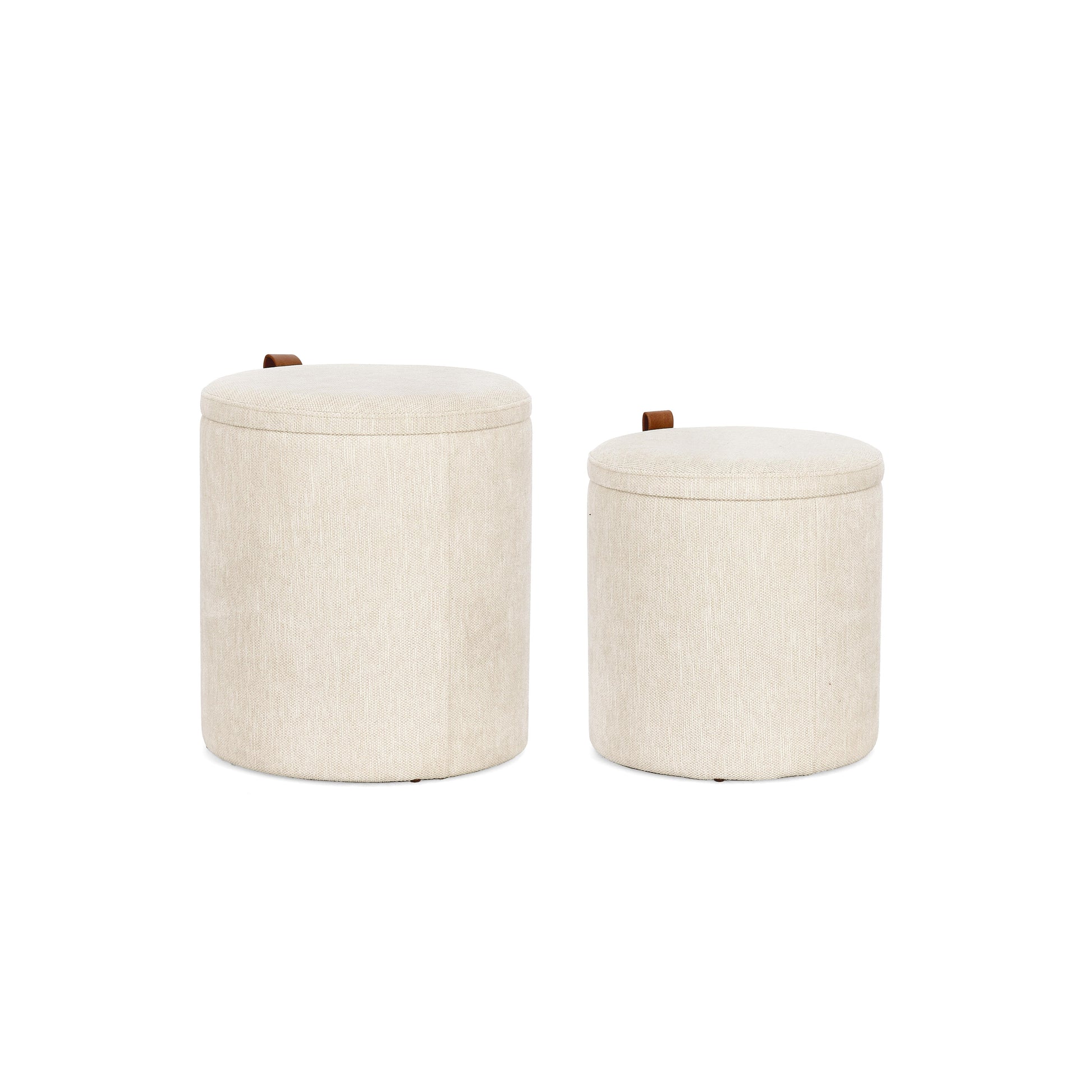 Com dois tamanhos — o mais pequeno com 36 cm de altura e Ø 34,5 cm, e o maior com 44 cm de altura e Ø 39 cm — adaptam-se facilmente ao hall de entrada, à sala ou ao quarto. O tecido em poliéster tem um toque macio e confortável, enquanto a alça decorativa em napa acrescenta um detalhe elegante. A estrutura em MDF garante resistência, e o conjunto chega pronto a usar, sem precisar de montagem.