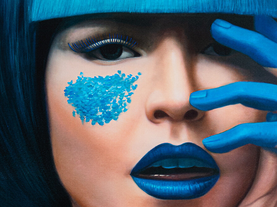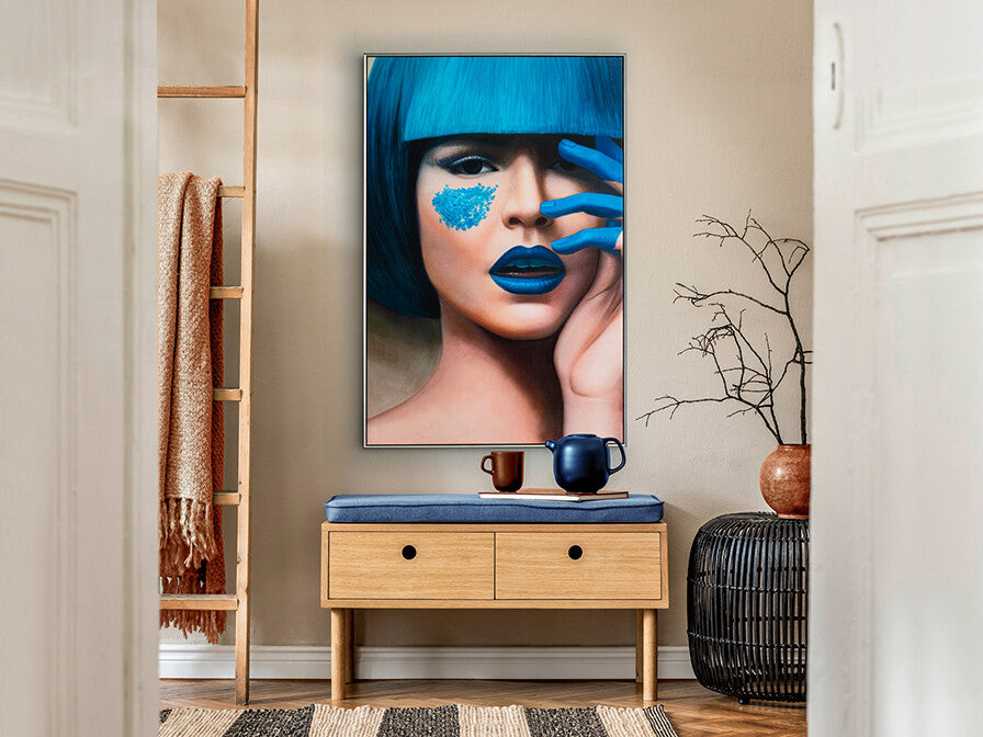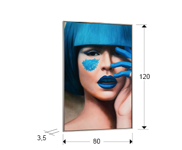 Tela estampada de rosto feminino. Moldura com acabamento em preto e prata brilhante.