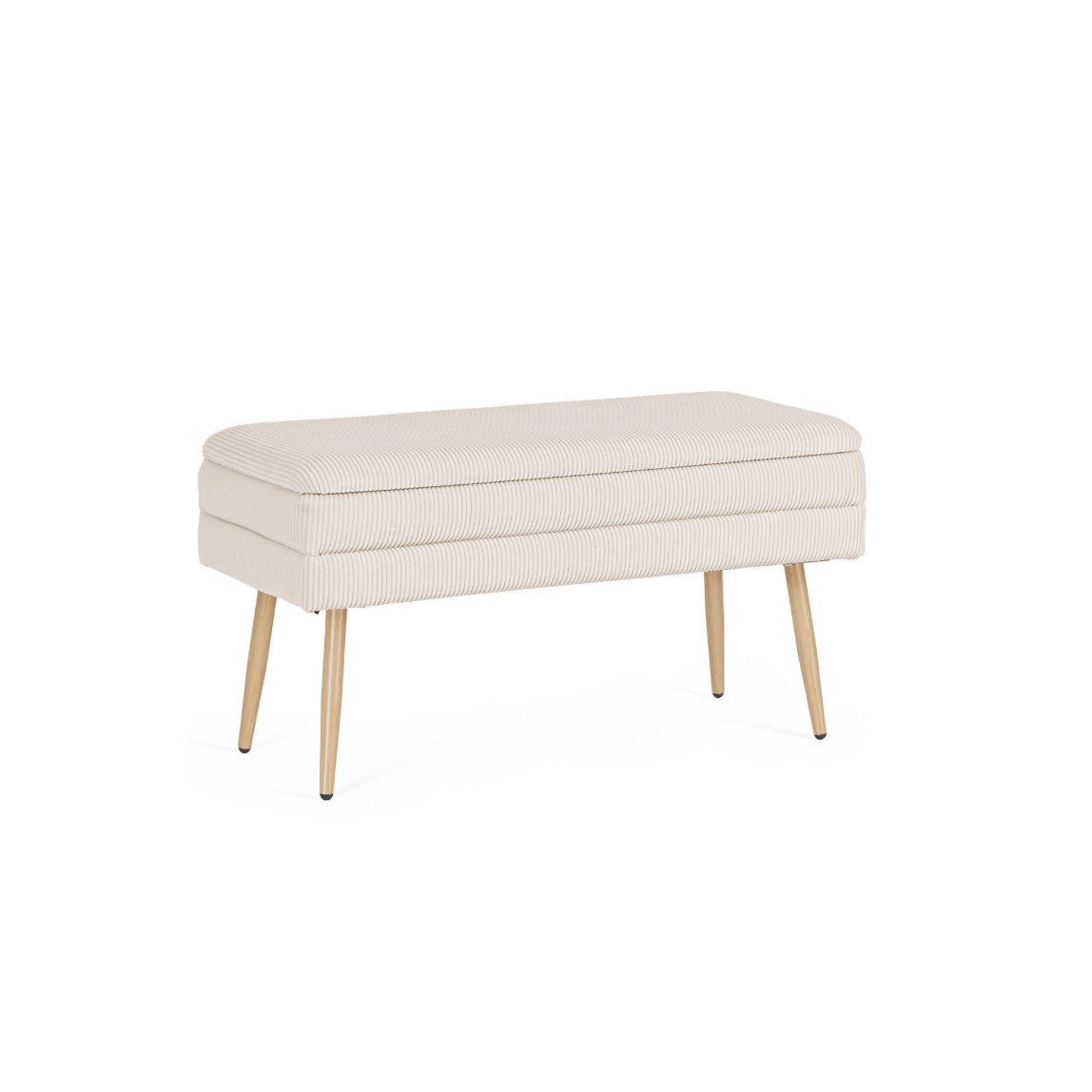 O compartimento de arrumação integrado permite guardar mantas, almofadas, sapatos, brinquedos ou outros objetos do dia a dia, ajudando a manter o espaço organizado. As pernas em aço com efeito madeira conferem estabilidade, resistência e um toque acolhedor ao conjunto.