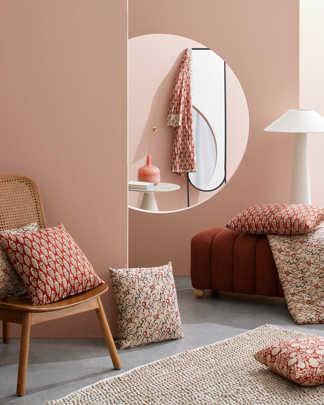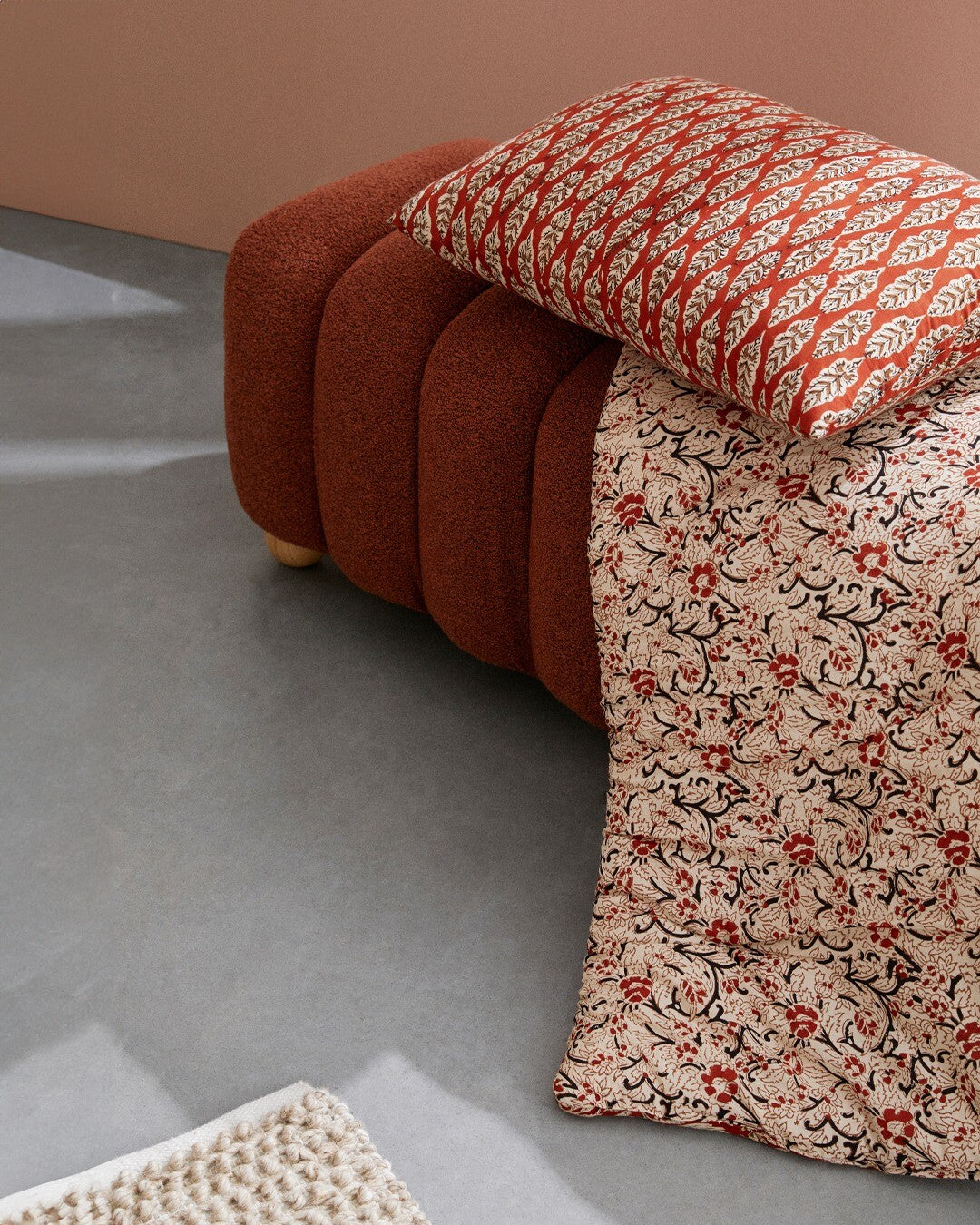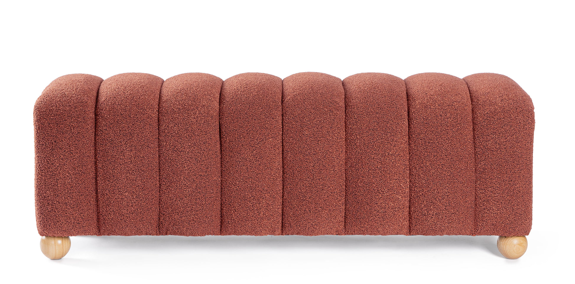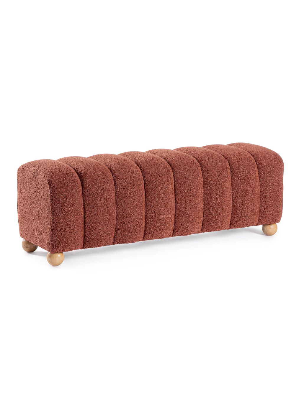 Está disponível em duas cores irresistíveis — o clássico branco e o quente e moderno tijolo/terracota — para que possa escolher o tom que melhor combina com a sua decoração. O revestimento em tecido bouclé confere-lhe um toque macio e sofisticado, enquanto os pés em madeira de seringueira acrescentam um acabamento natural que nunca sai de moda.