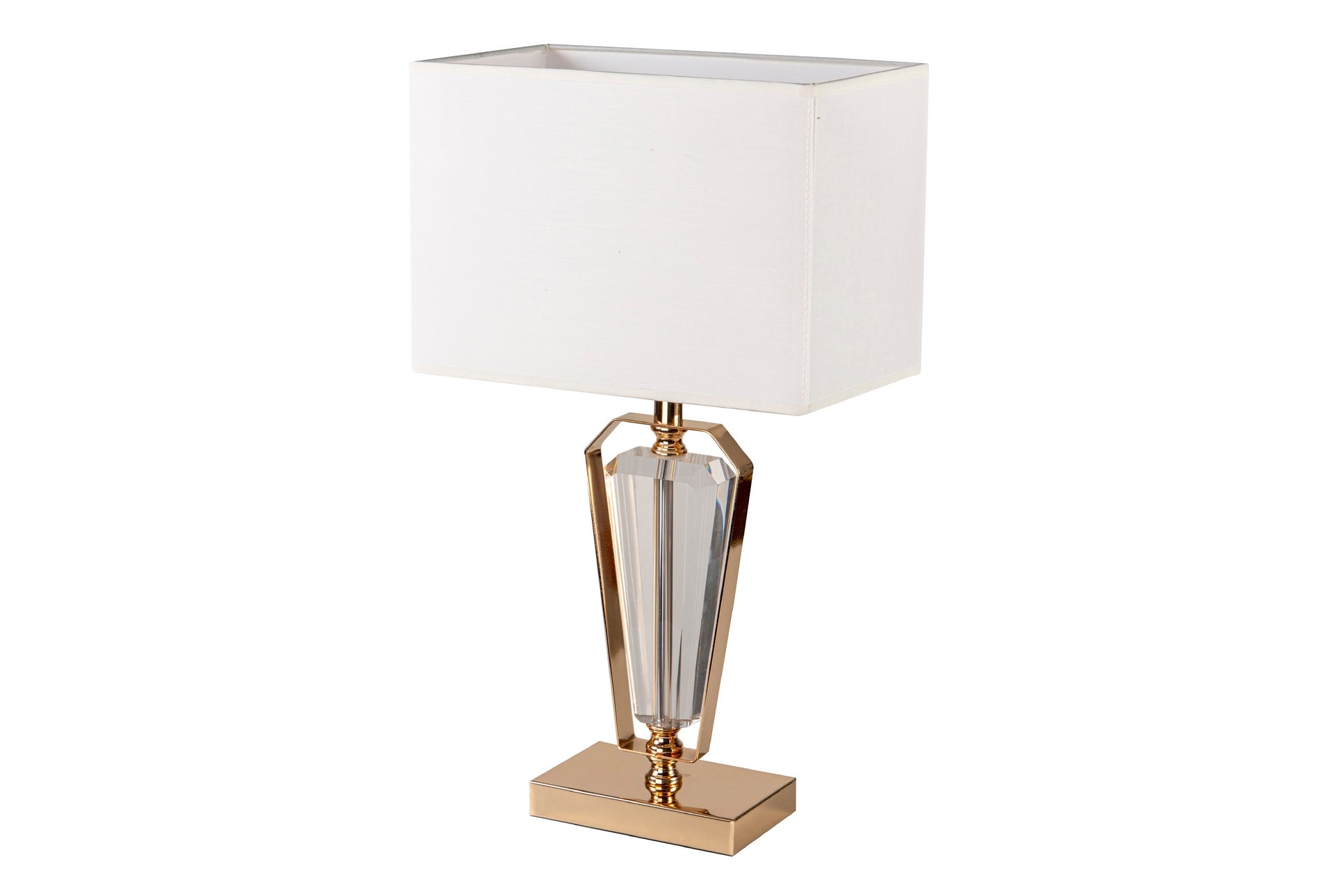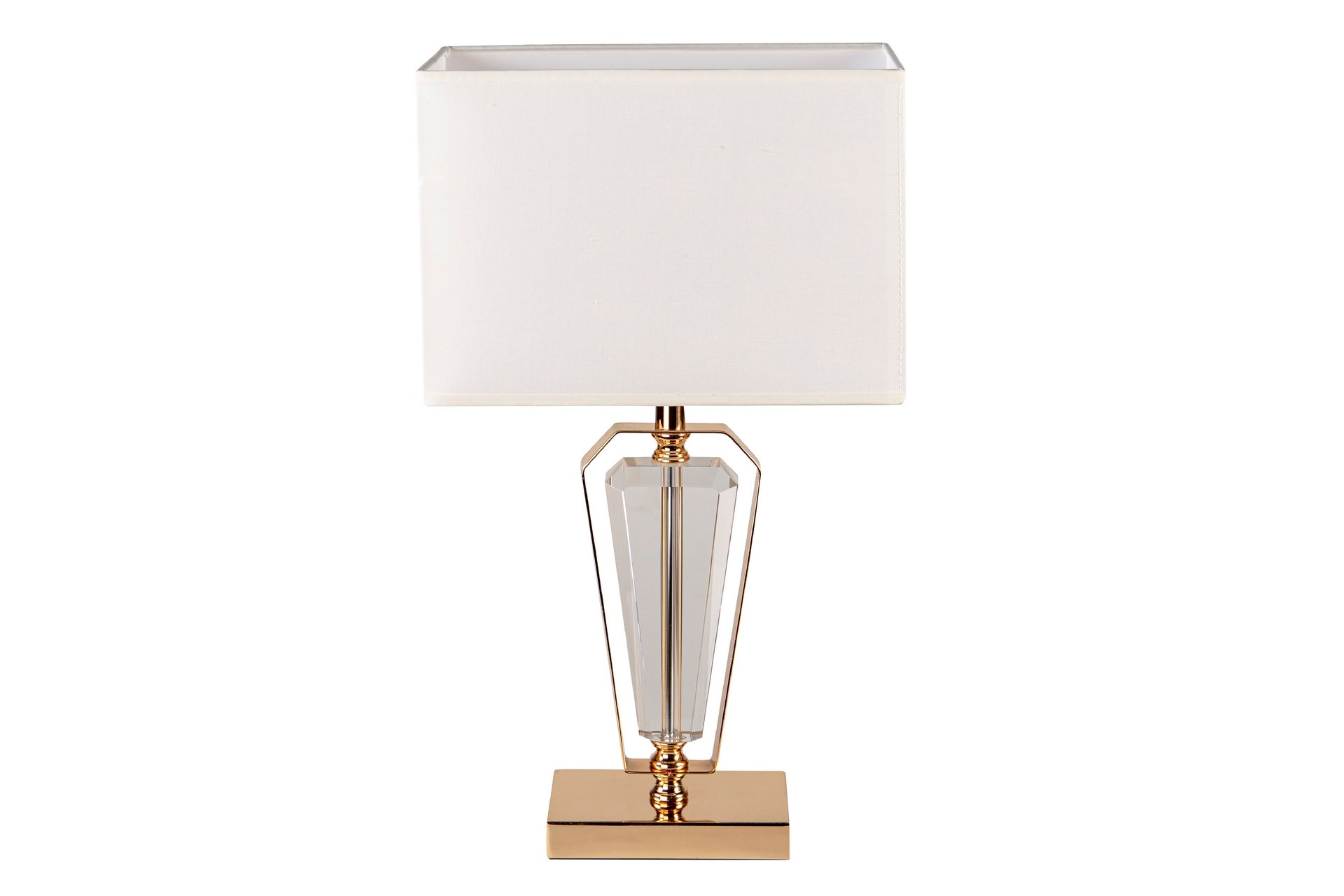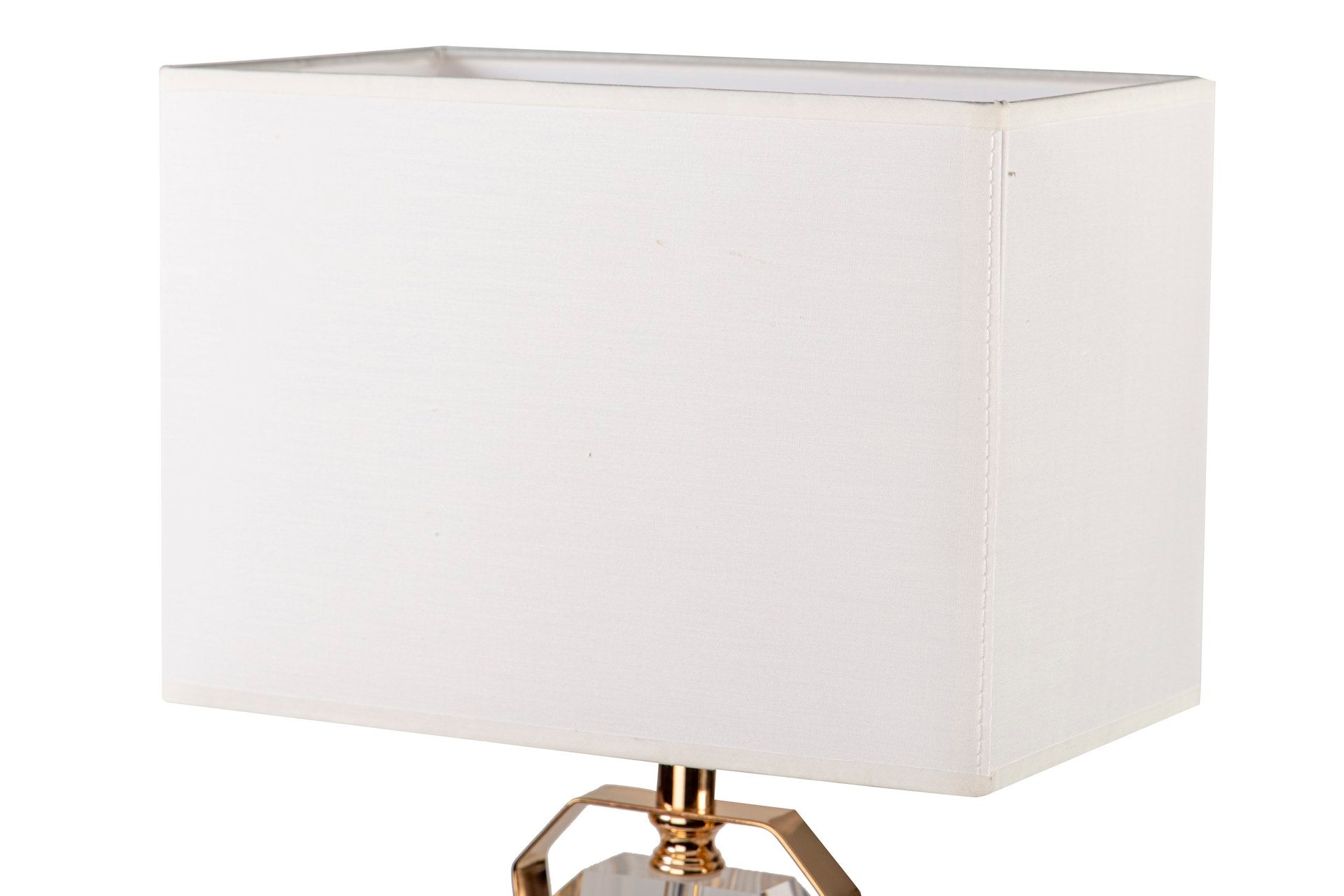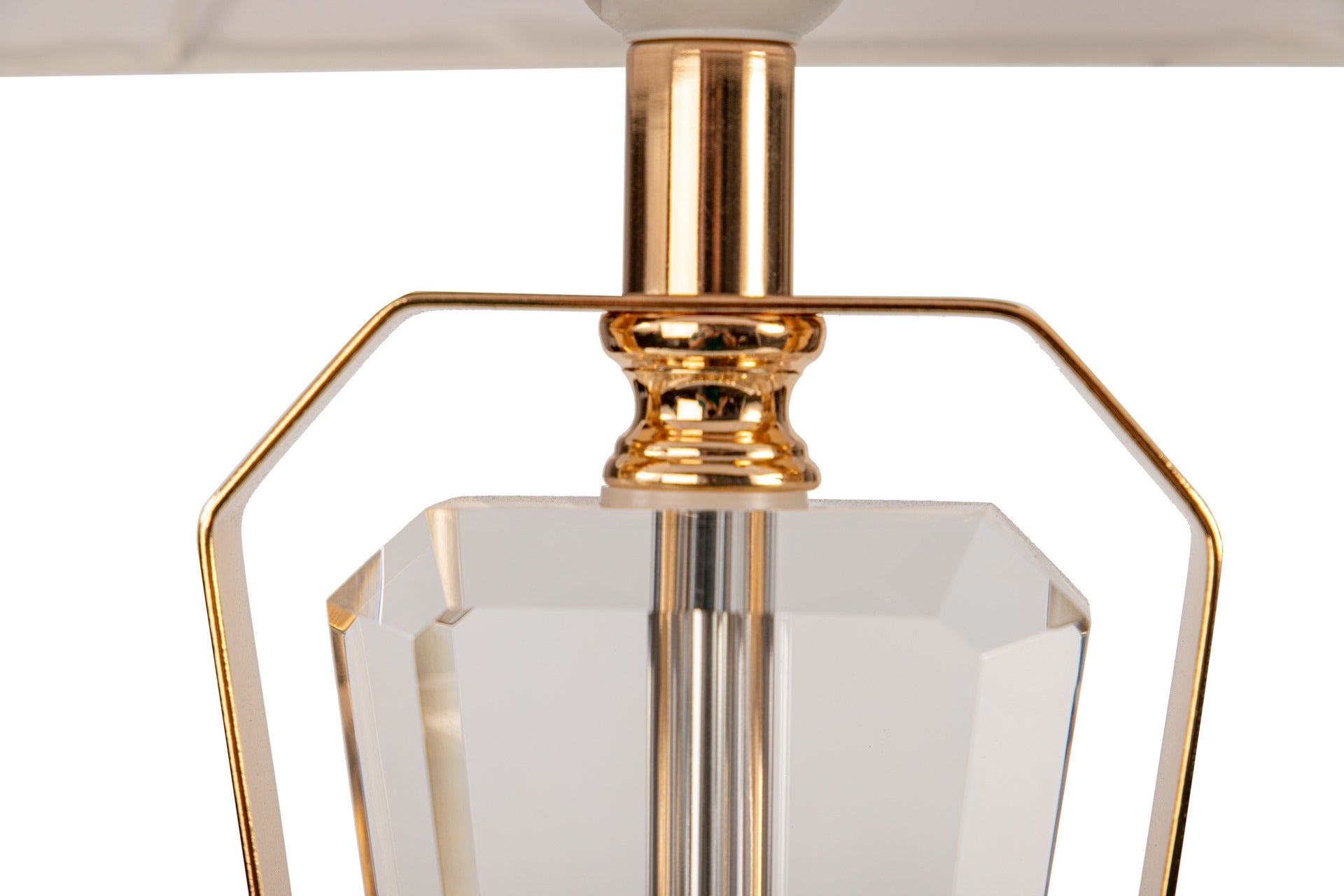 Candeeiro de mesa, base de cor dourada e vidro transparente com abajur branco incluído.