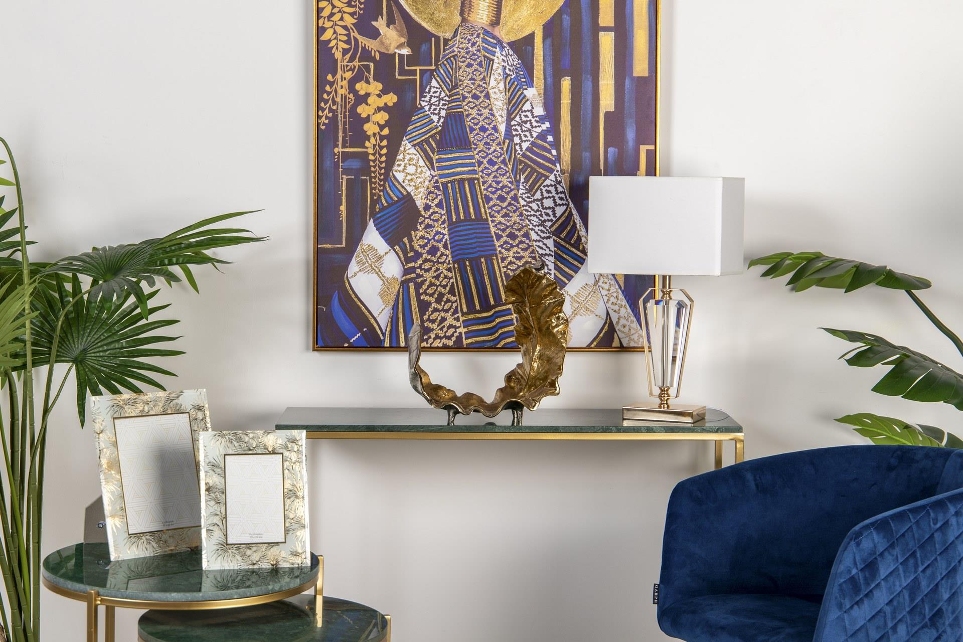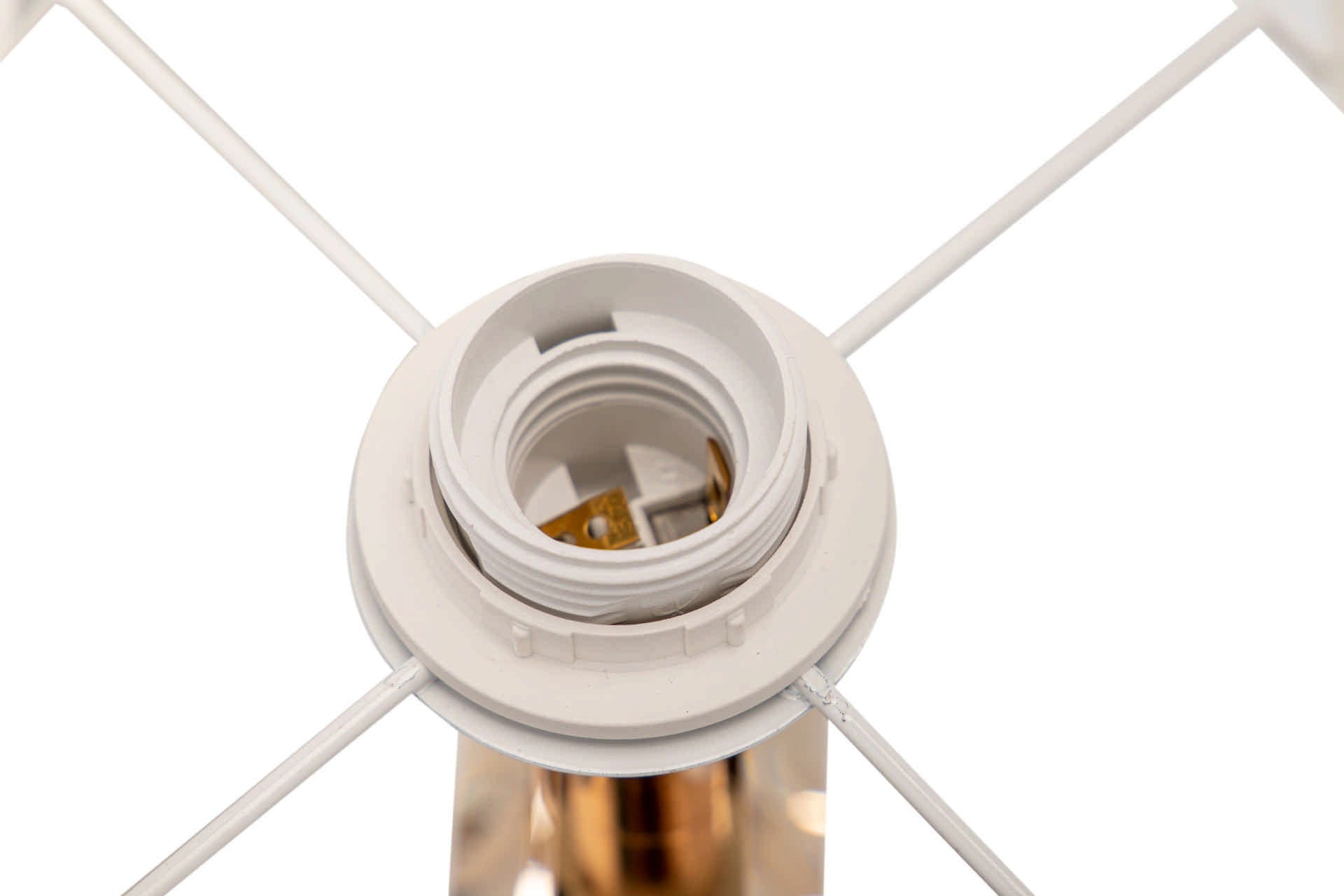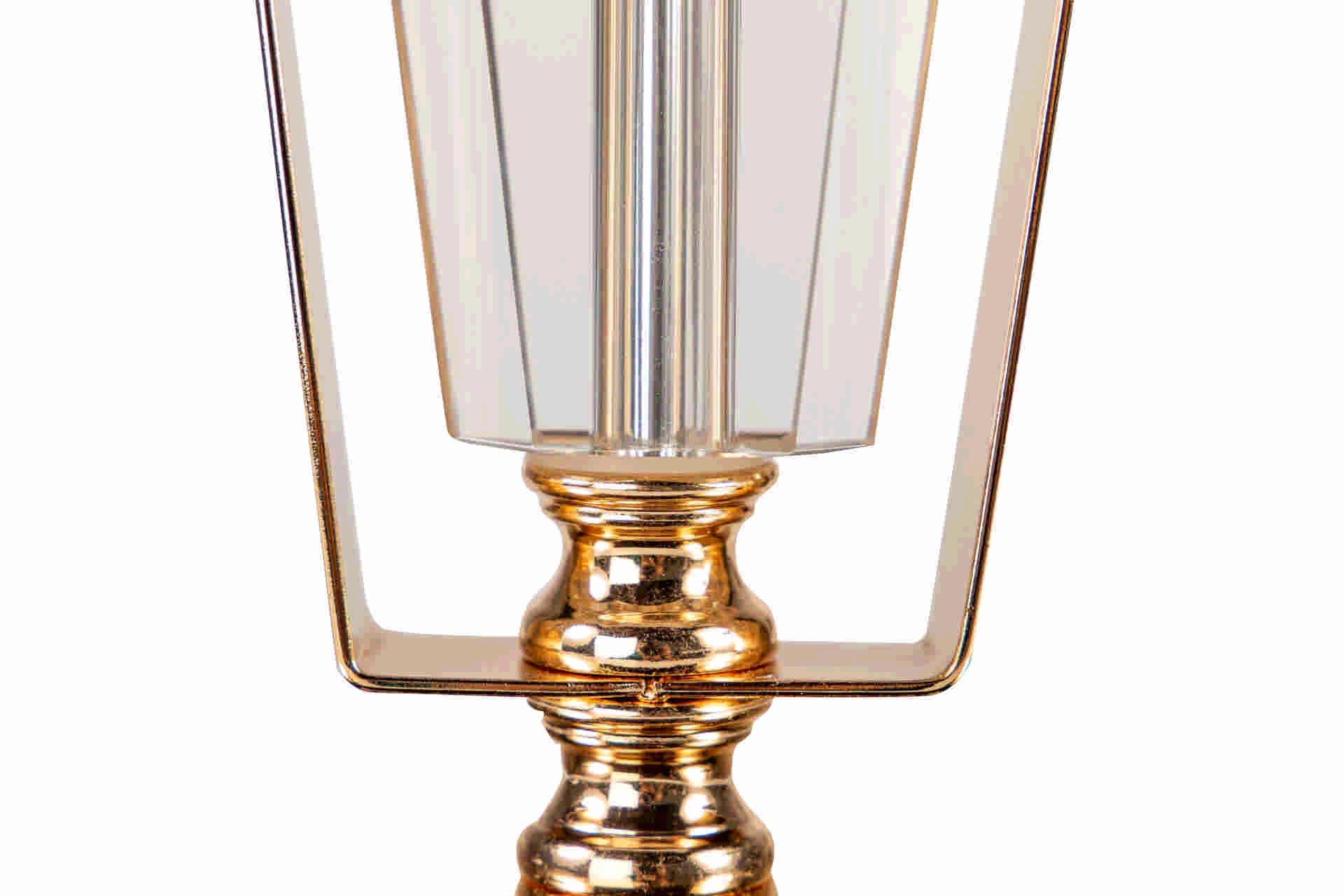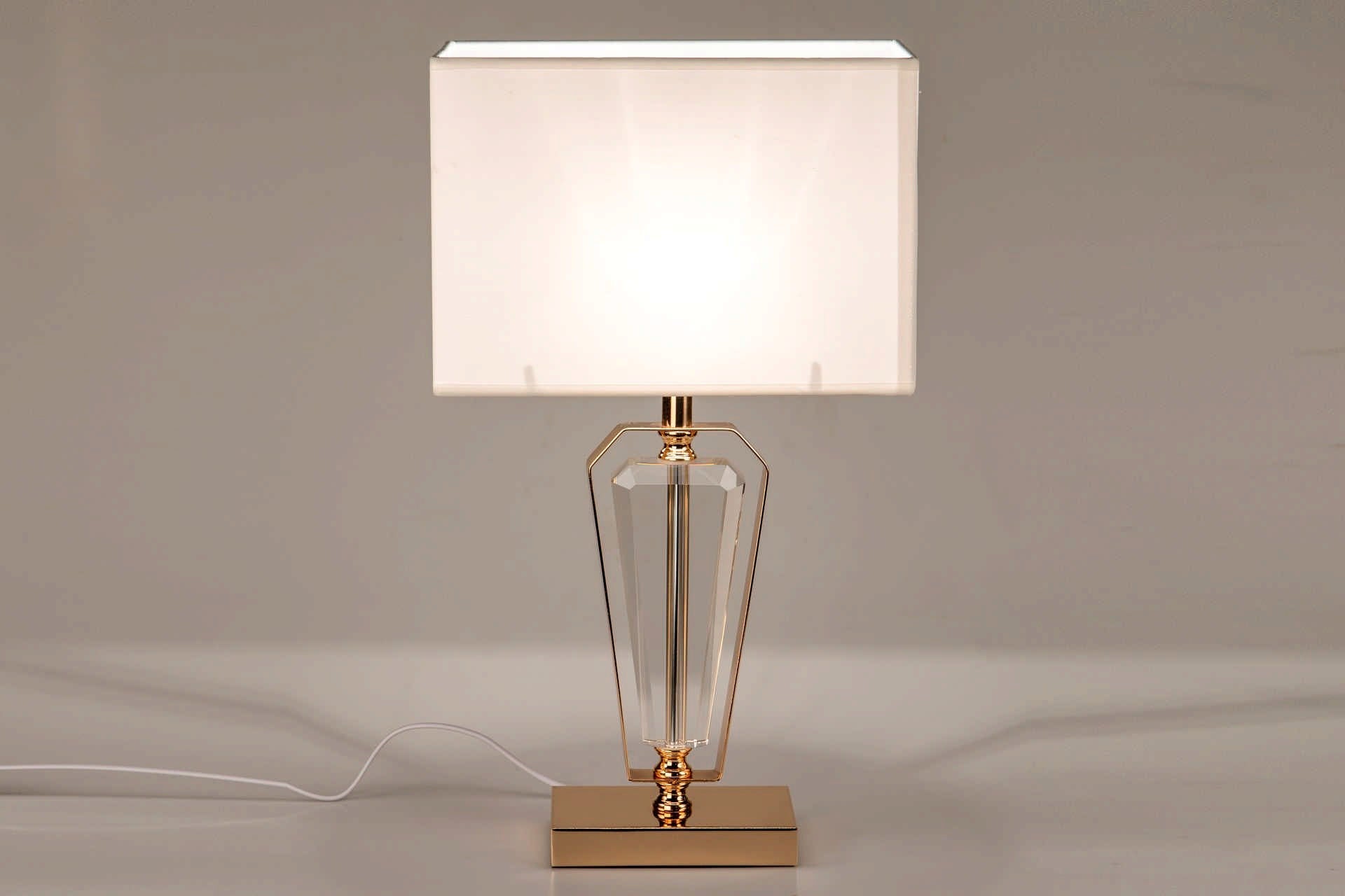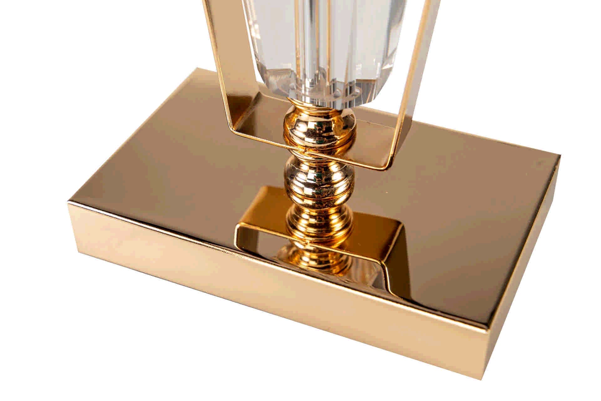 Candeeiro de mesa, base de cor dourada e vidro transparente com abajur branco incluído.