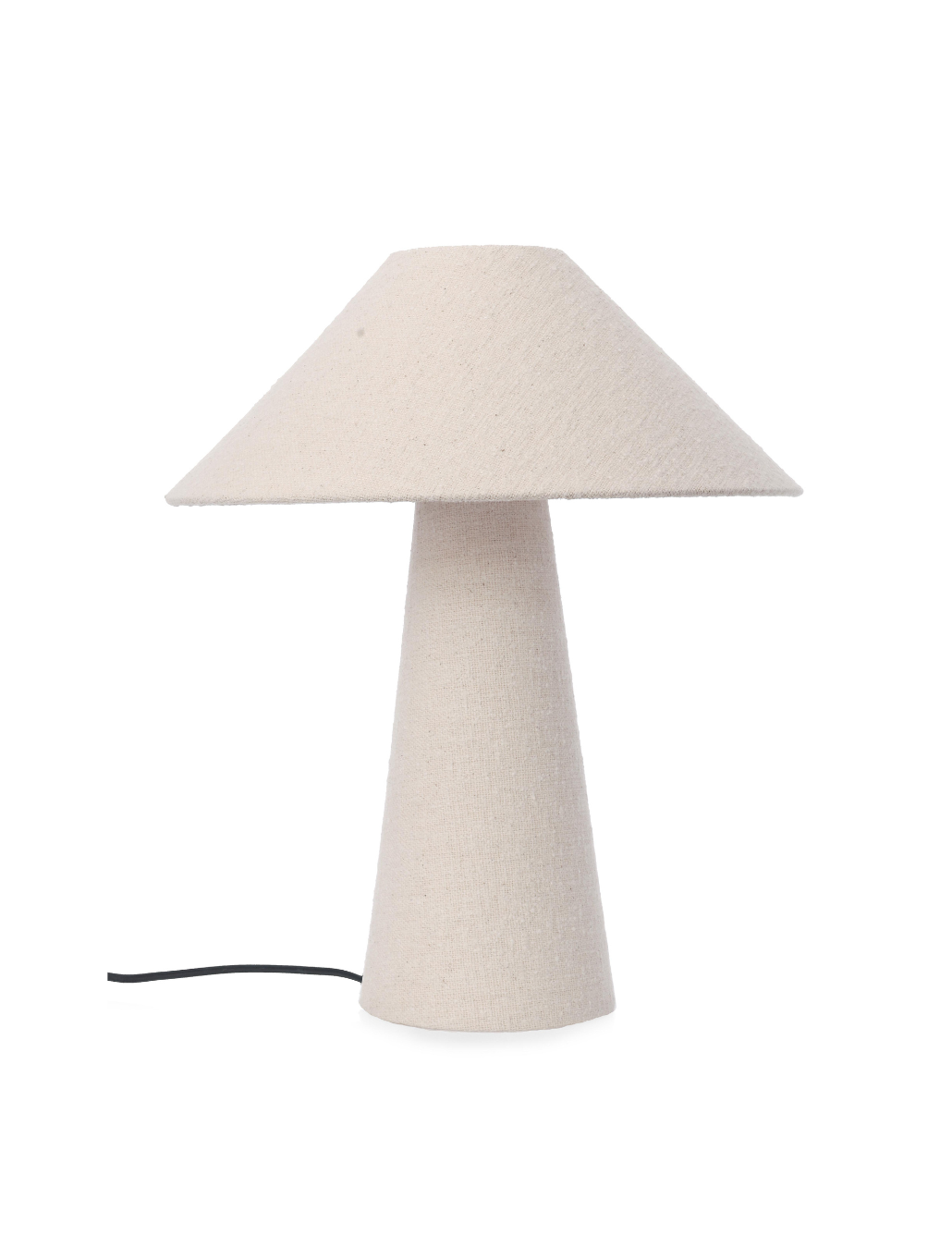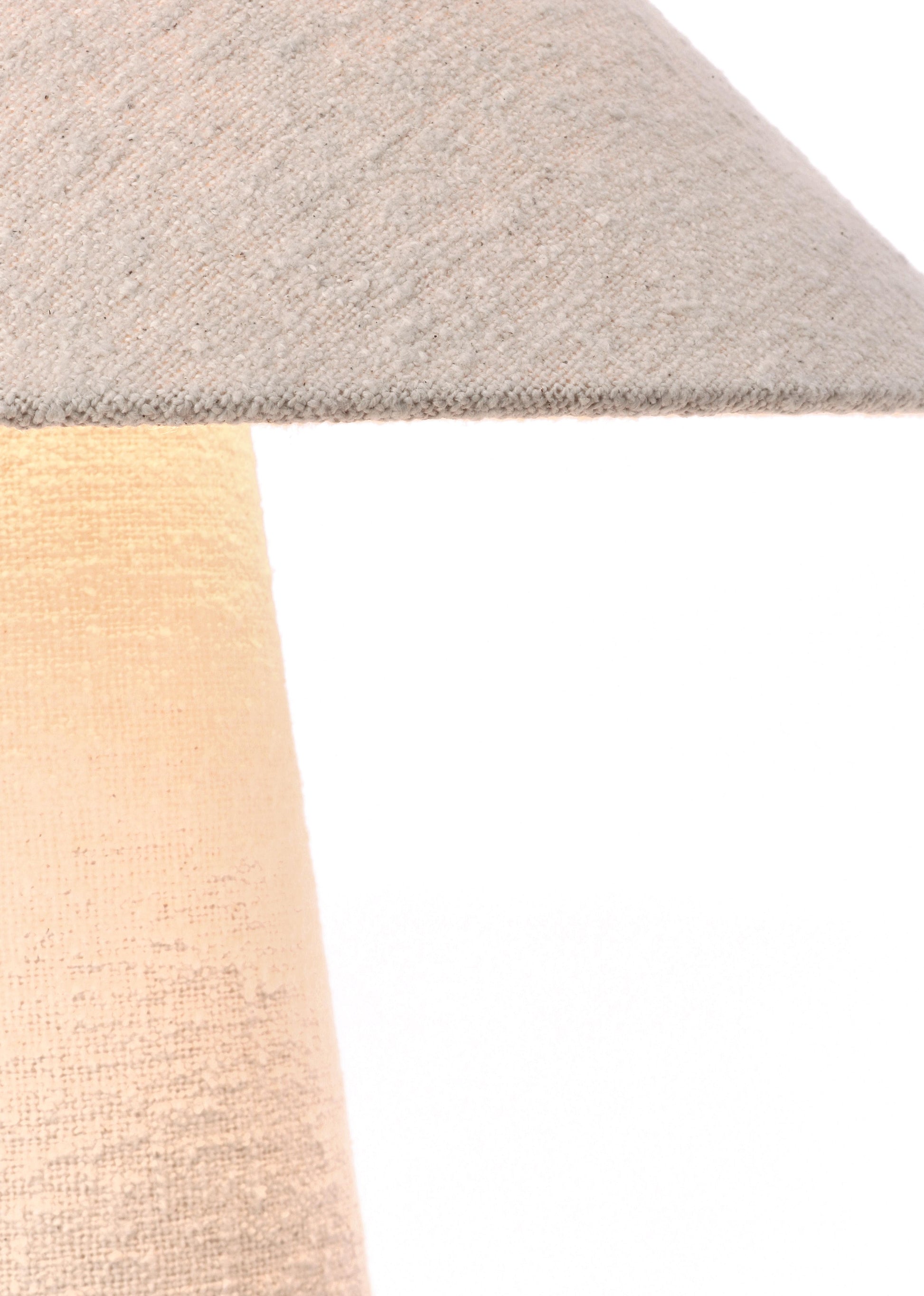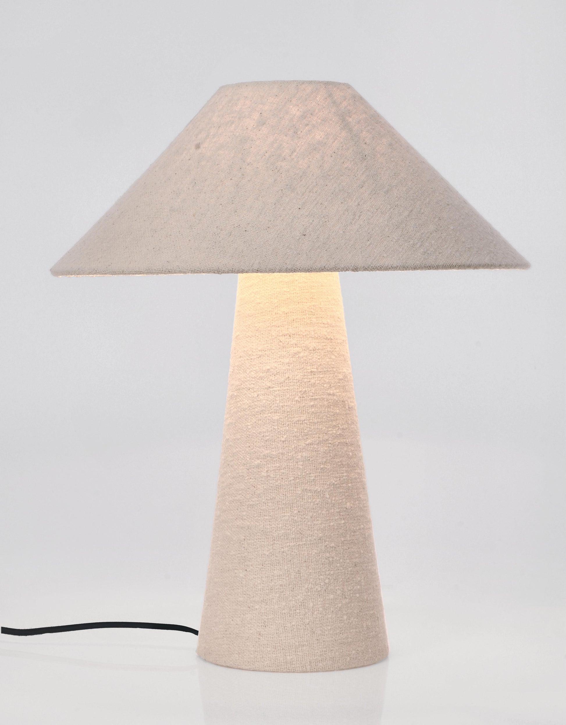Candeeiro de mesa da coleção Lamki. Forrado em tecido bouclé bege, estrutura de poliestereno e metal. O candeeiro de mesa Lamki combina elegância e suavidade num design contemporâneo que se destaca pela sua simplicidade e capacidade de trazer calor a qualquer ambiente. A sua base e abajur de tecido permite uma difusão suave e envolvente da luz.