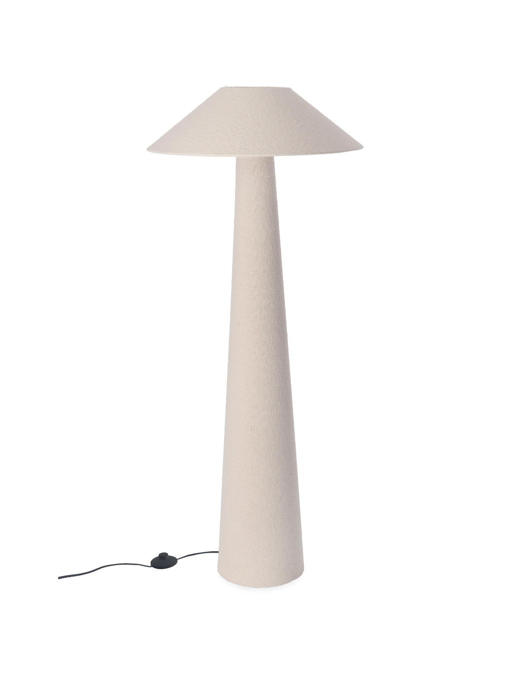 Candeeiro de pé da coleção Lamki. Forrado em tecido bouclé bege, estrutura de poliestireno e metal. O candeeiro de pé Lamki combina elegância e suavidade num design contemporâneo que se destaca pela sua simplicidade e capacidade de trazer calor a qualquer ambiente. A sua base e abajur de tecido permite uma difusão suave e envolvente da luz.