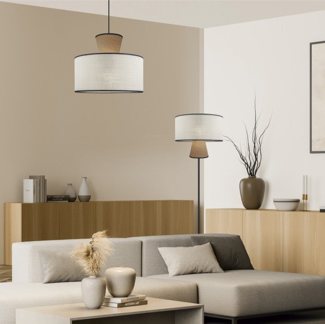 Candeeiro de pé da Coleção Selma. Pé de metal em acabamento preto com abajur de várias tonalidade de tecido, mostrando uma estética interessante de dois tons com um design muito original. Em acabamentos bege e bronzeado, finalizado com uma fita preta.