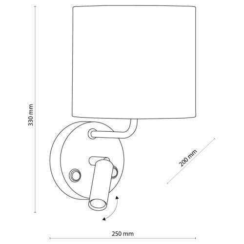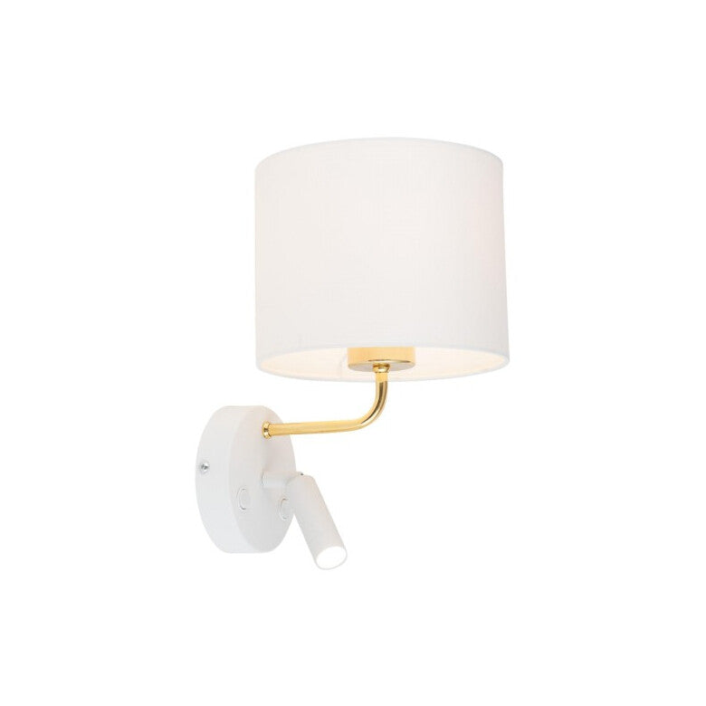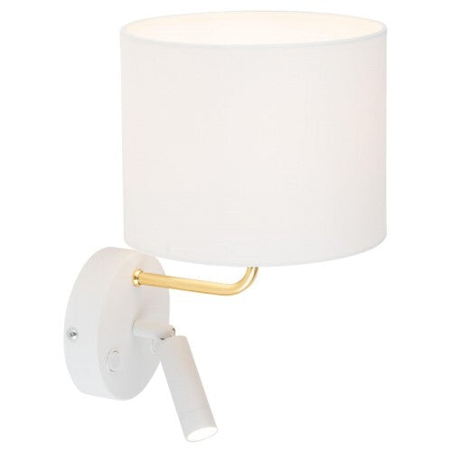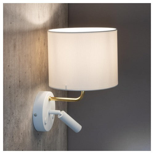 Candeeiro de parede moderno com design elegante, feito de uma base de metal redonda de cor branca com um braço de cor de latão e uma projetor de metal ajustável adicional com abajur têxtil cilíndrico de cor branca. Uma proposta original para a iluminação interior da sua sala, quarto, hotel e restaurante.