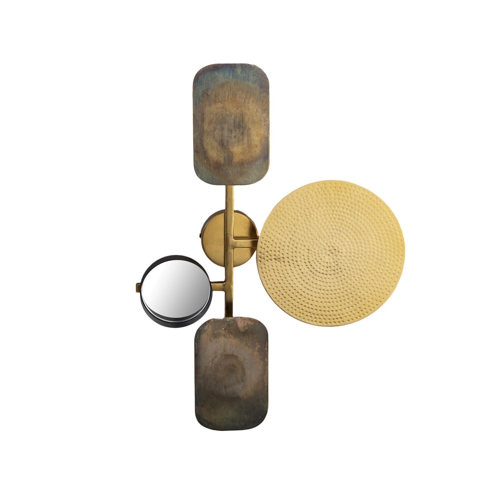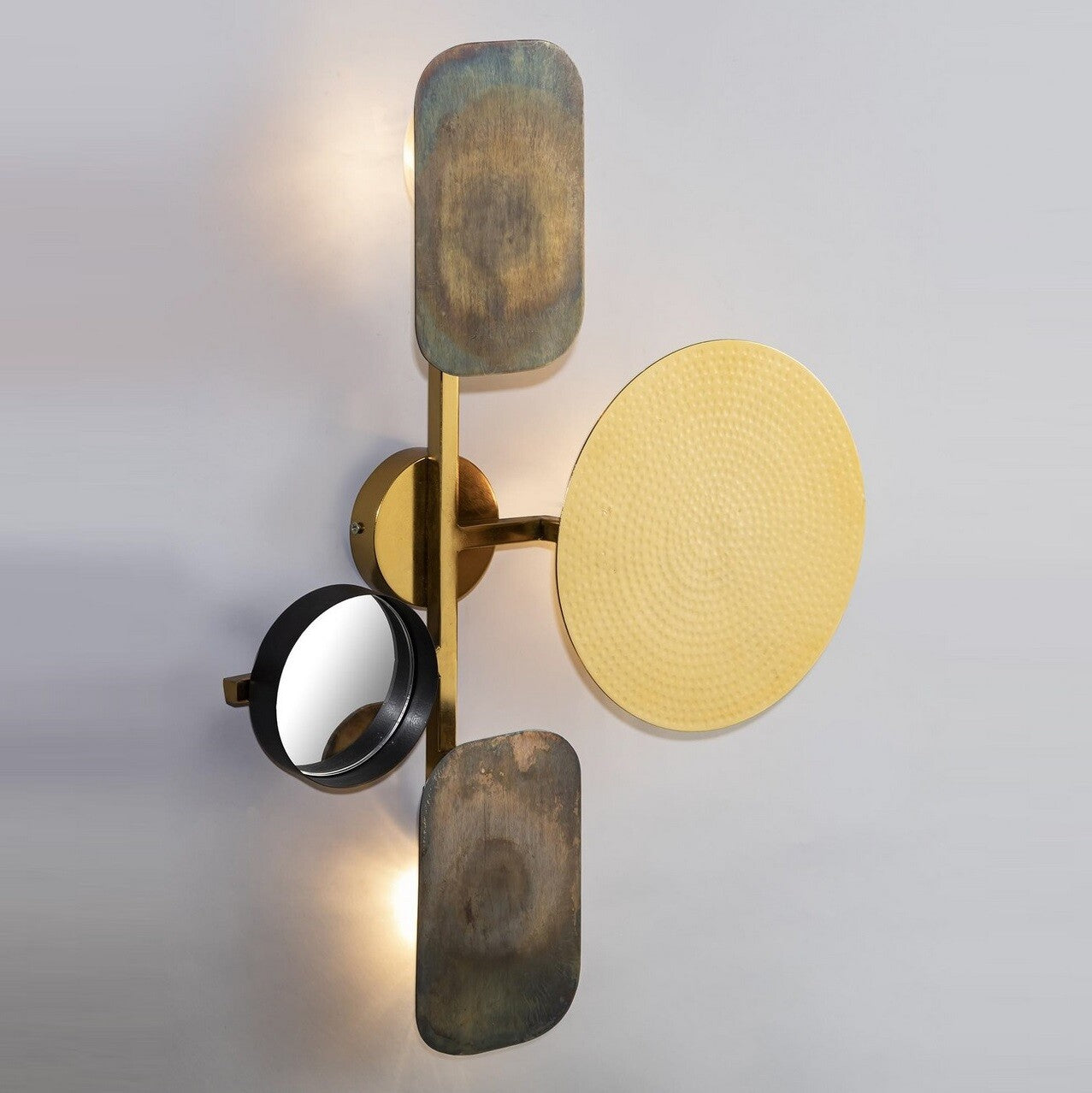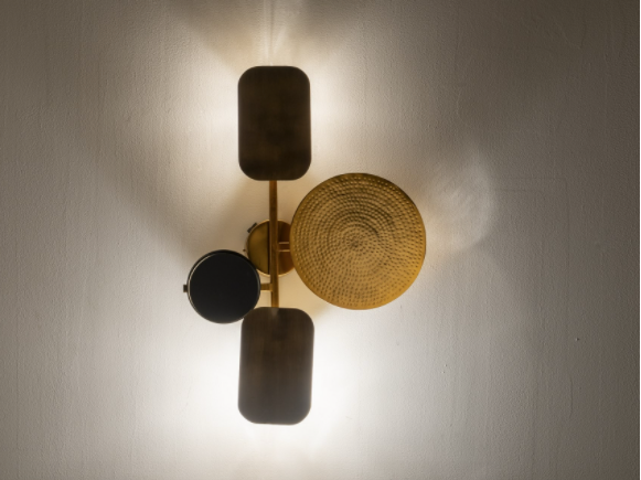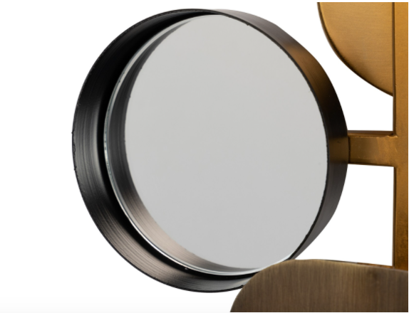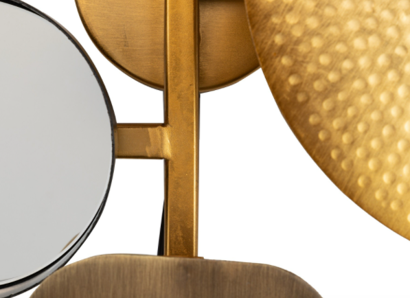 Candeeiro parede Rossland, com um design moderno e inspiração Art Deco feito em latão e composto por diferentes formas geométricas em ouro, ouro envelhecido e preto.