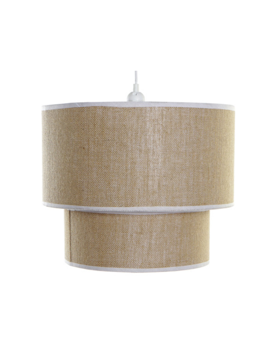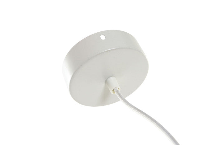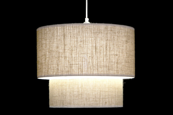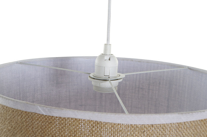 Candeeiro teto pendente com uma base fina redonda de metal branco com onde será colocado o abajur juta. Candeeiro moderno adequado para iluminar o quarto, quarto de criança, ou sala.