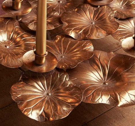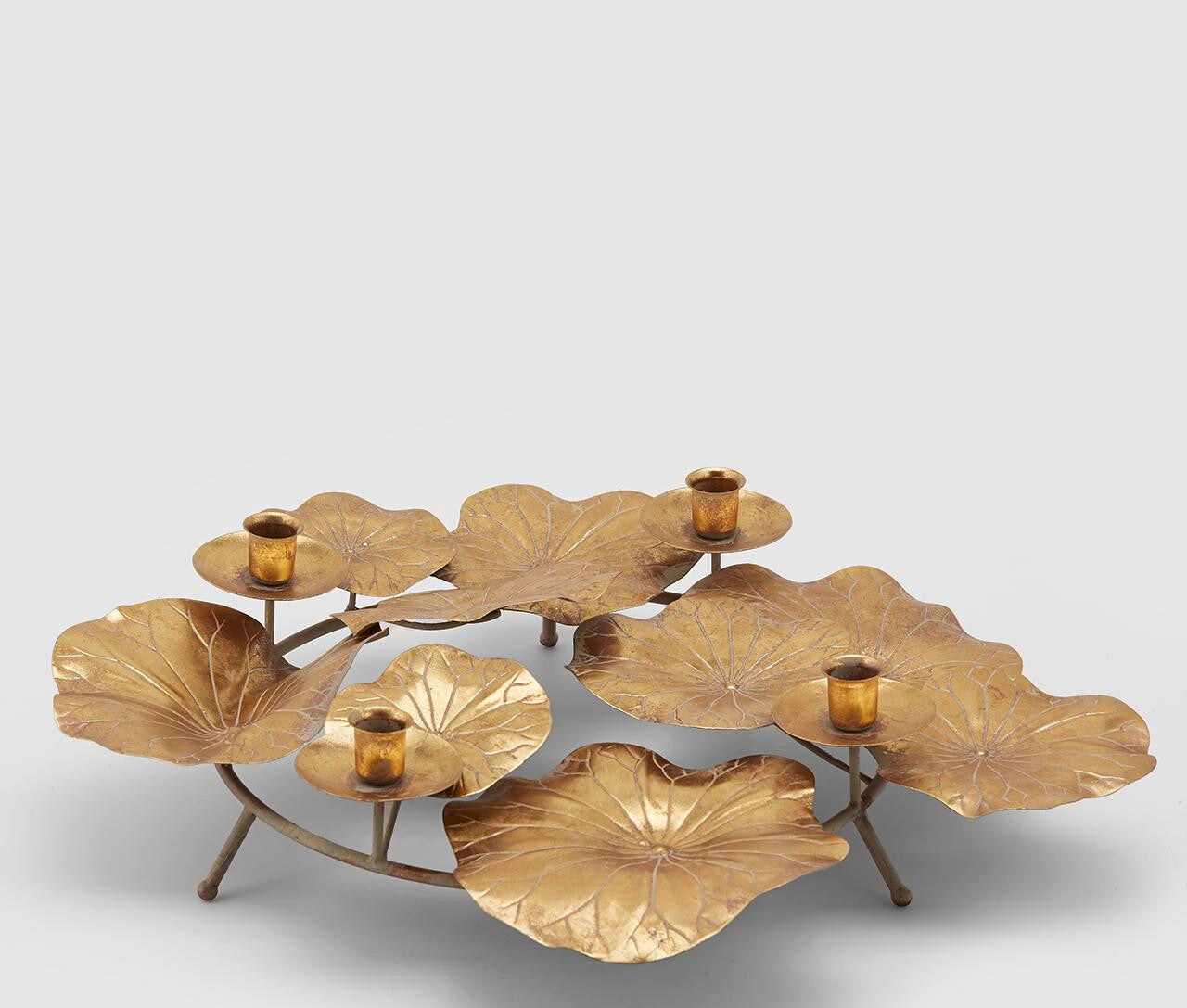 Castiçal Folhas Ninfea dourado em metal, com pés de apoio, ideal para um centro de mesa.