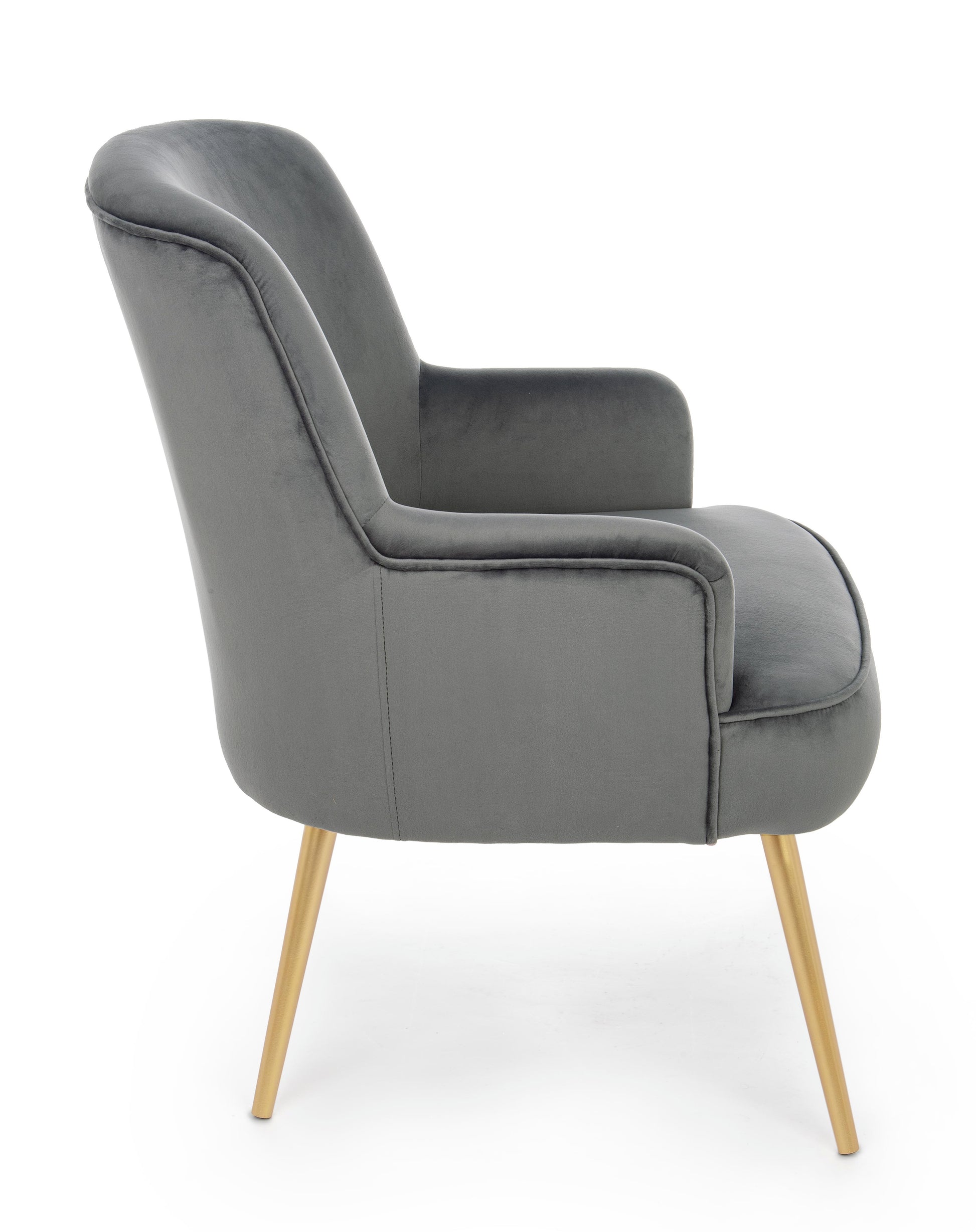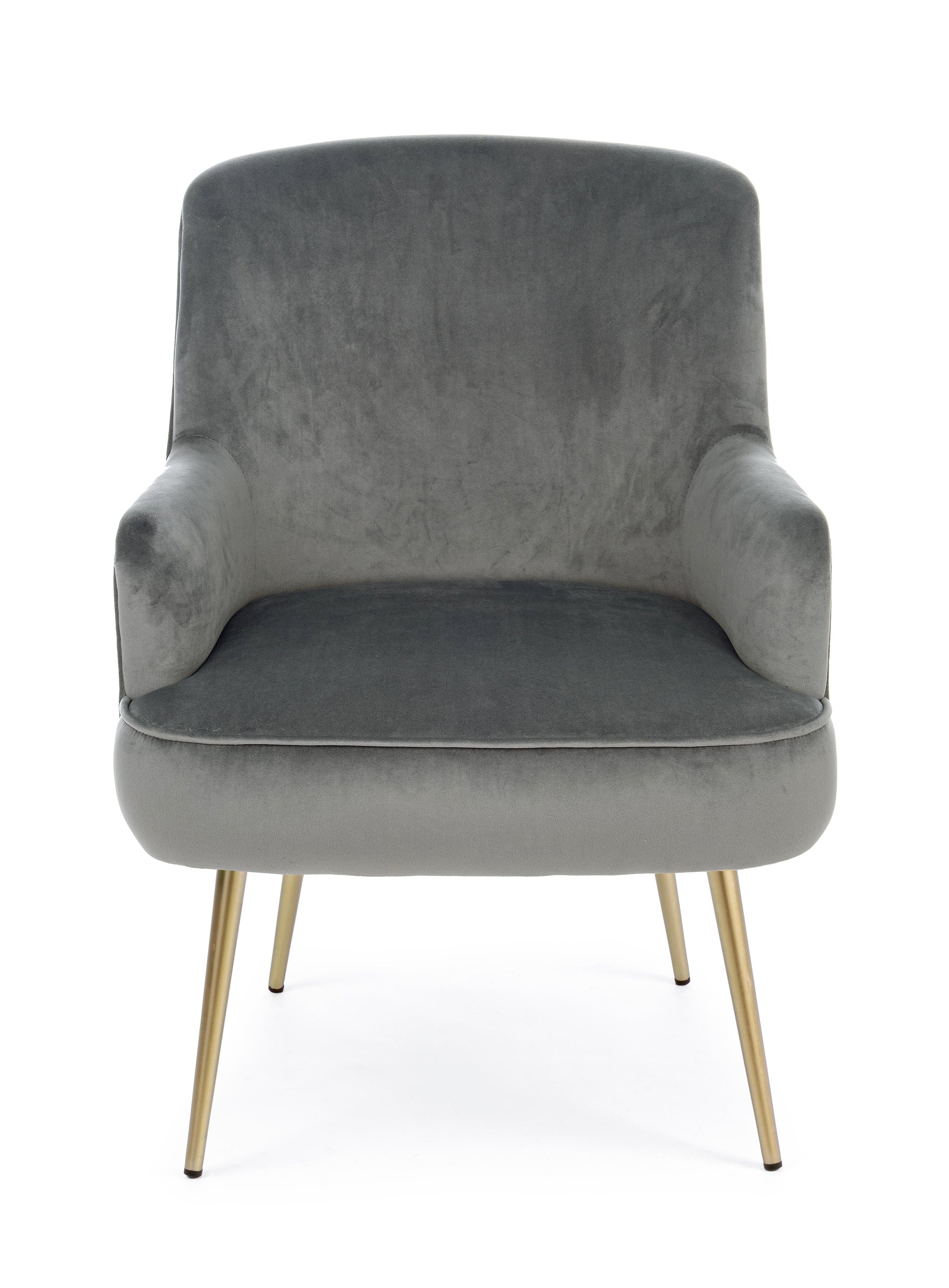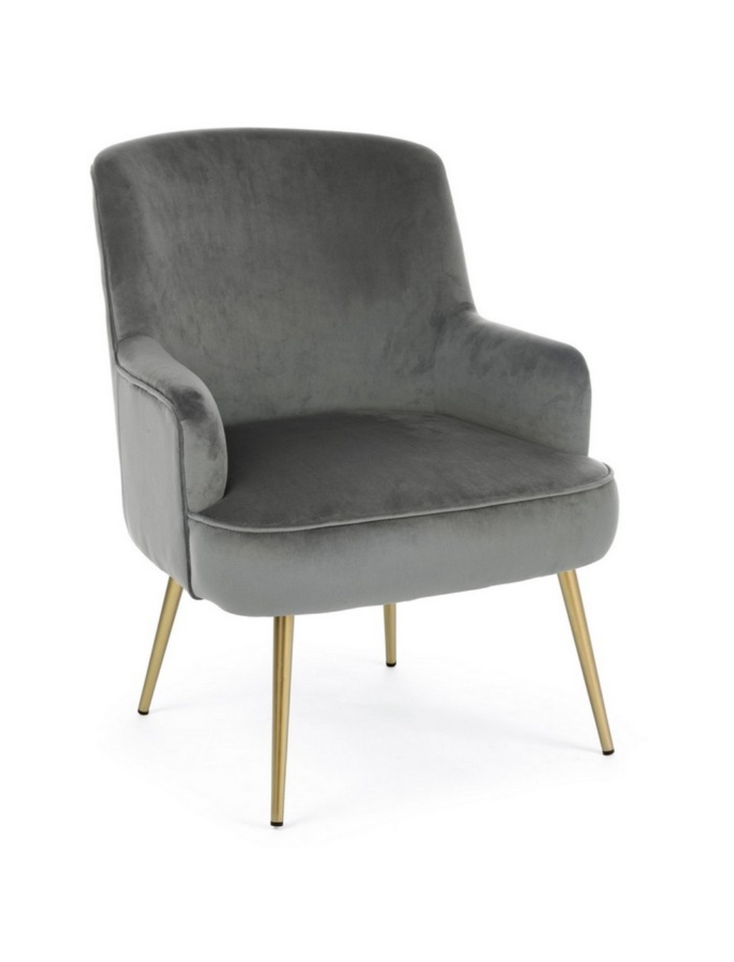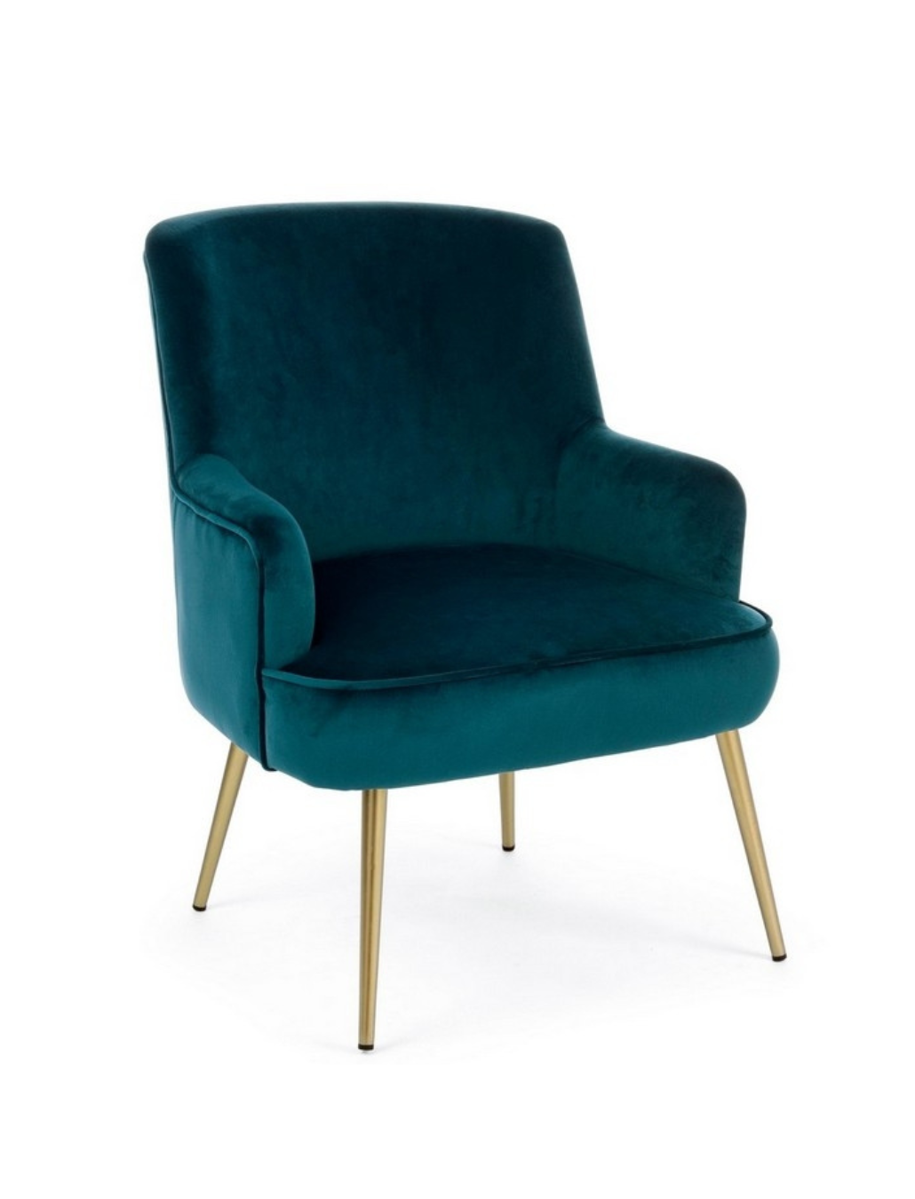 Poltrona Clelia, em veludo de cor intensa e pernas douradas.