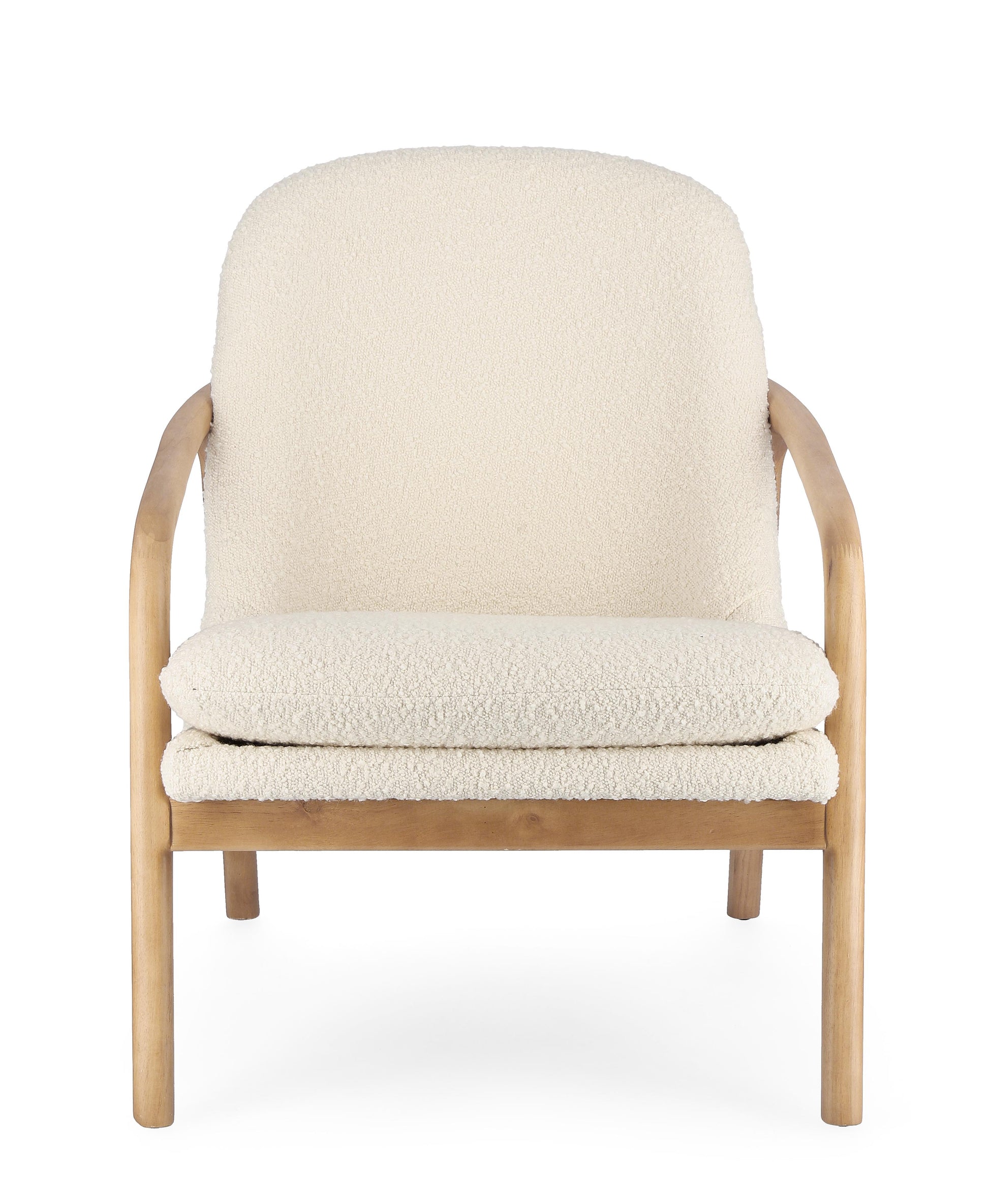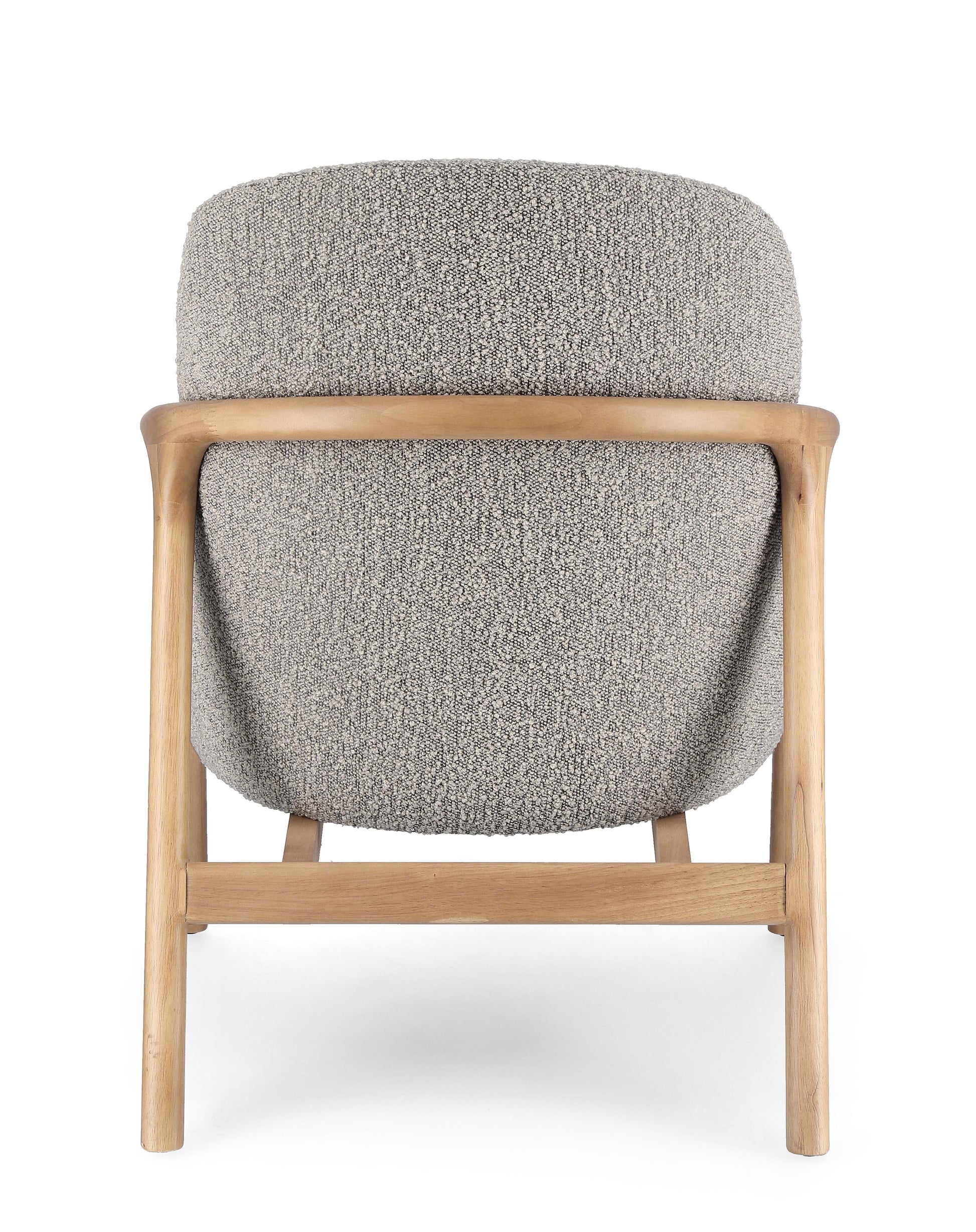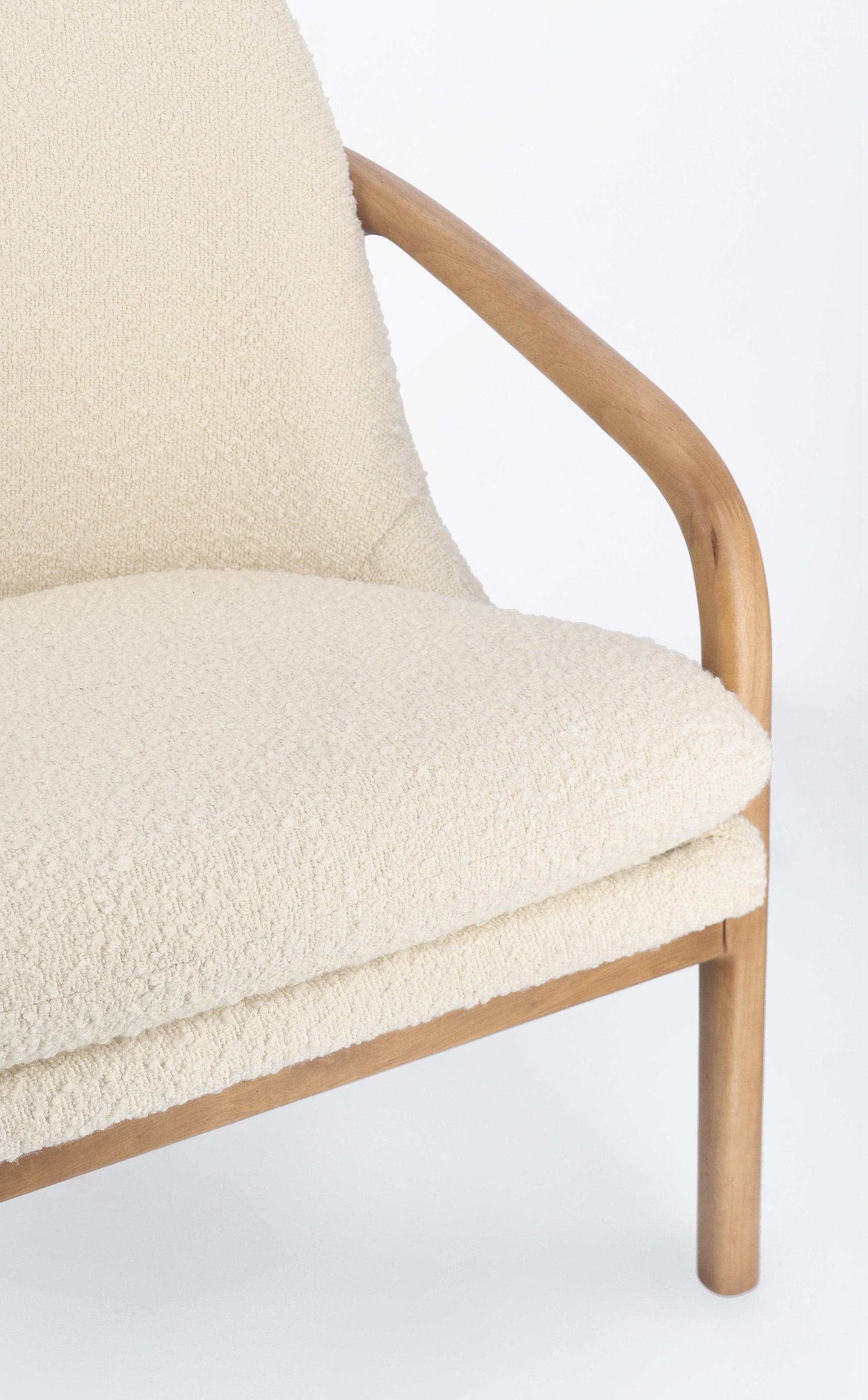 Poltrona Elaide, para uma casa contemporânea. Madeira Seringueira, com assento de madeira de pinho e MDF, revestimento de poliéster efeito bouclé.