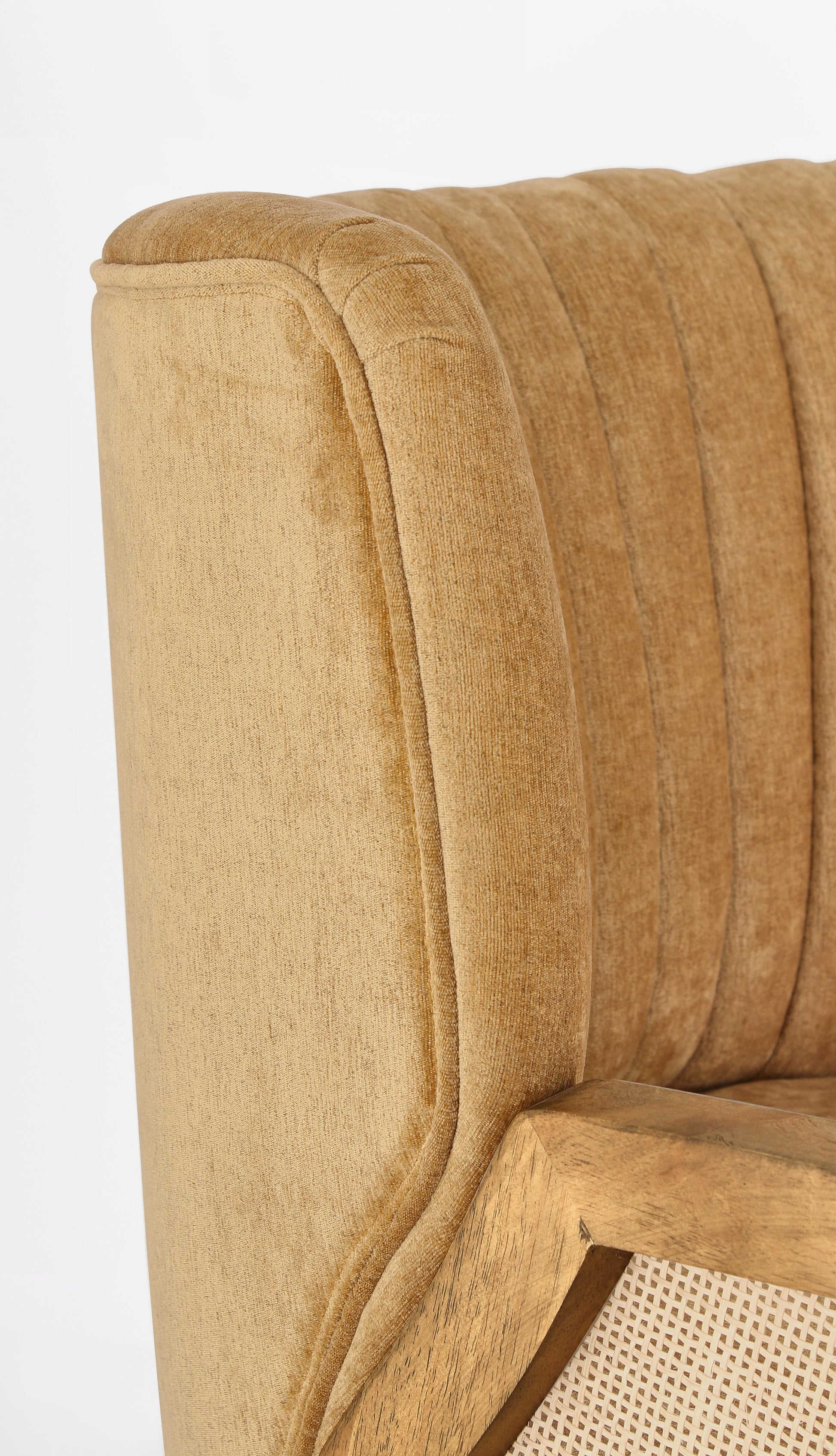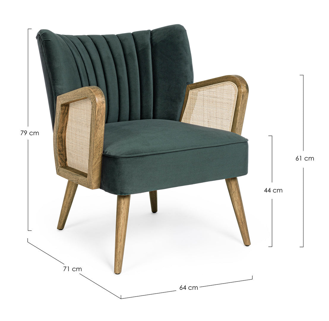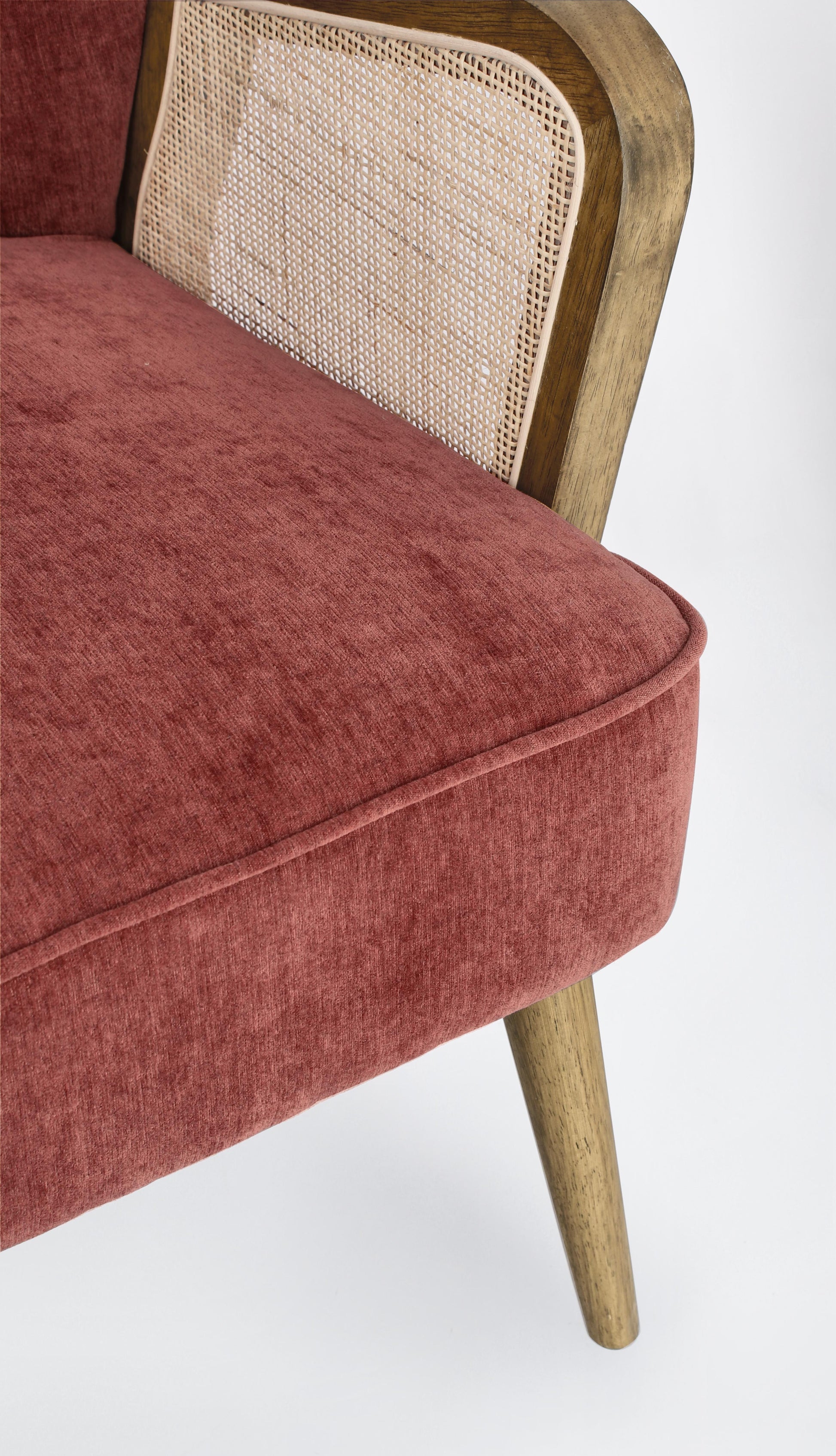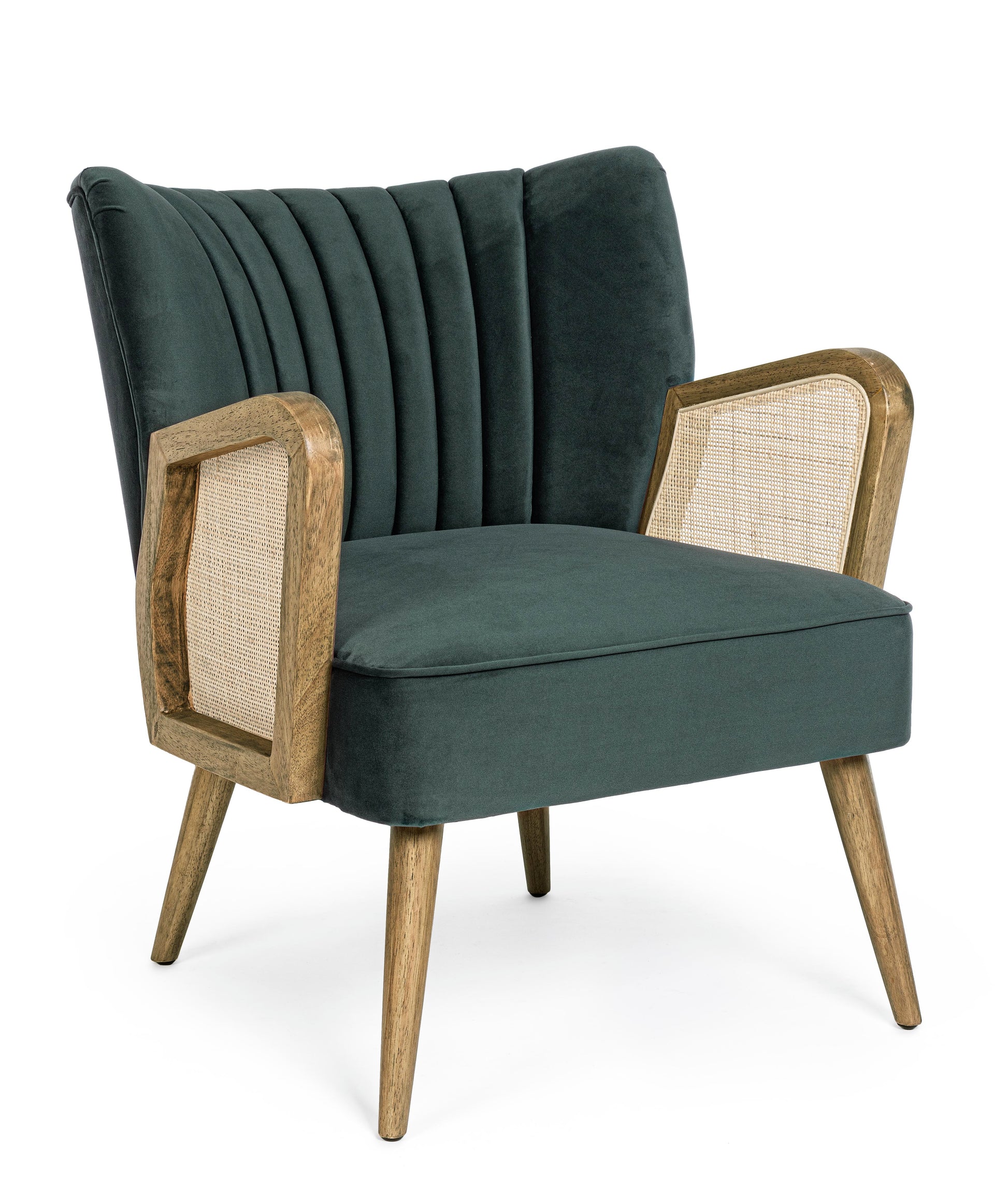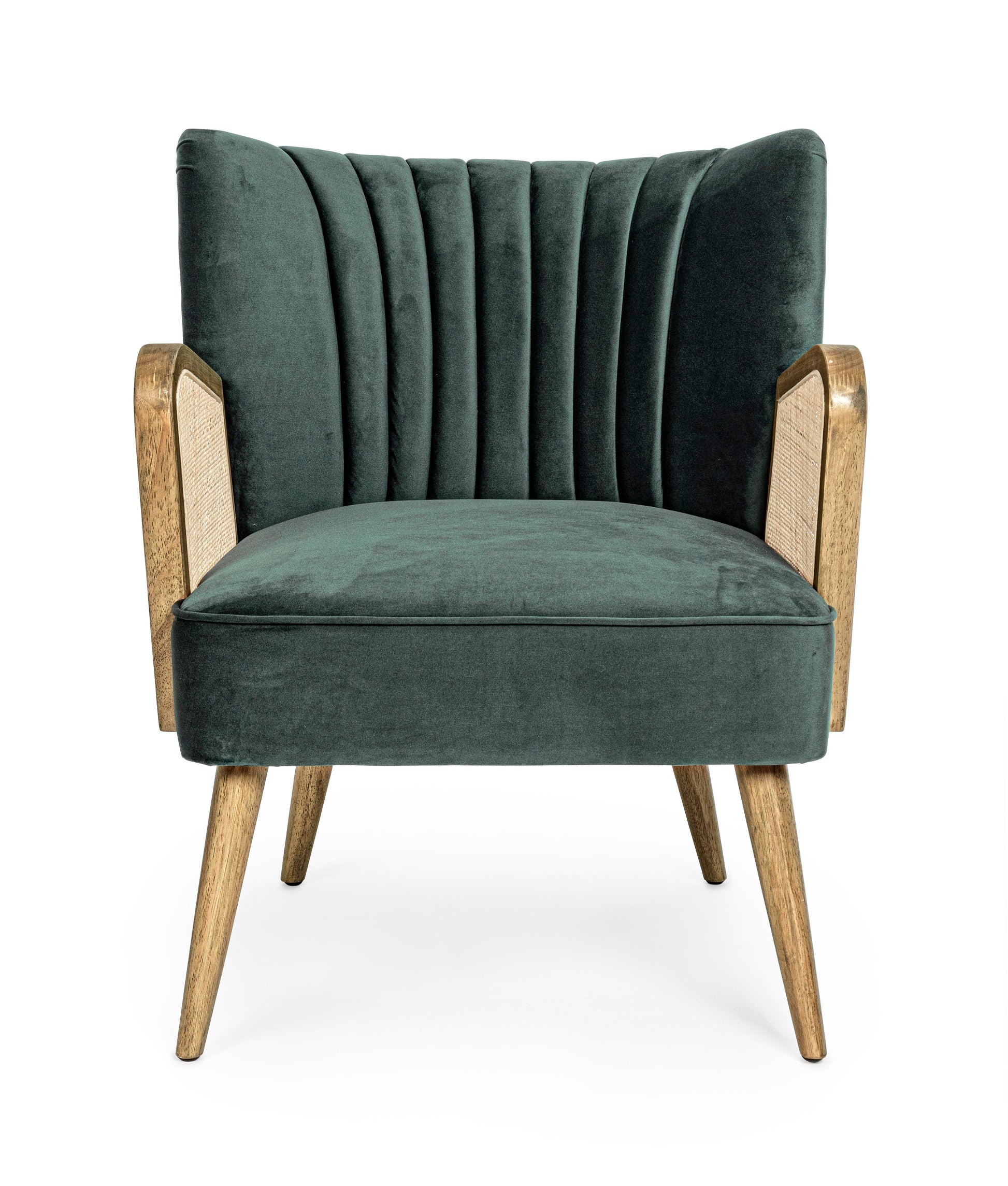 Poltrona Virna, disponível em Verde, Tijolo, Amarelo Mostarda, Branco ou Cinzento. Estrutura de pinho e mdf, pés de madeira, apoio de braço com aplicação de rattan. Estofo em veludo.