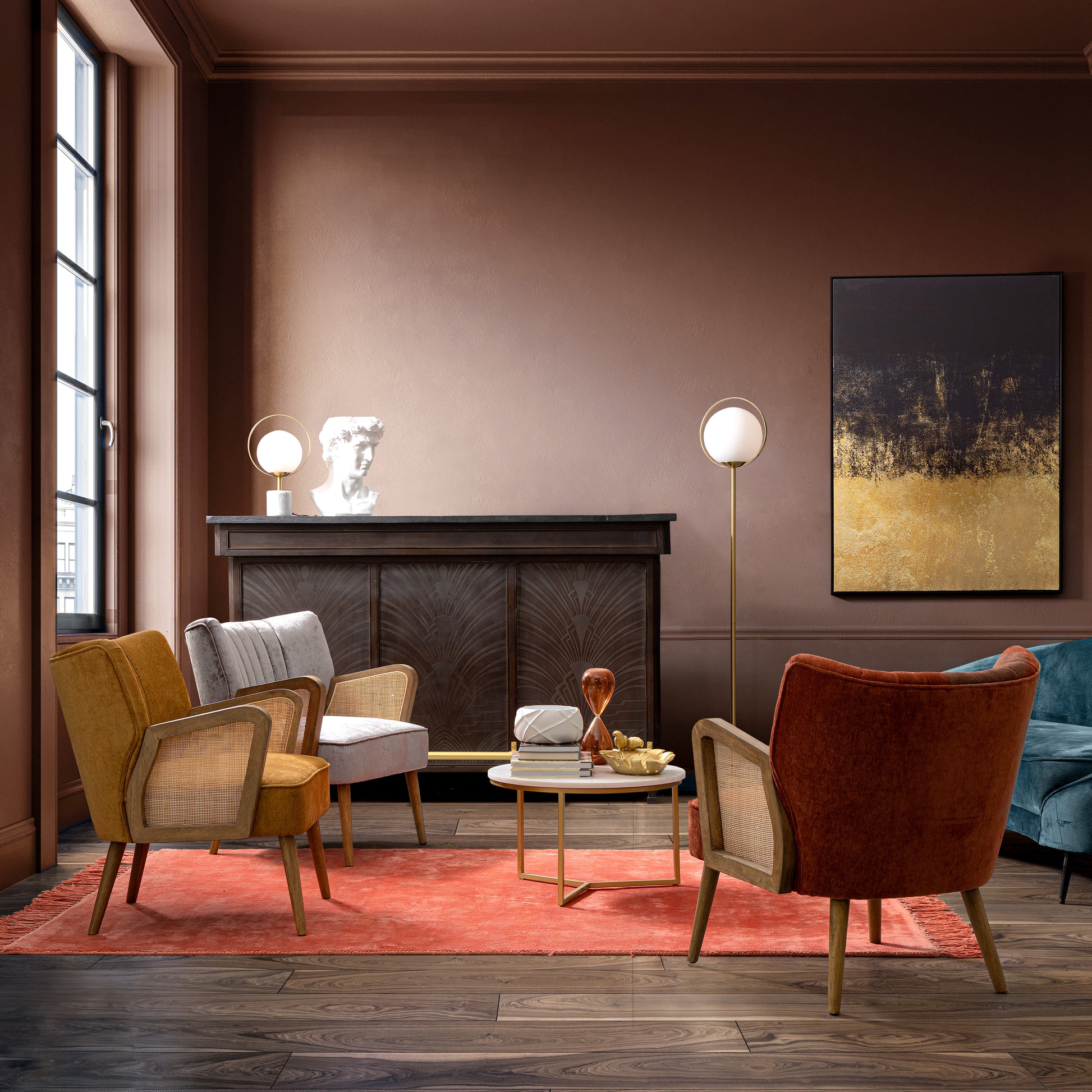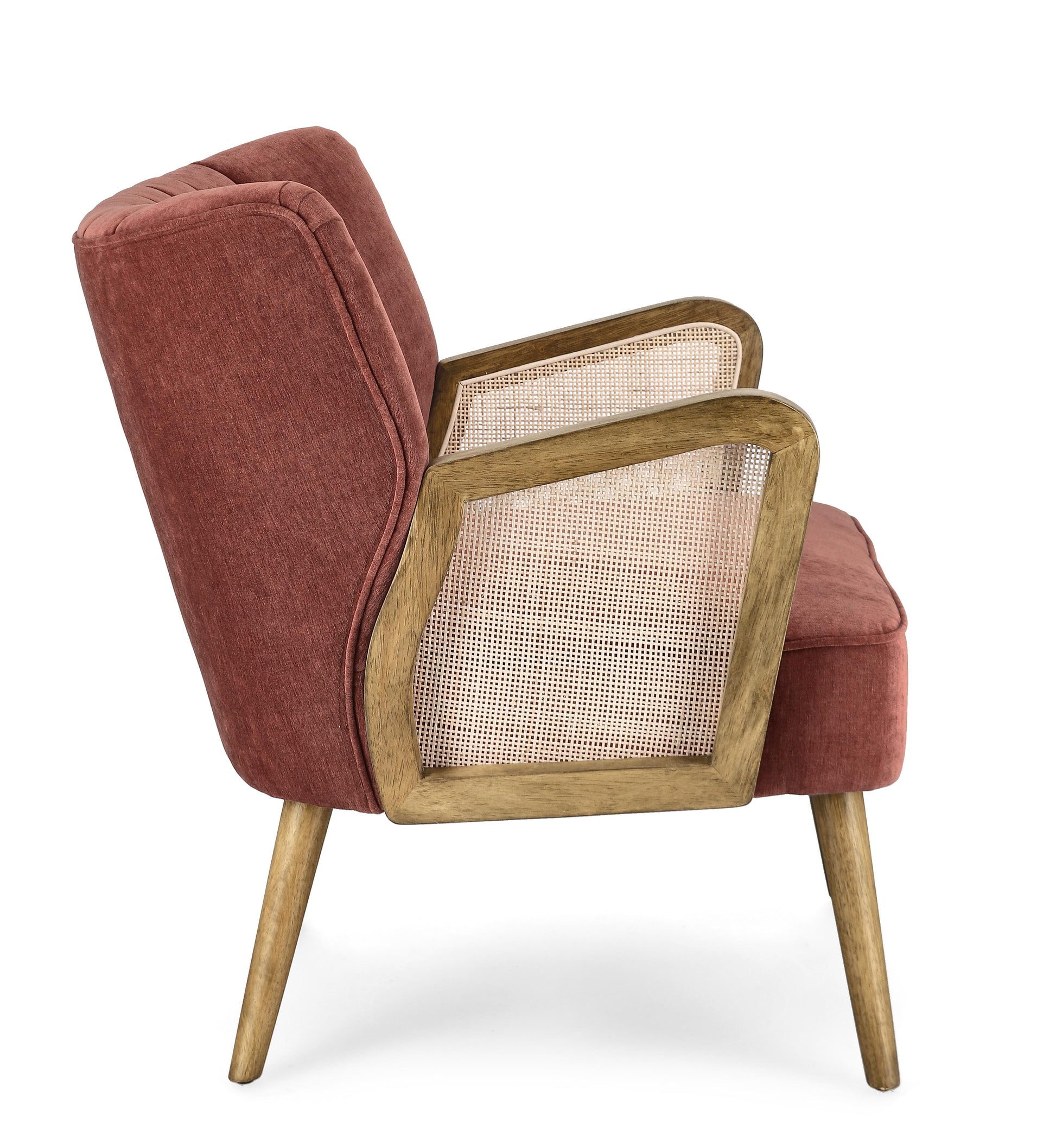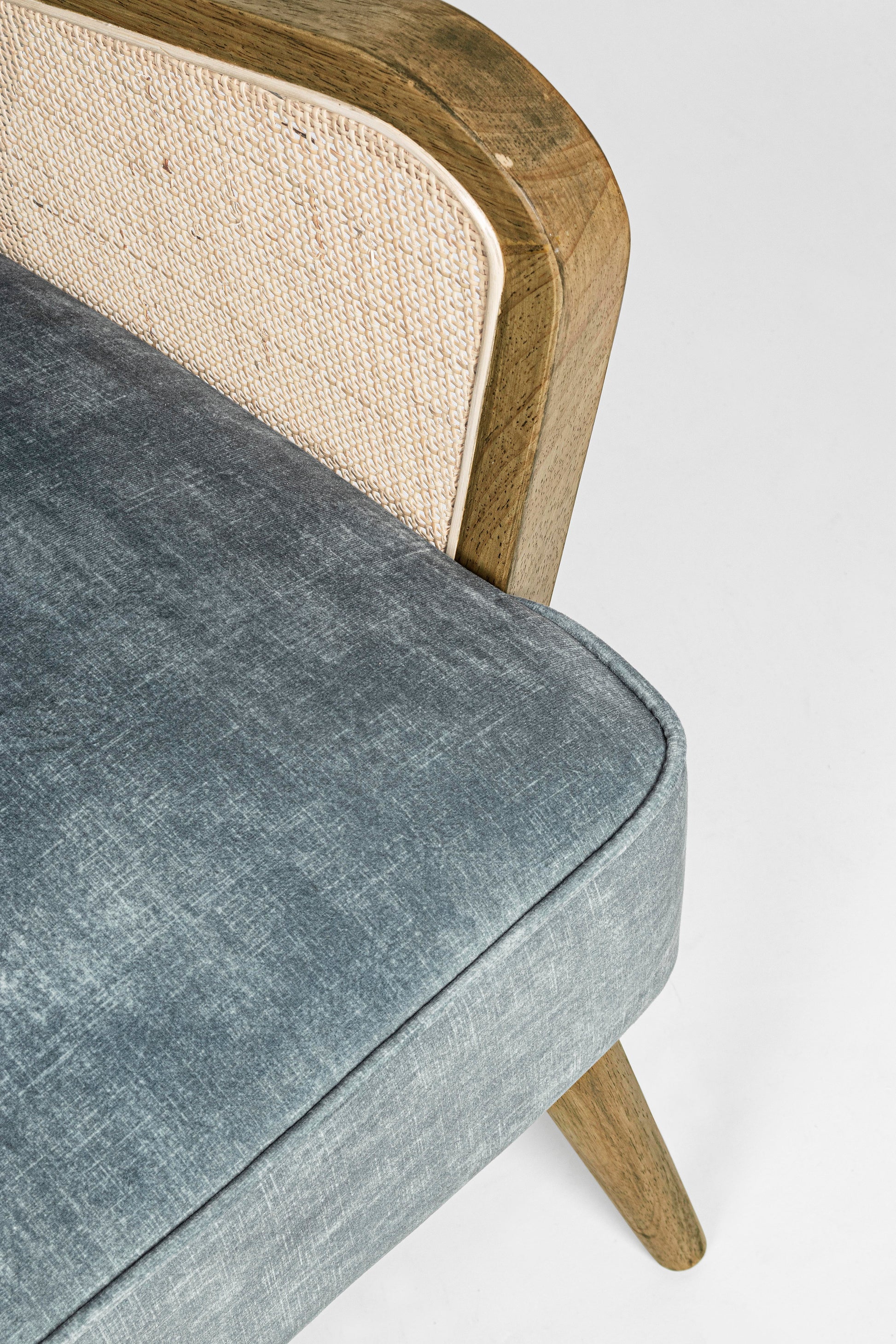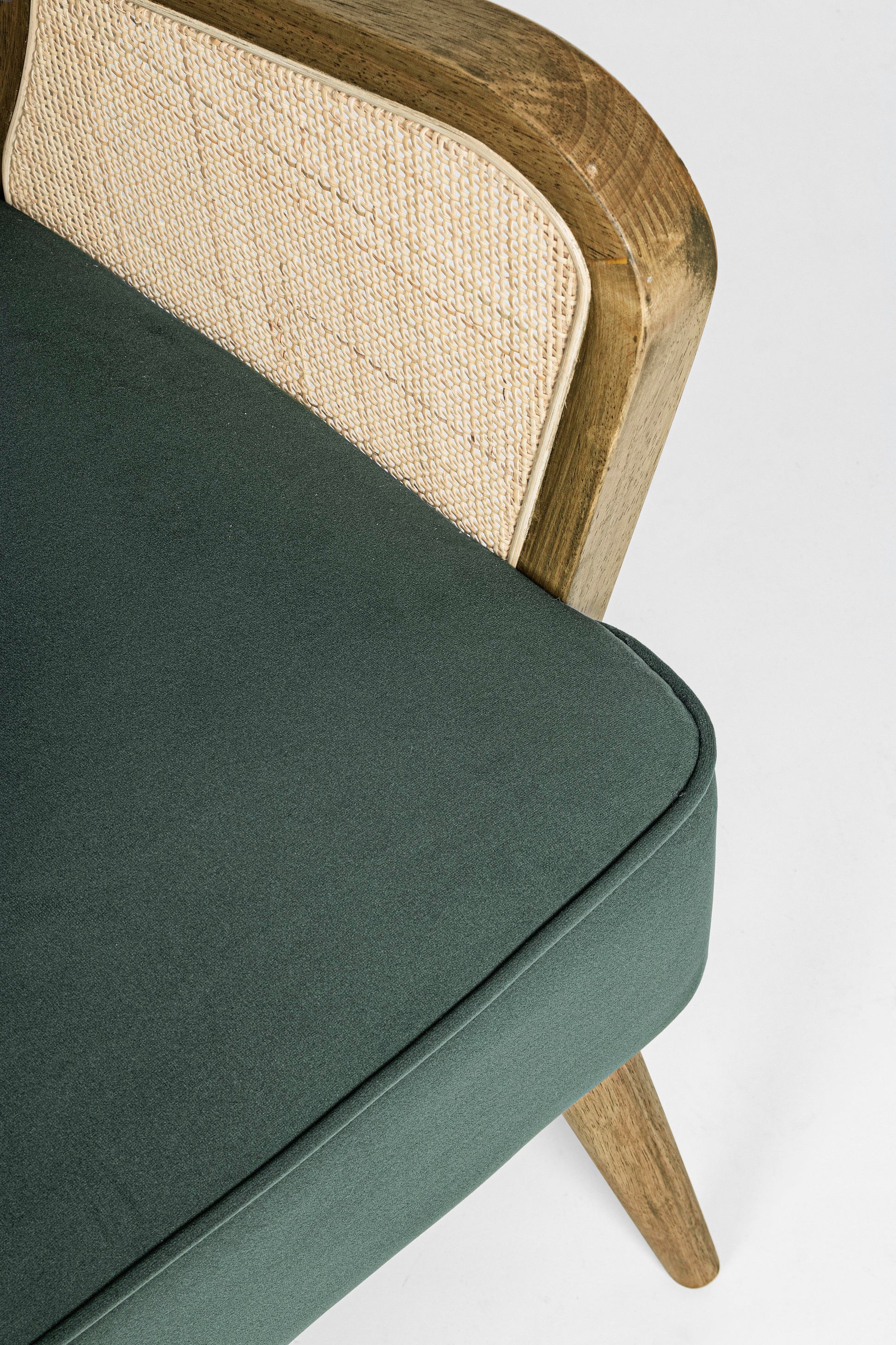 Poltrona Virna, disponível em Verde, Tijolo, Amarelo Mostarda, Branco ou Cinzento. Estrutura de pinho e mdf, pés de madeira, apoio de braço com aplicação de rattan. Estofo em veludo.