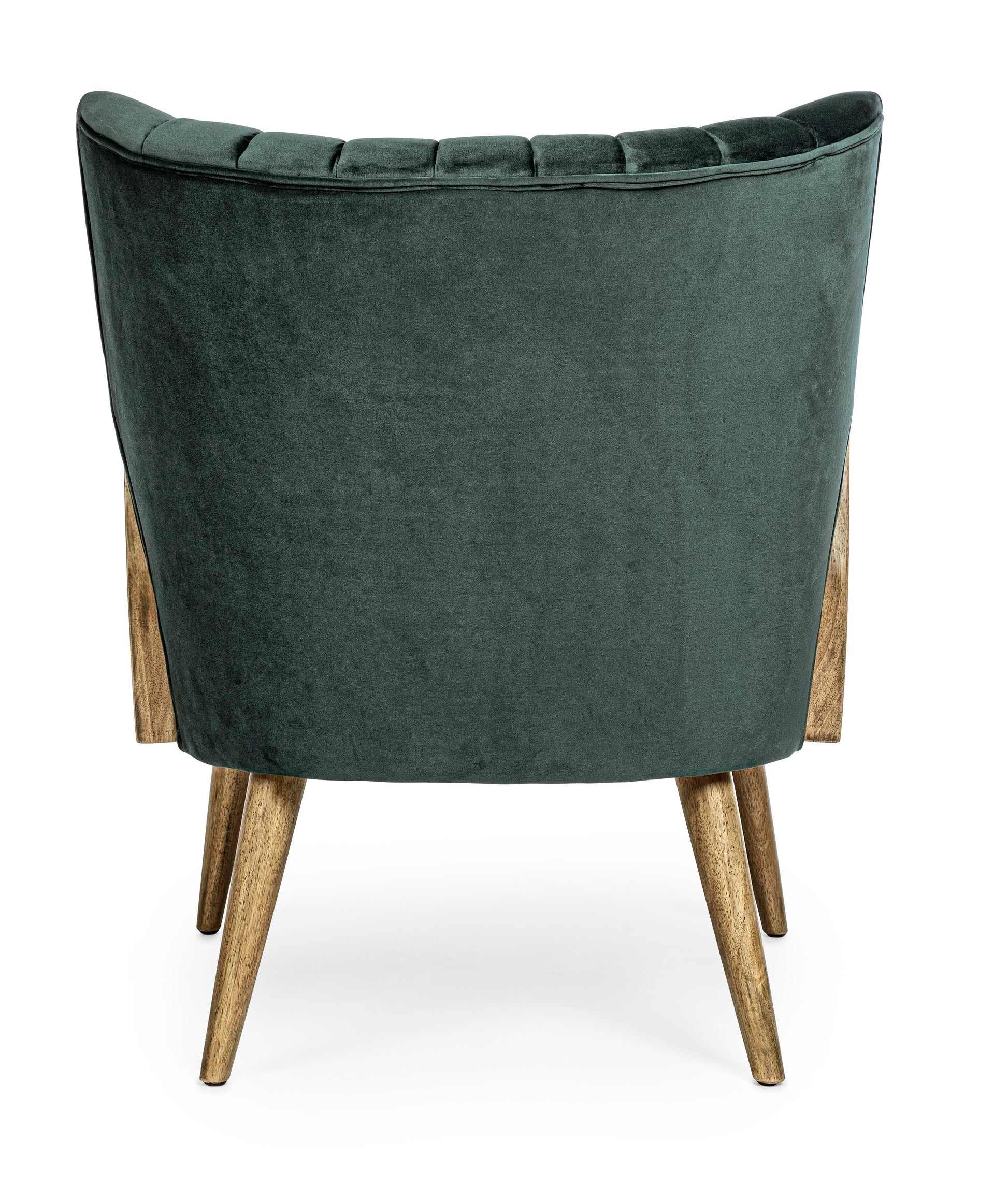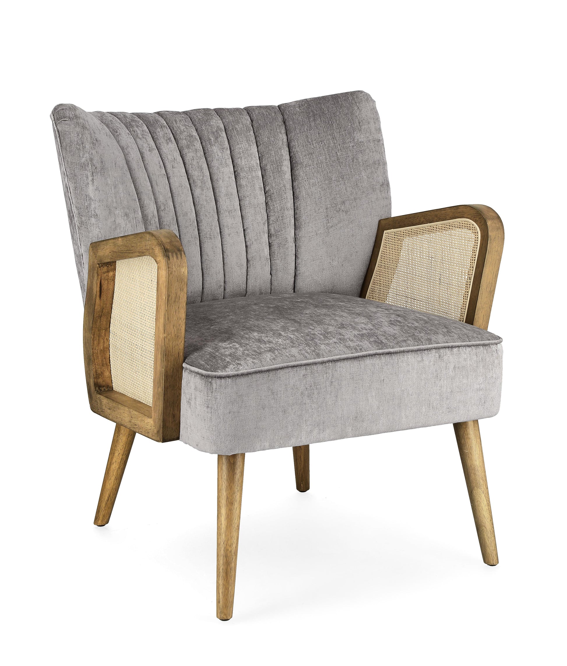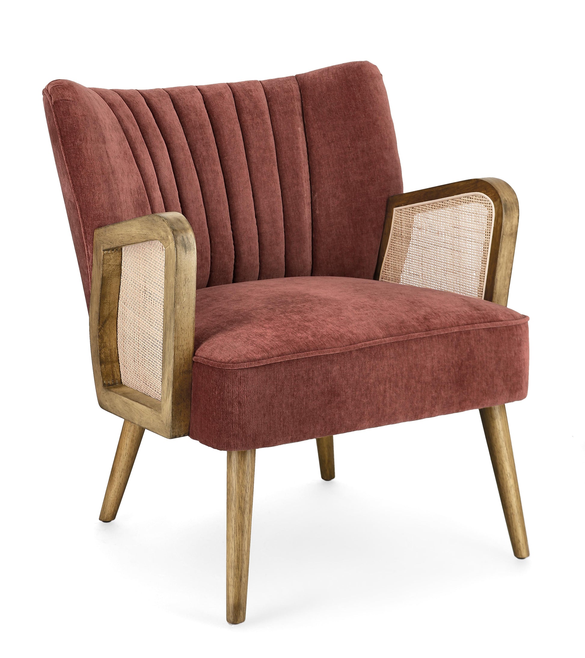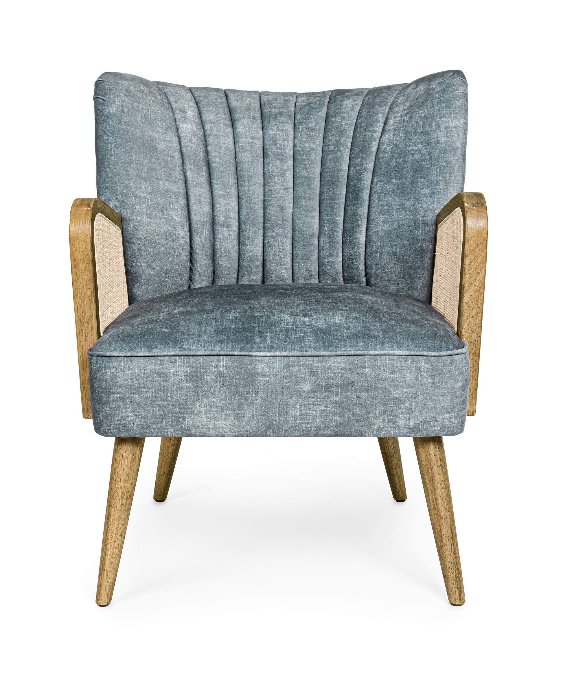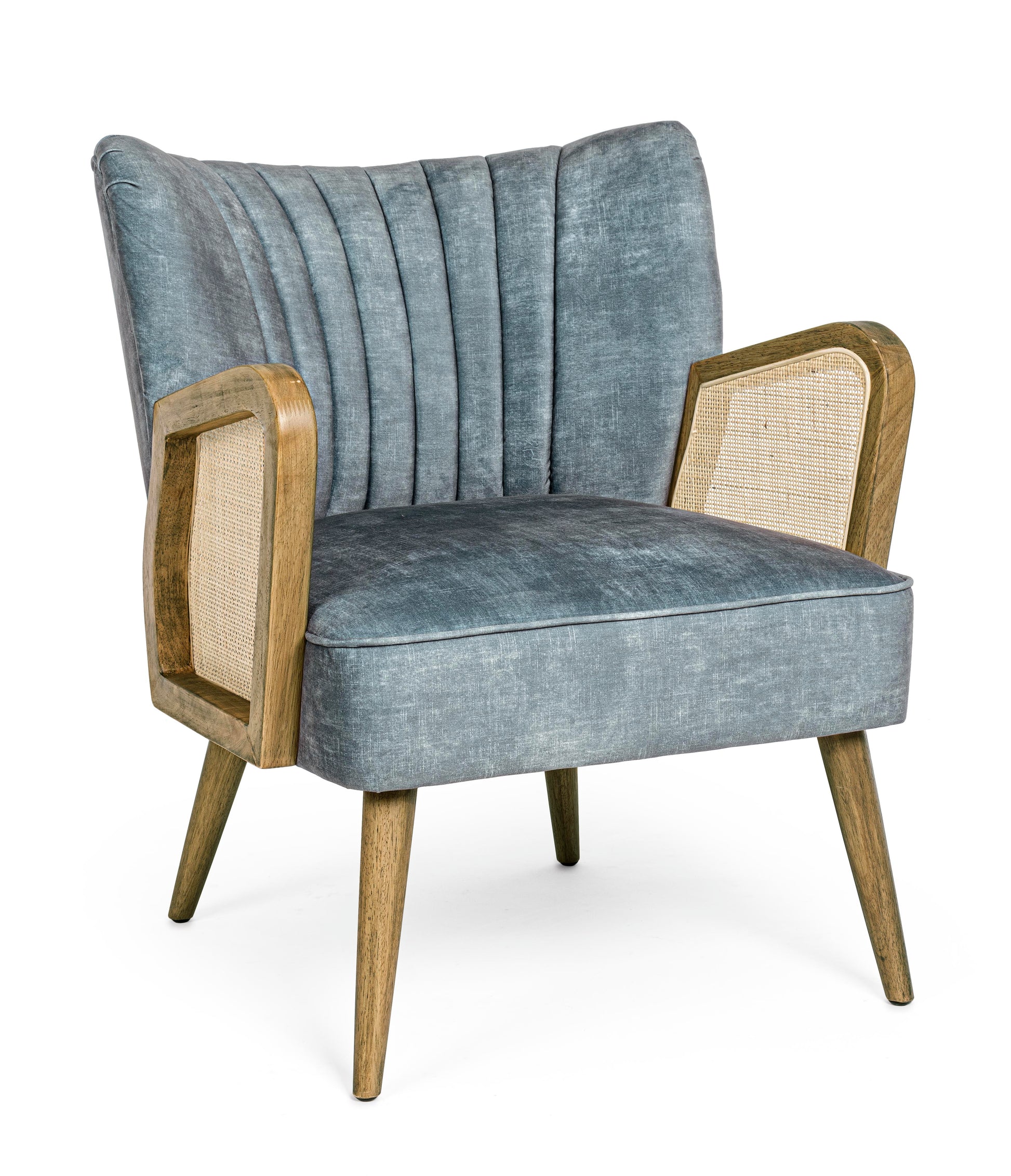 Poltrona Virna, disponível em Verde, Tijolo, Amarelo Mostarda, Branco ou Cinzento. Estrutura de pinho e mdf, pés de madeira, apoio de braço com aplicação de rattan. Estofo em veludo.