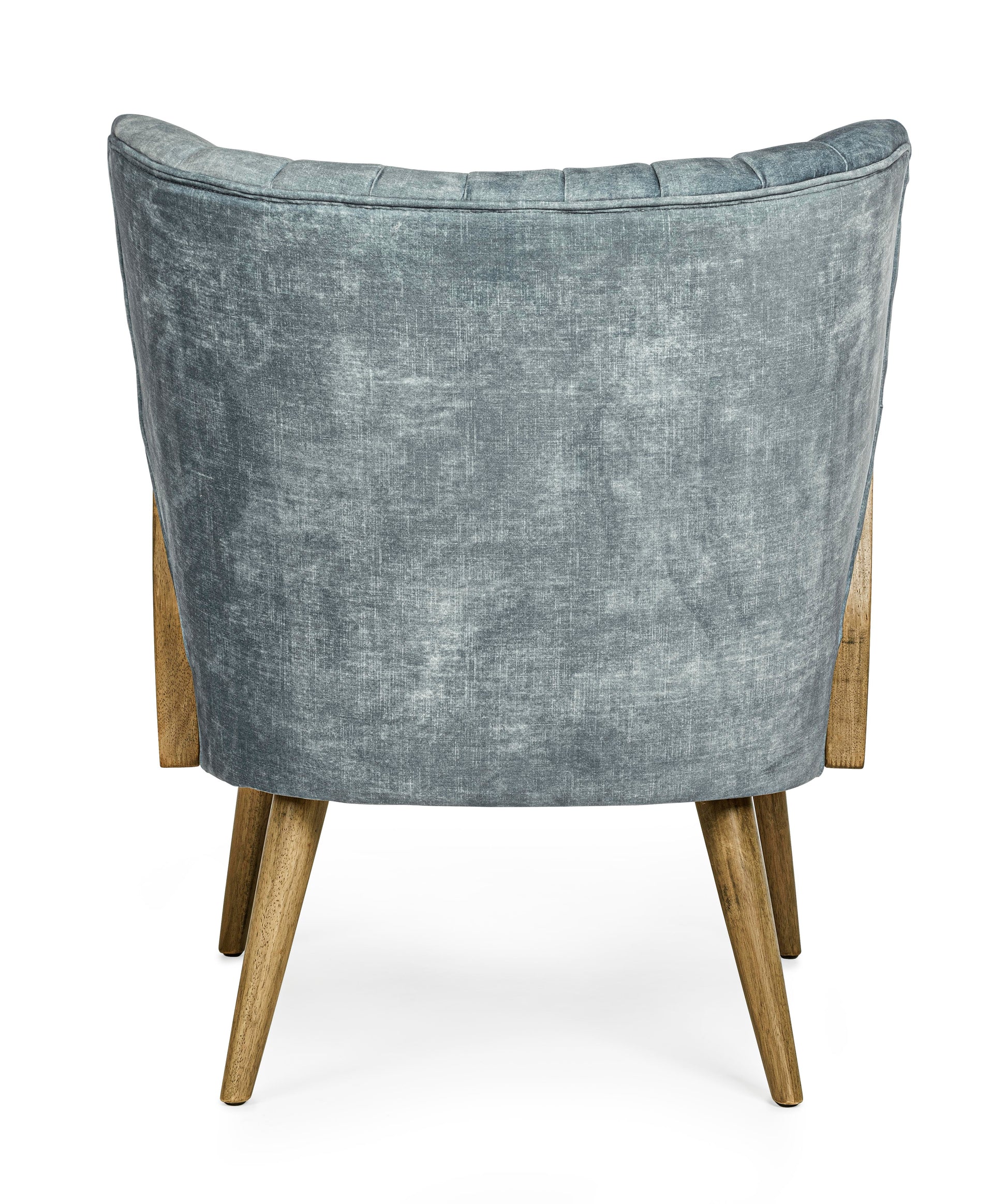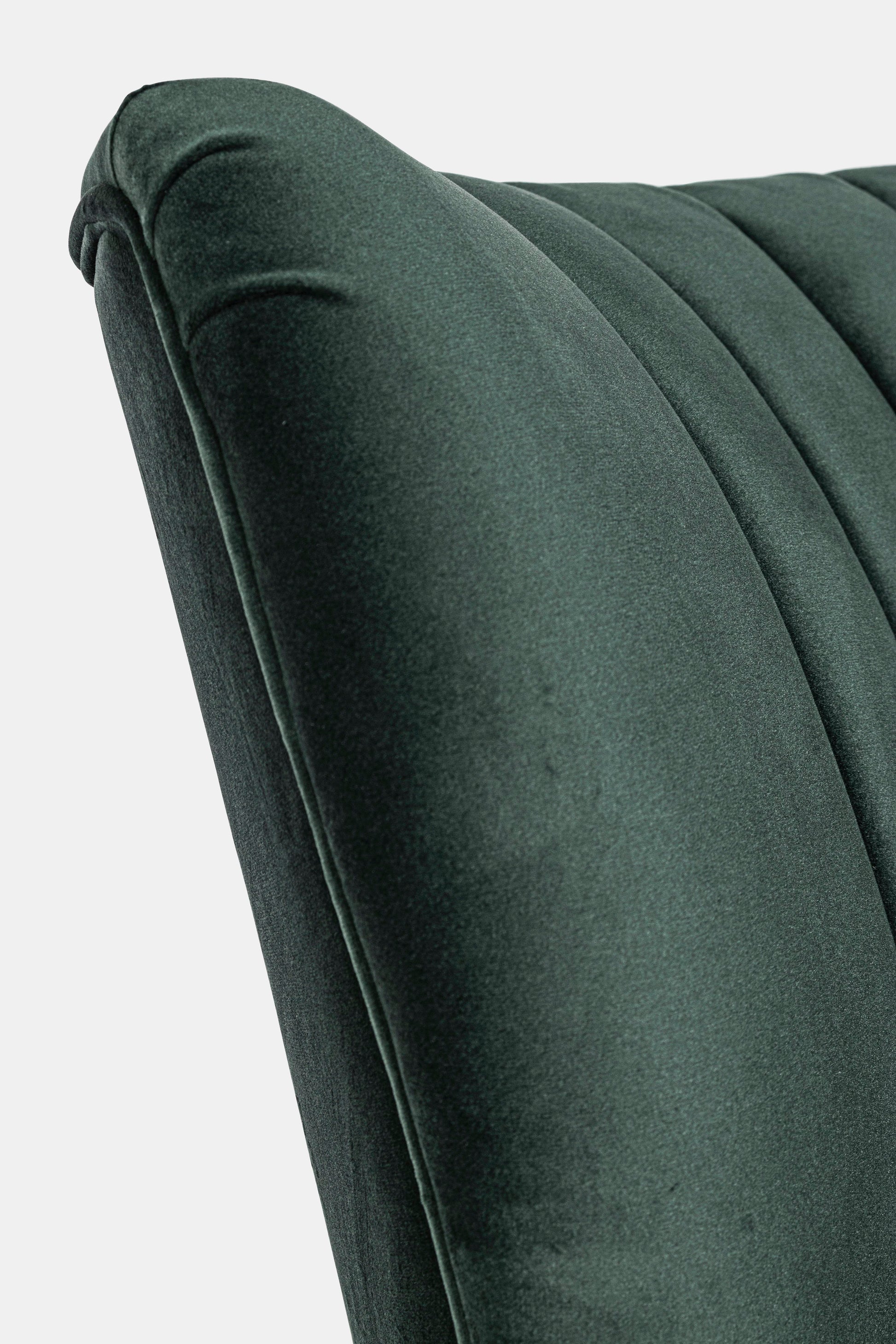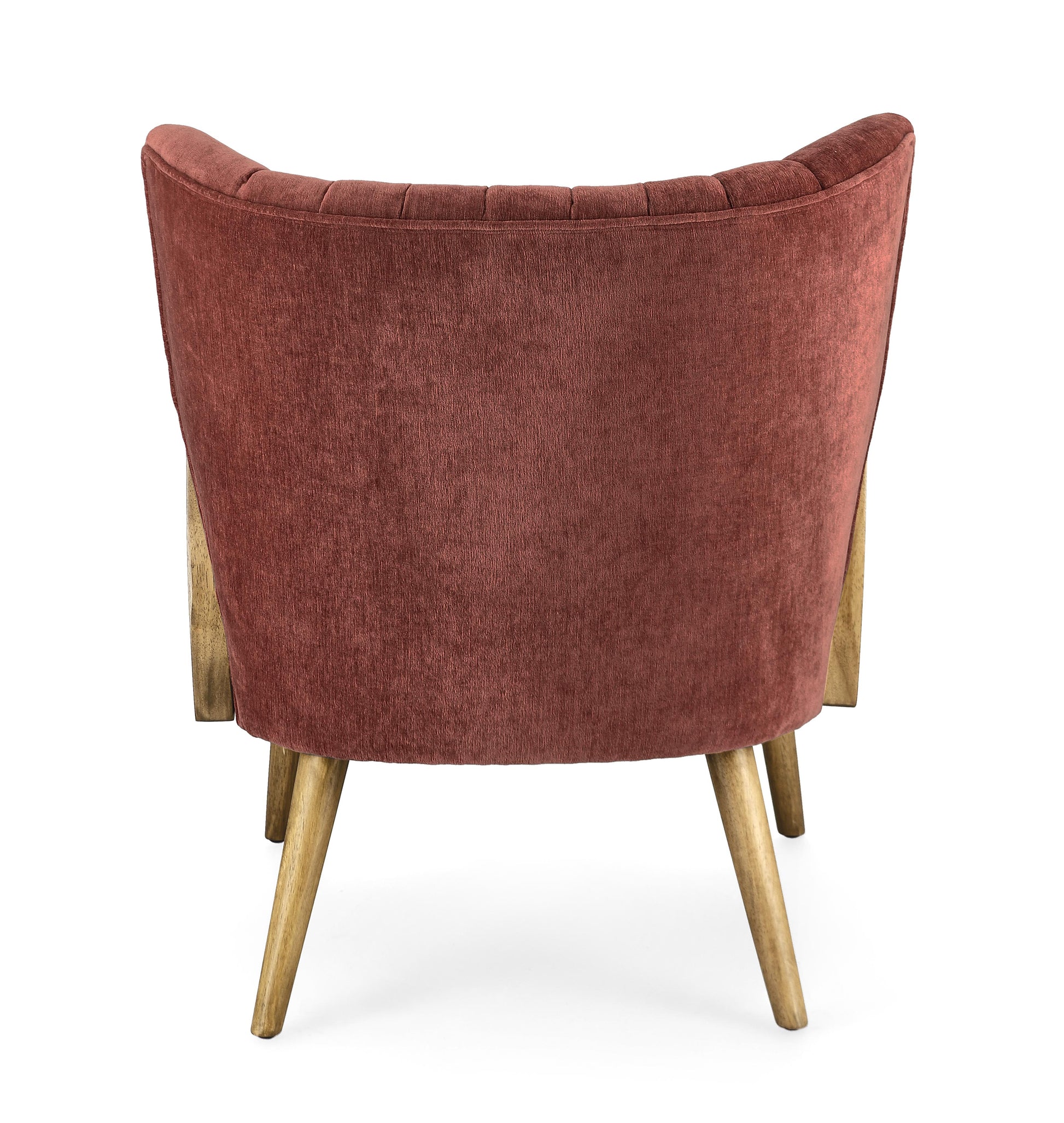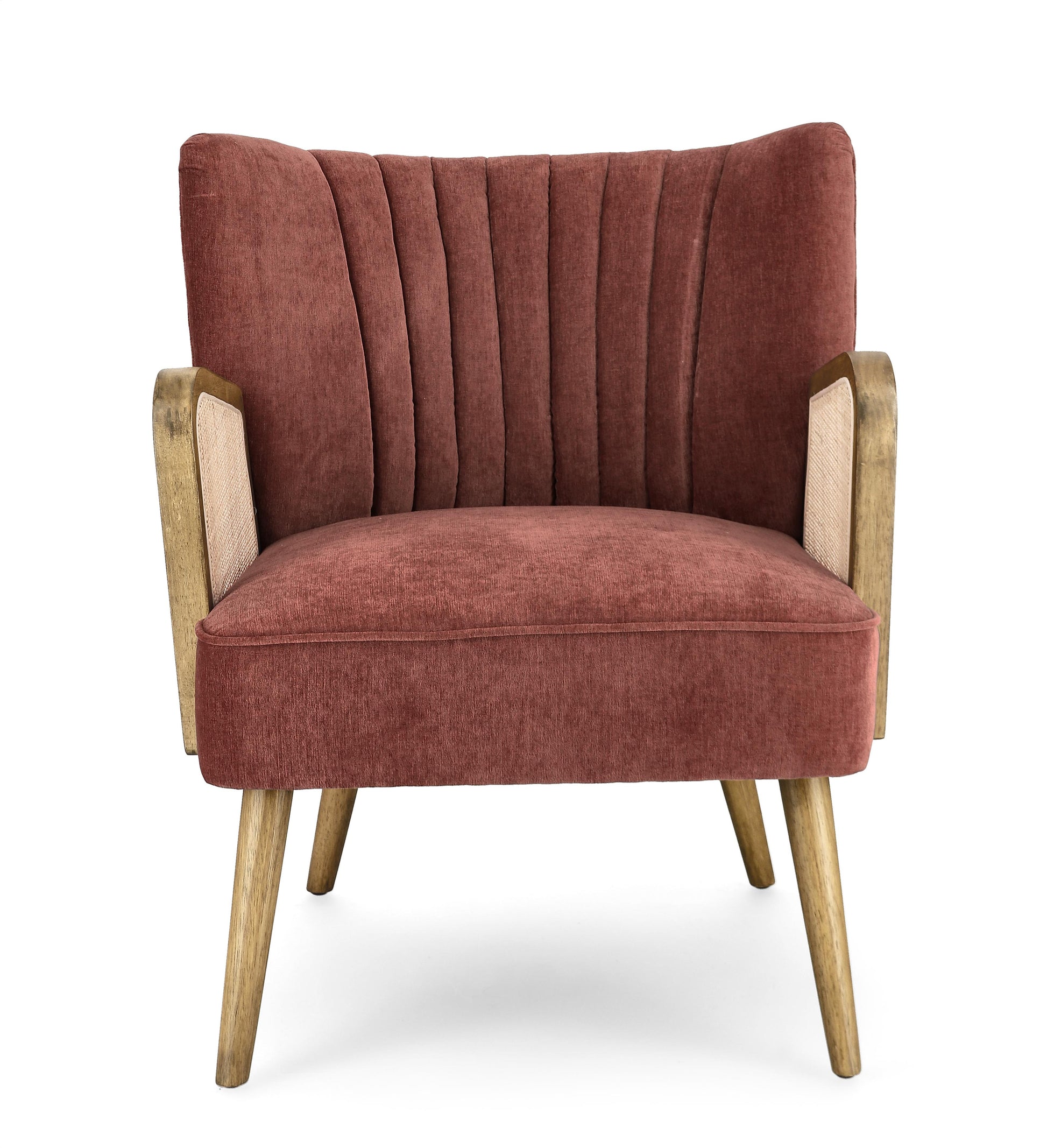 Poltrona Virna, disponível em Verde, Tijolo, Amarelo Mostarda, Branco ou Cinzento. Estrutura de pinho e mdf, pés de madeira, apoio de braço com aplicação de rattan. Estofo em veludo.