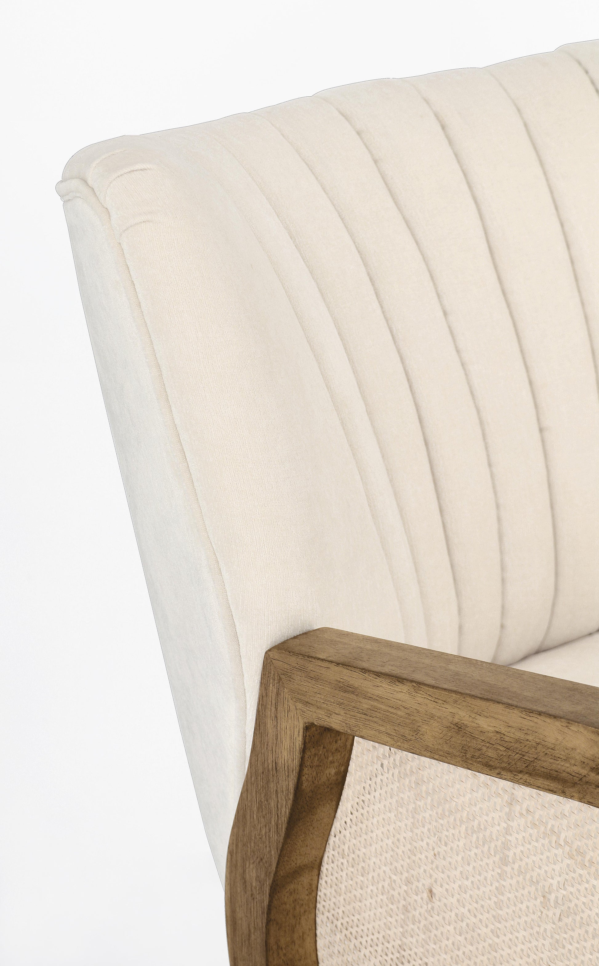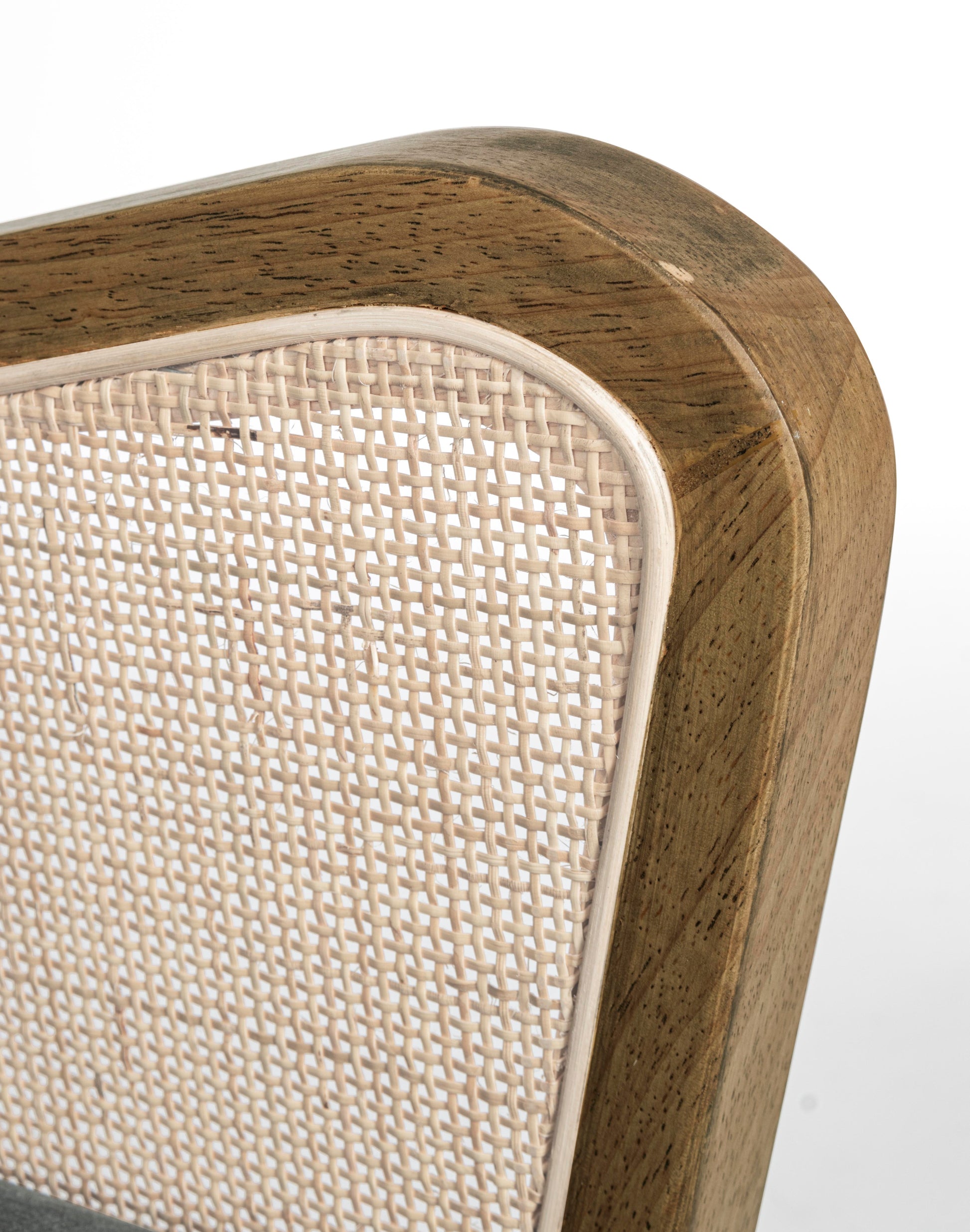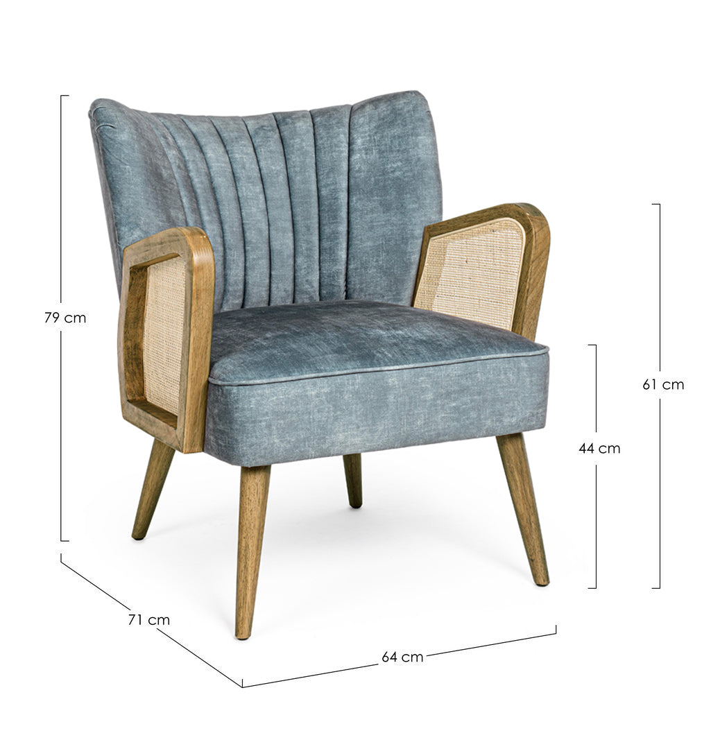 Estrutura em madeira de pinho e contraplacado. Pernas em madeira de seringueira. Apoios de braços com inserções em vime. Revestimento em poliéster com efeito veludo. Enchimento em espuma de poliuretano com densidade de 24 kg/m³. Capa fixa (não removível). Requer montagem das pernas.