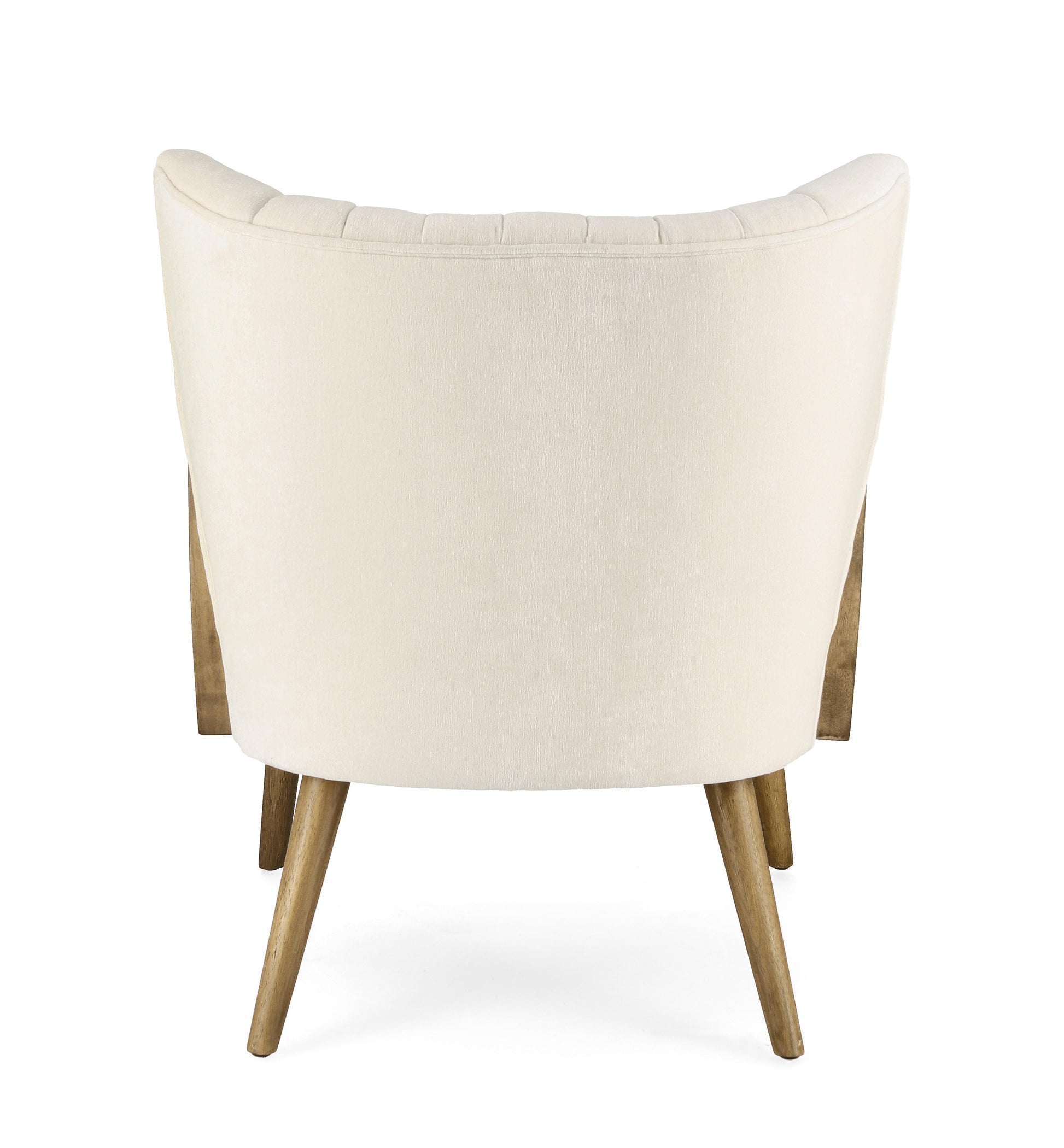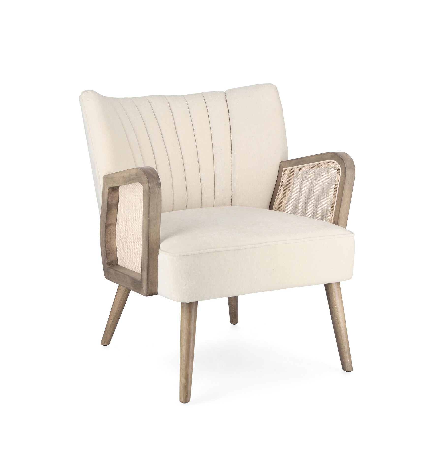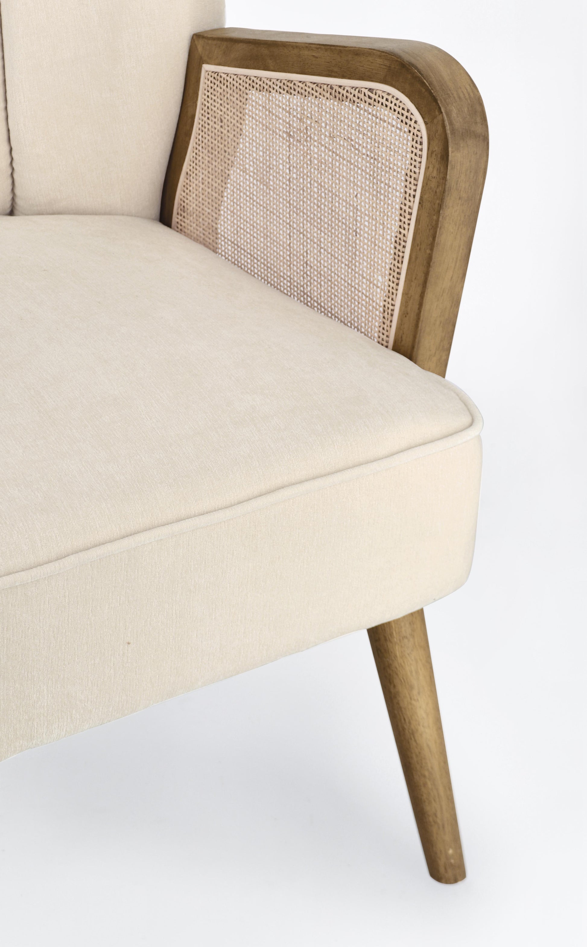 Estrutura em madeira de pinho e contraplacado. Pernas em madeira de seringueira. Apoios de braços com inserções em vime. Revestimento em poliéster com efeito veludo. Enchimento em espuma de poliuretano com densidade de 24 kg/m³. Capa fixa (não removível). Requer montagem das pernas.