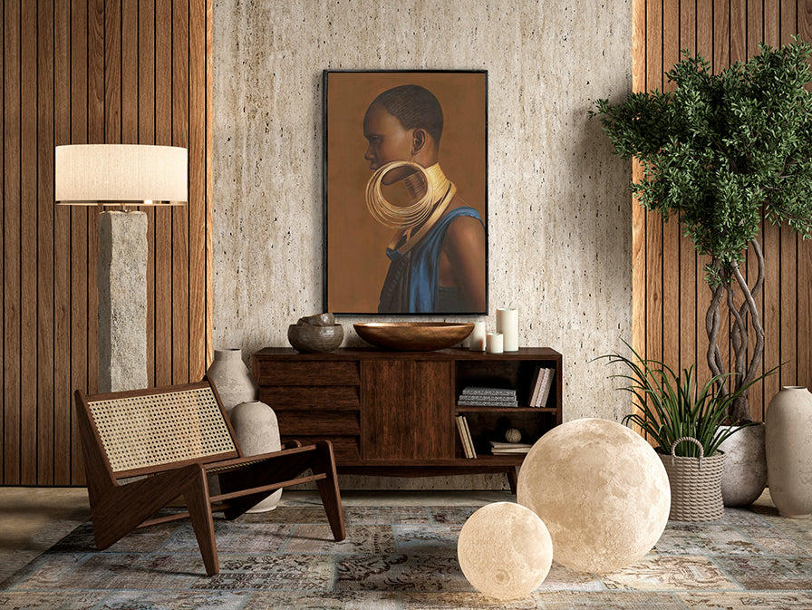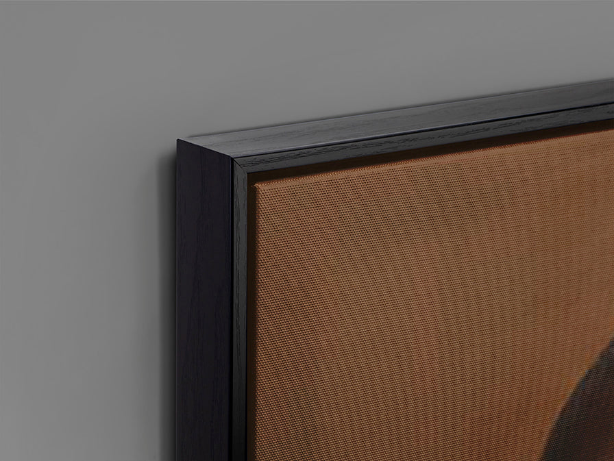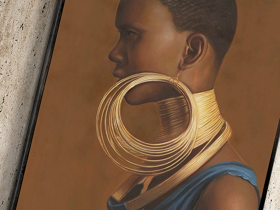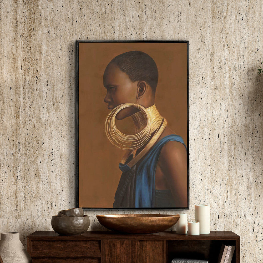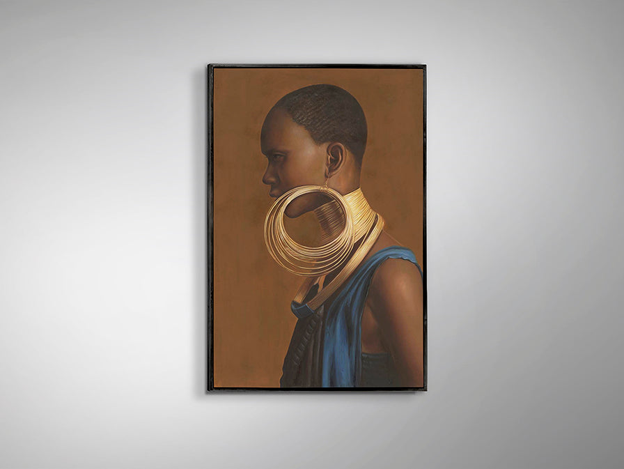 Tela impressa, busto de mulher africana. Moldura com acabamento a preto acetinado.