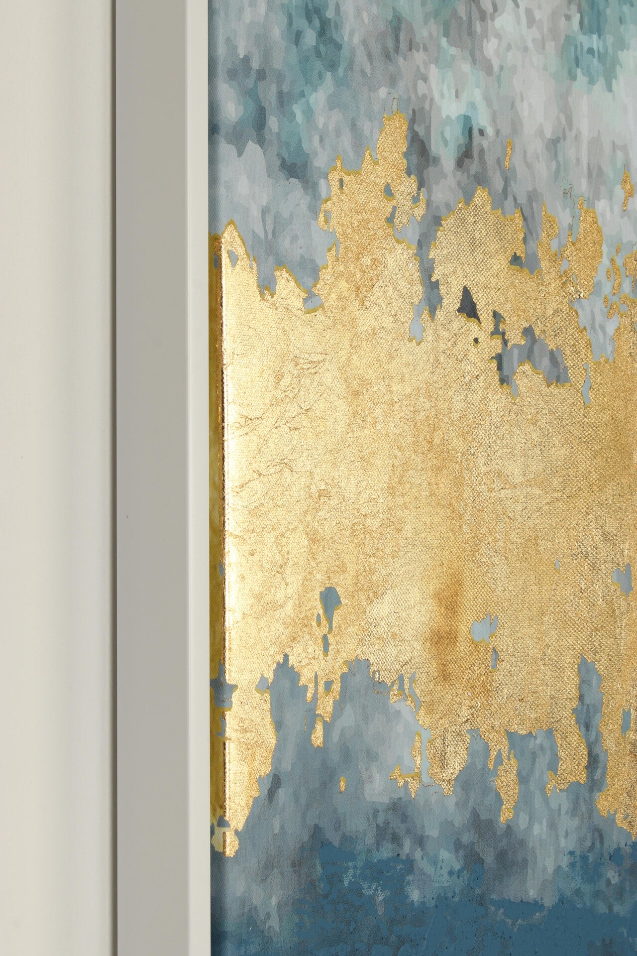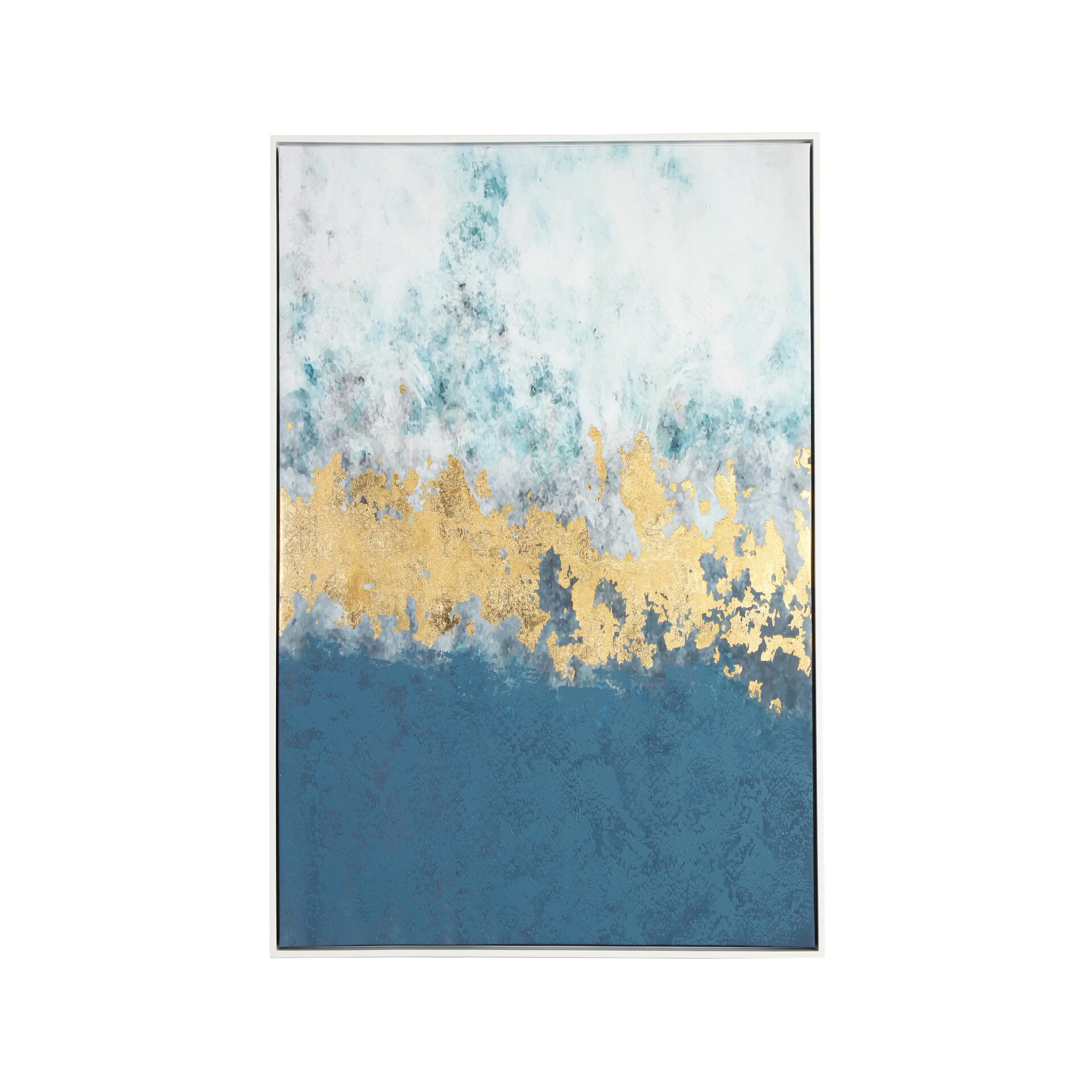 Quadro Sea Azul e Dourado 122x82 cm, estilo contemporâneo, com moldura branca. Tela estampada pintada à mão, com aplicações de folha de ouro.
