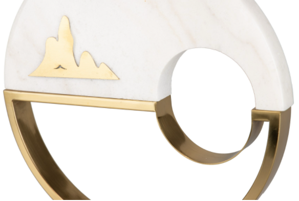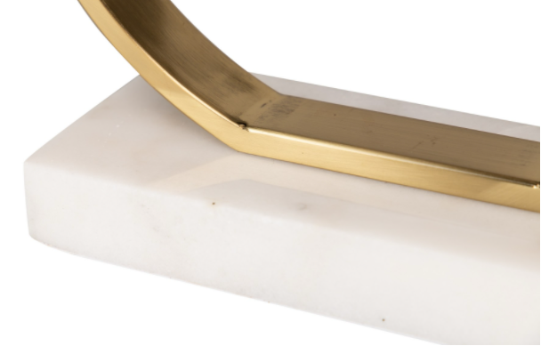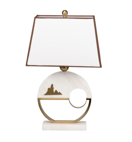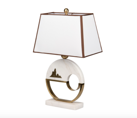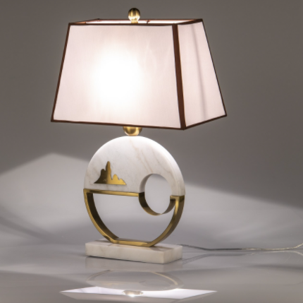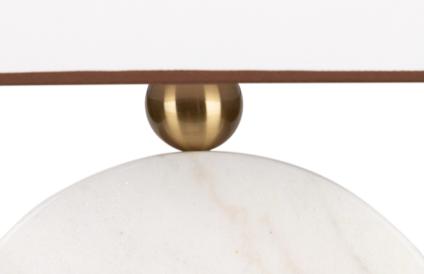 Candeeiro de mesa Burg, base em pedra m ármore e metal dourado, com abajur branco.