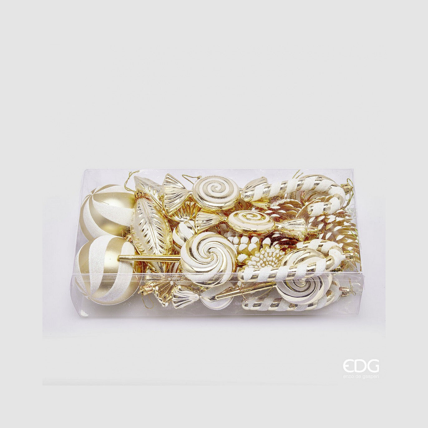 O conjunto de 25 peças pendentes de árvore de Natal em dourado e branco são peças que brilham com o espírito festivo da temporada. Dourado tradicional, vibrantes e o toque de elegância, este ornamento torna-se um destaque na Árvore de Natal.