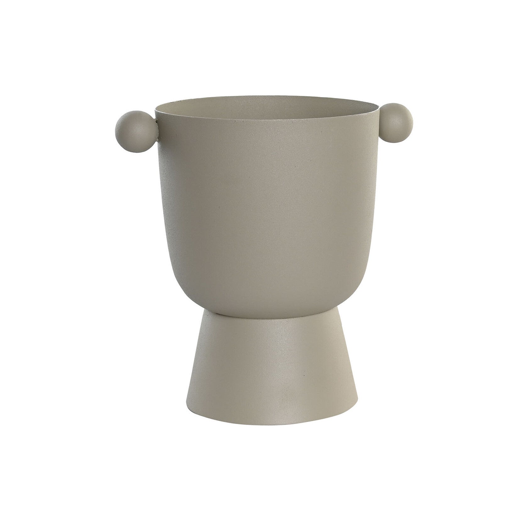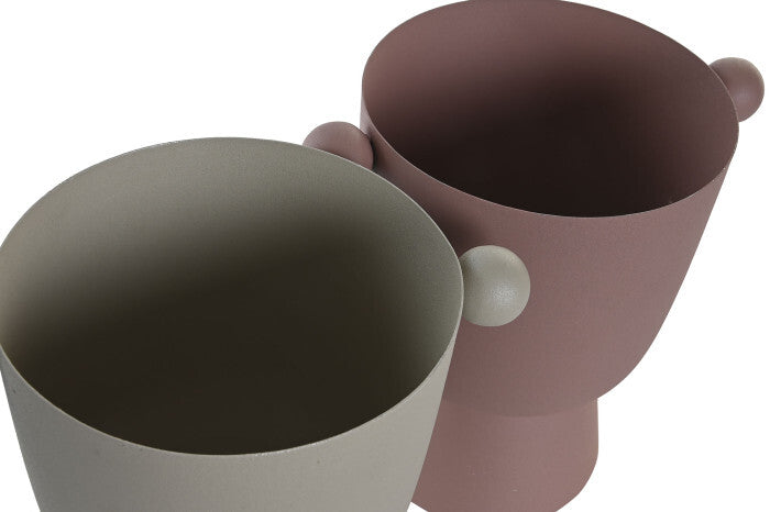 Esta jarra é de extrema simplicidade, tem um design limpo e minimalista é realçado pelo uso de metal bege ou rosa velho texturado, que adiciona um toque de suavidade e sofisticação. A jarra repousa sobre um delicado pé que confere uma sensação de elevação e graça ao conjunto. As cores são suaves e discretas, criando um visual clean e atemporal. Duas pequenas bolinhas são habilmente incorporadas como pegas, tornando-o fácil de manusear.