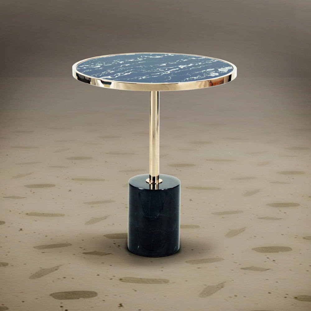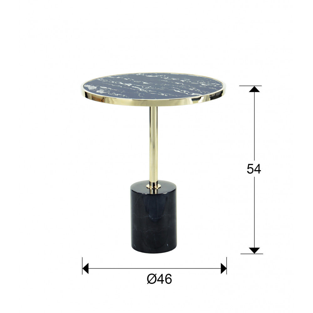 Mesa de Apoio Dekala, em aço dourado com base mármore preto e tampo de vidro temperado acabamento imitação mármore. Uma peça de mobiliário com muito caráter e personalidade esmagadora que será uma maravilha para os sentidos. Ideal para colocar em salas de estar, corredores e quartos, como mesa de cabeceira. A Mesa Apoio combina perfeitamente o vidro do topo com o aço das sua base, um acabamento da base que reforça o seu design atrativo.