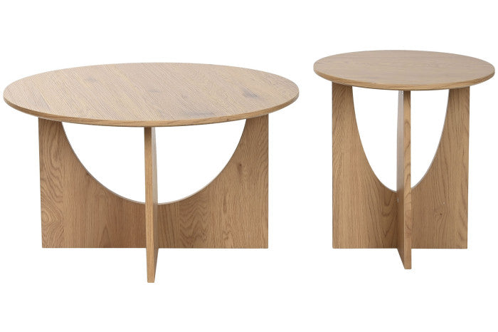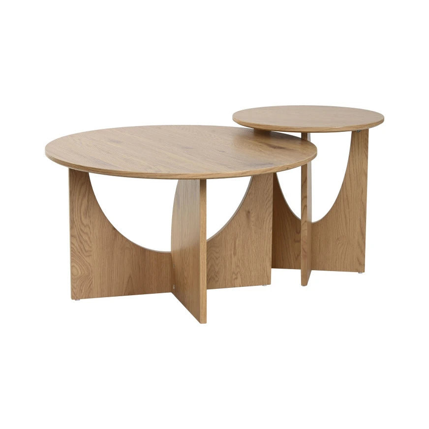 Mesas de centro em cor de madeira natural, feitas em MDF.