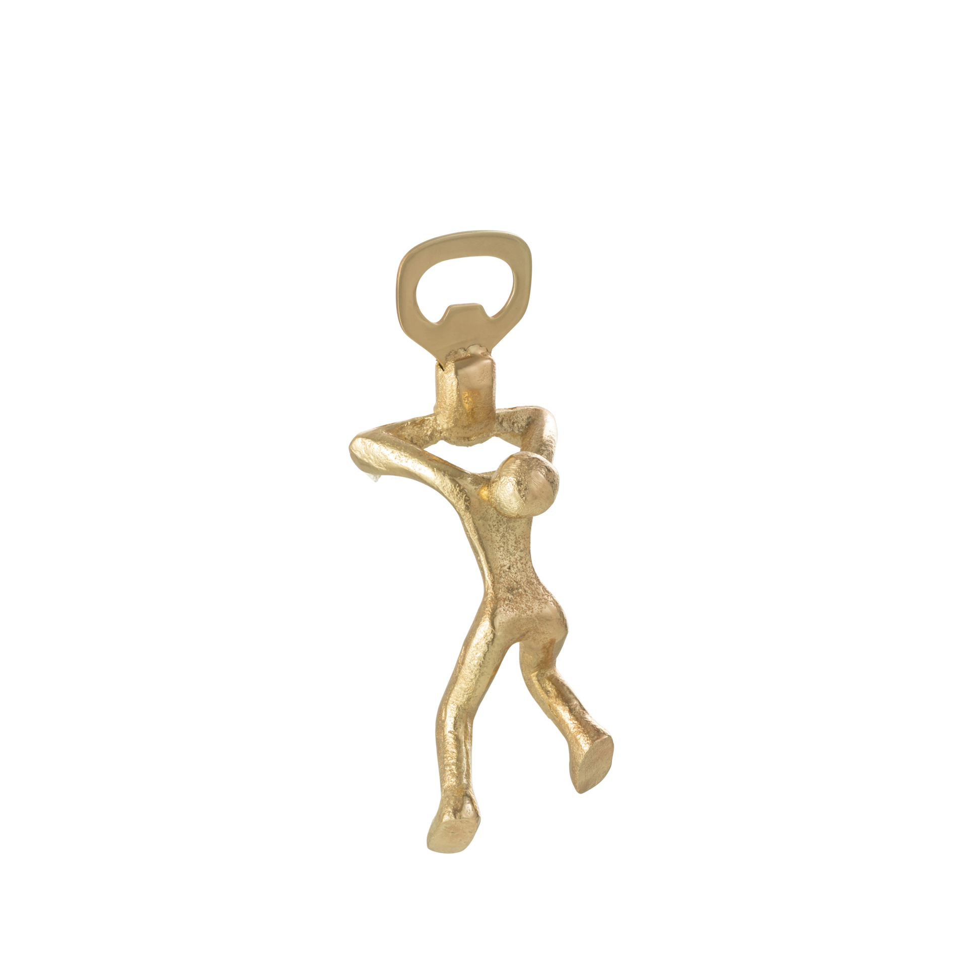 Abre garrafas em forma de homem dourado, em metal.