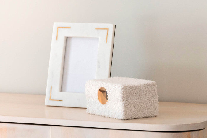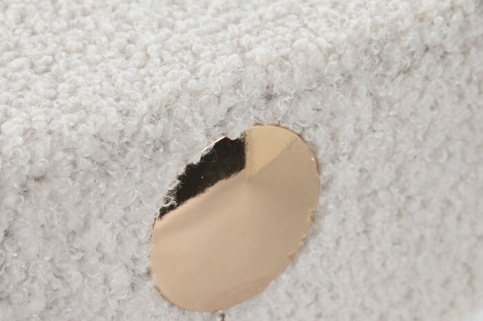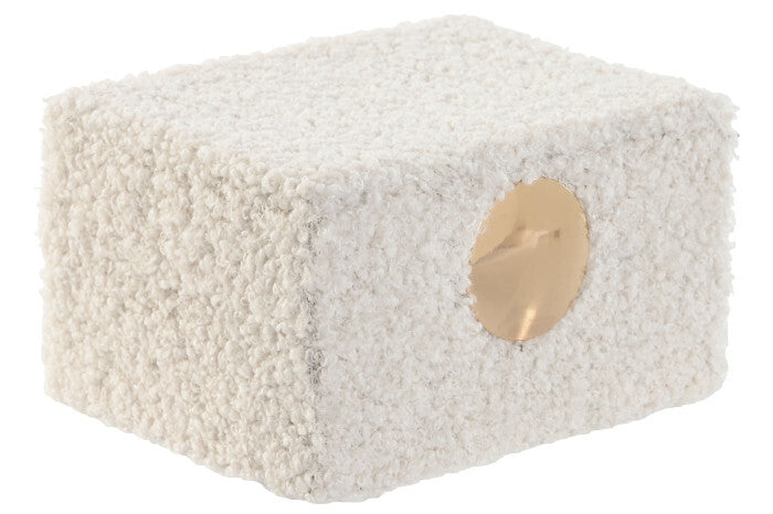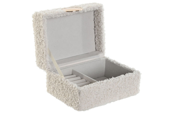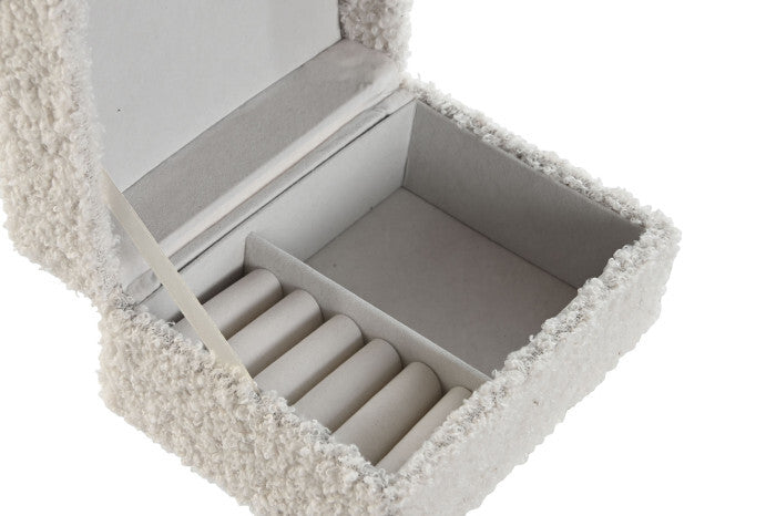 Caixa Decorativa Borreguito Branco, caixa forrada de borreguito branco, com interior forrado em veludo cinzento claro.