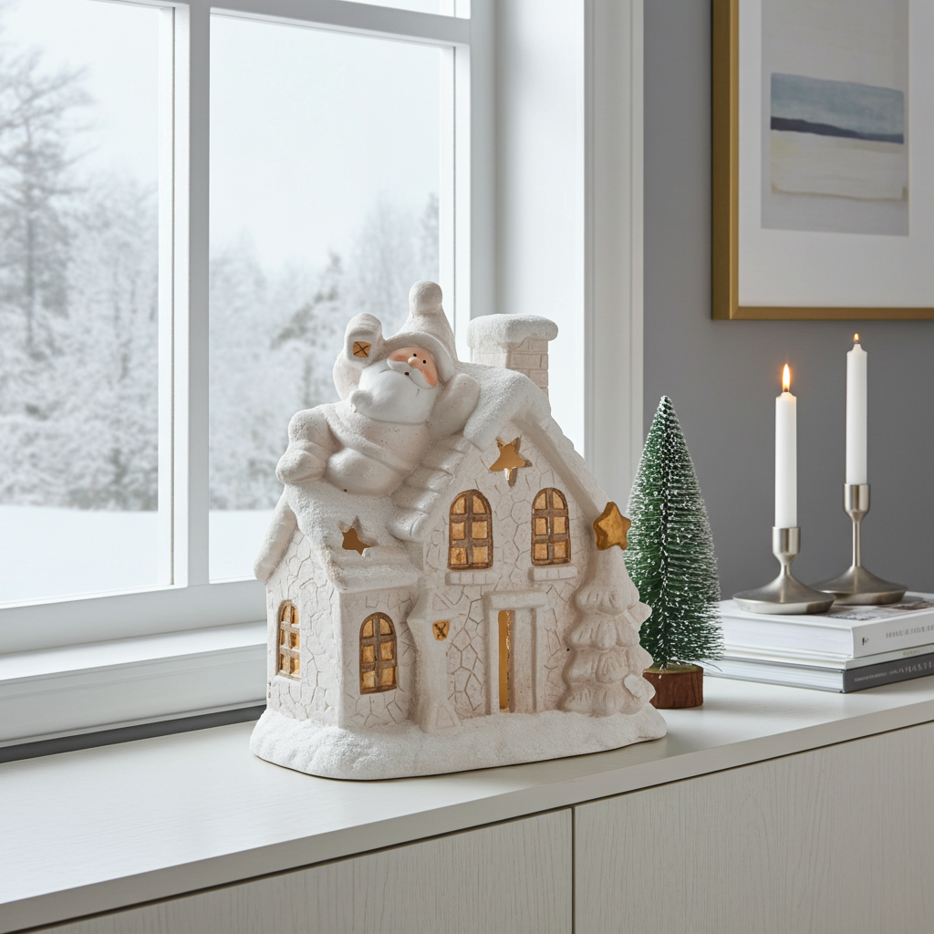 Esta casa decorativa é a peça perfeita para trazer o encanto e a serenidade do Natal à sua casa. Apresenta um design detalhado que combina elegância com o aconchego típico das aldeias natalícias.
