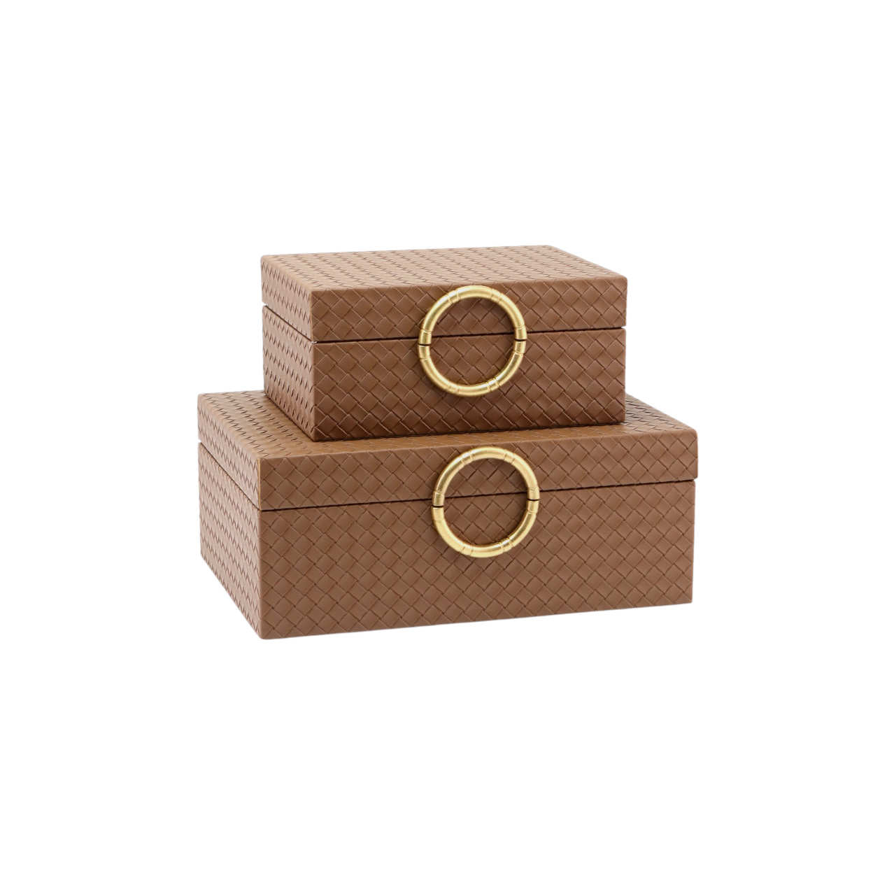 Descubra a elegância atemporal deste conjunto de caixas decorativas em tons castanhos, com um sofisticado padrão entrelaçado que evoca a arte da cestaria tradicional.