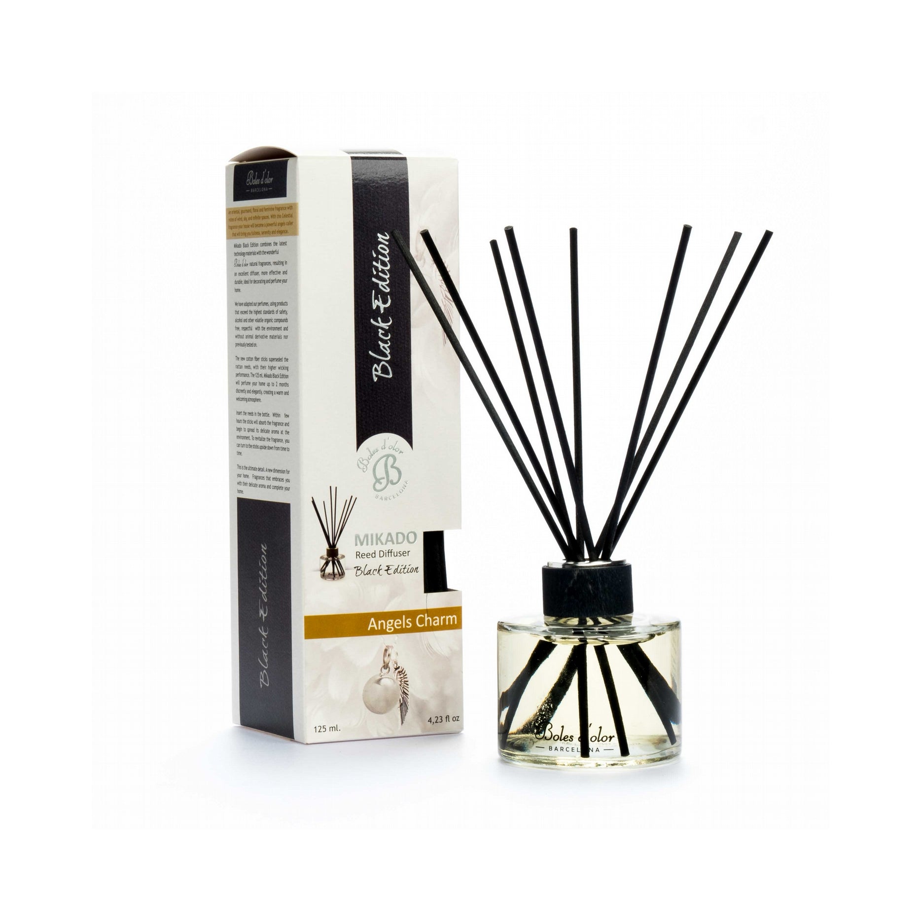 Luxuoso mikado Black Edition Angels Charm 125ml, um difusor de aroma premium com uma fragrância oriental de feminilidade envolvente. Persistente, embriagadora, gulosa e misteriosa, esta fragrância transforma a sua casa num poderoso chamador de anjos, trazendo plenitude, serenidade e elegância a cada espaço.