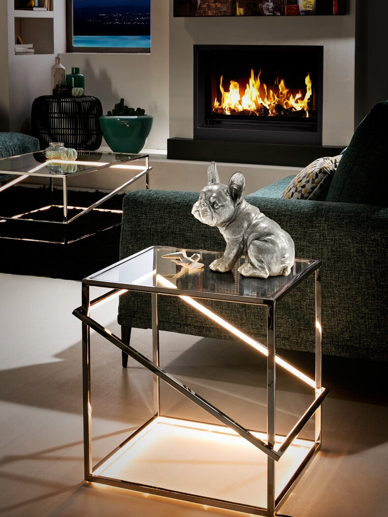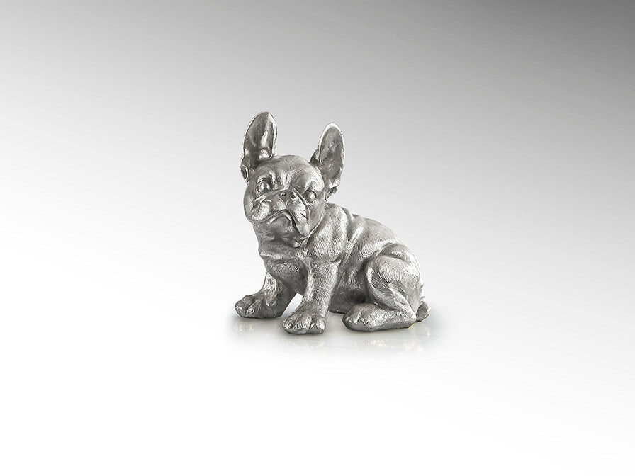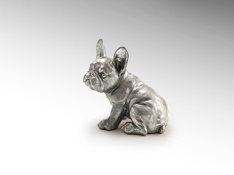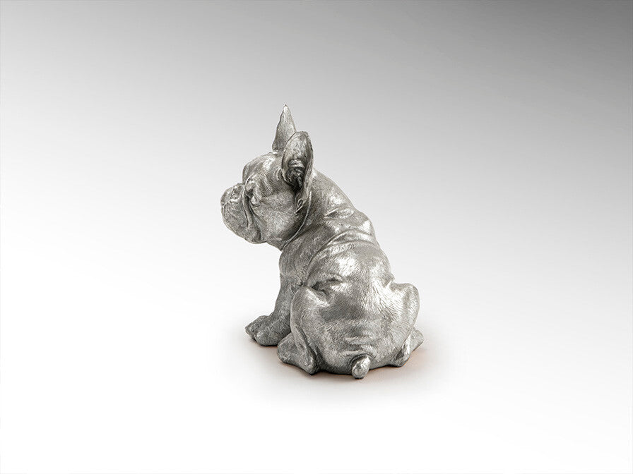Escultura do cão Bull dog francês, em poliresina com acabamento de folha de prata.