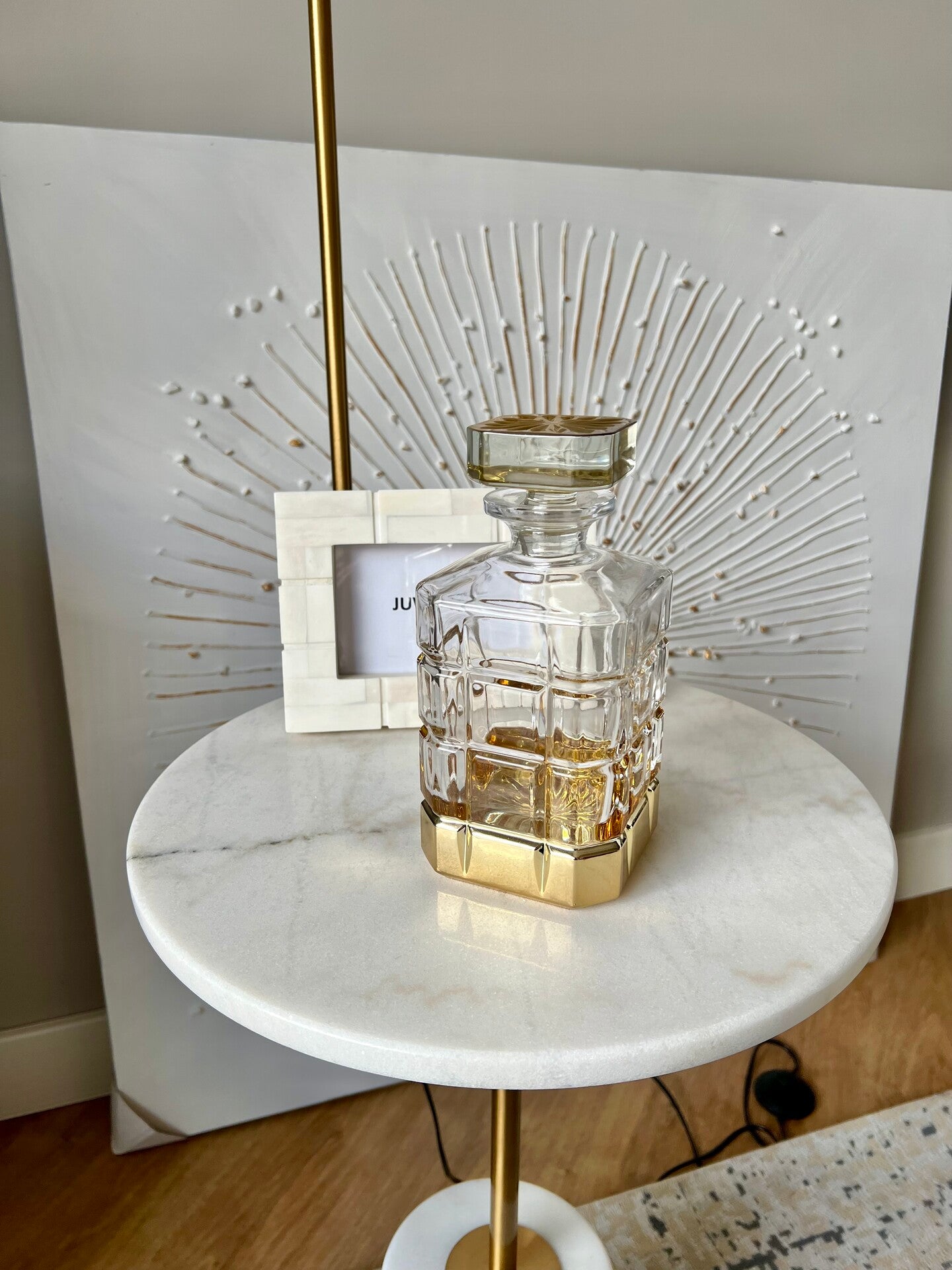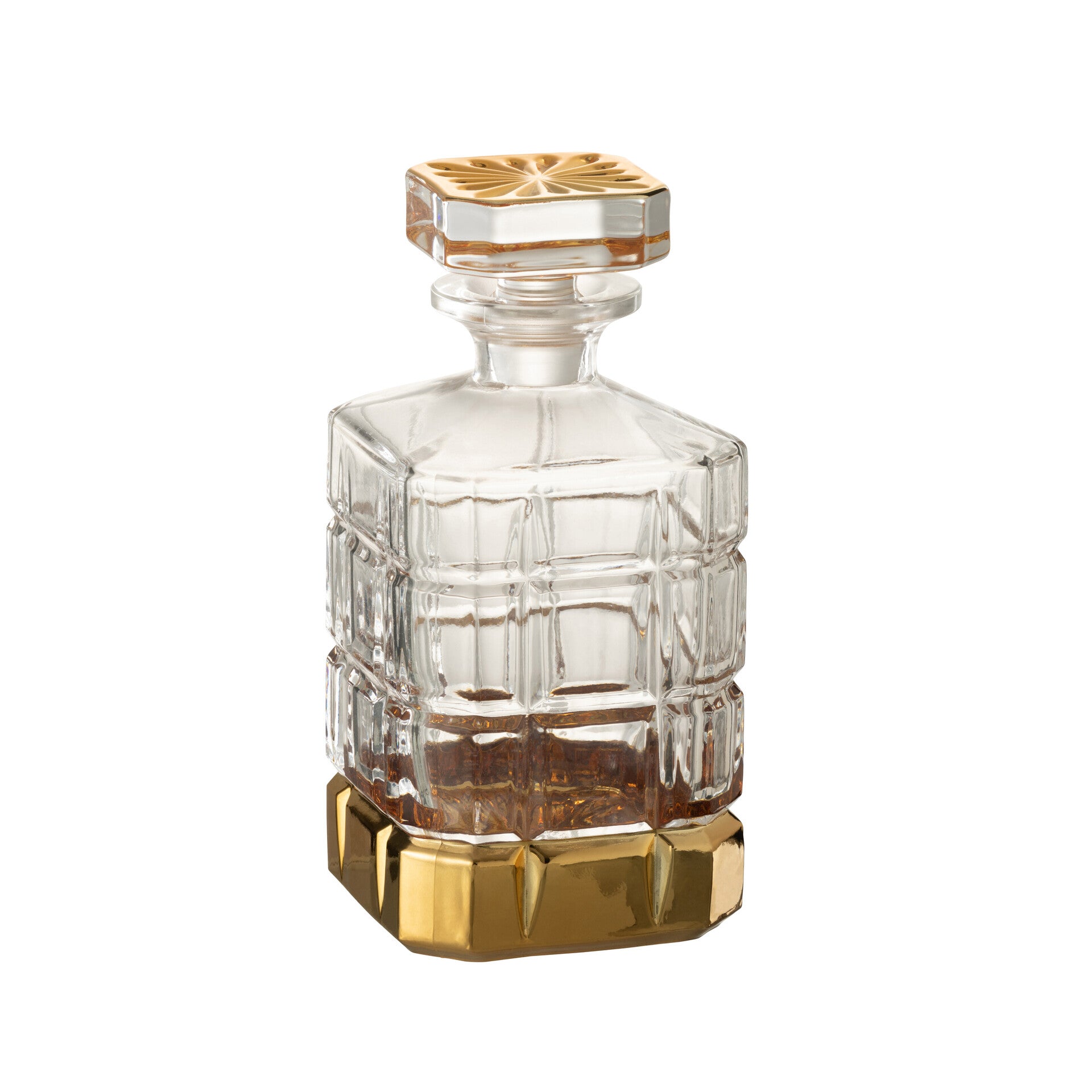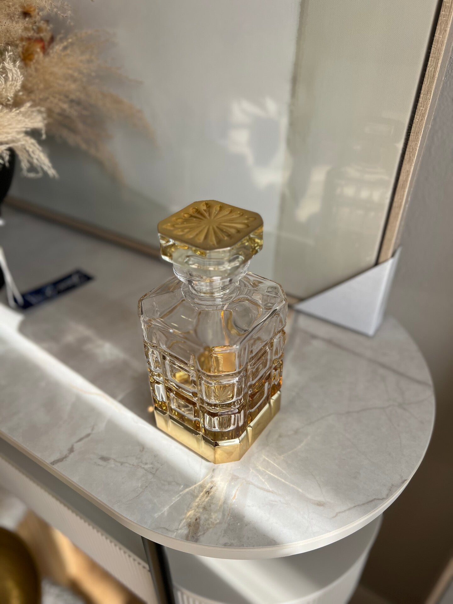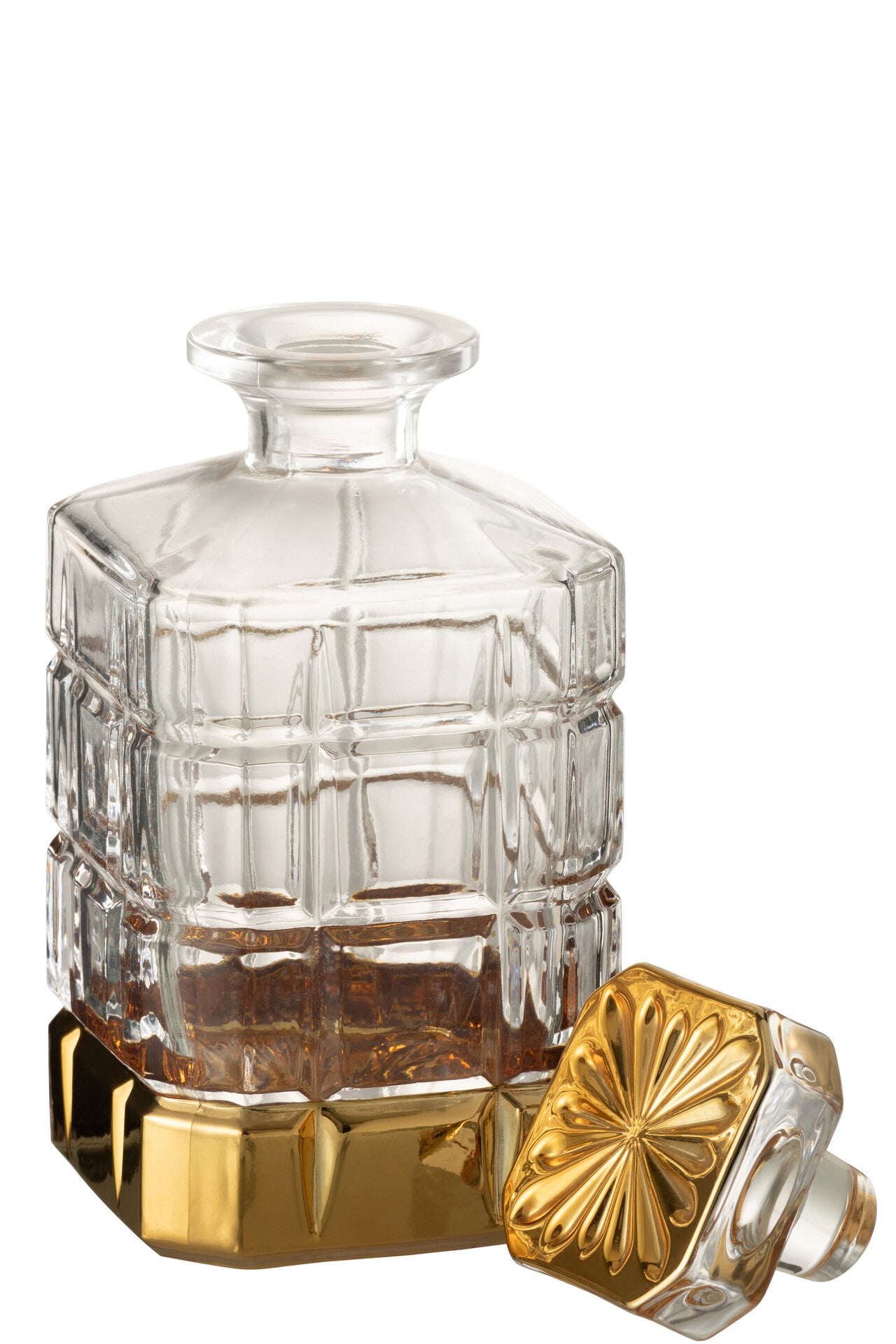 Garrafa Whisky Vidro Transparente/Dourado, com tampa esculpida também em vidro transparente e com topo dourado. Uma garrafa com muitos detalhes decorativos, esculpidos no vidro.