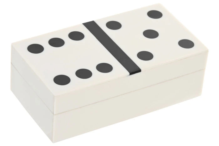 Este jogo de dominó é mais do que entretenimento. A própria caixa que guarda as peças é uma peça de dominó gigante, feita em resina branca com detalhes pretos. Minimalista, ousado e inesperado, é o tipo de objeto que surpreende — seja numa prateleira, numa mesa de centro ou nas mãos de quem joga.