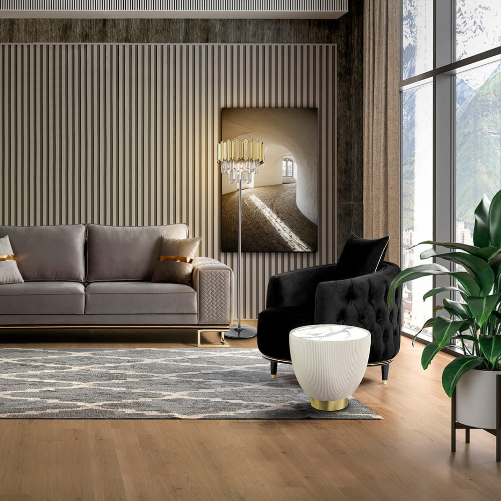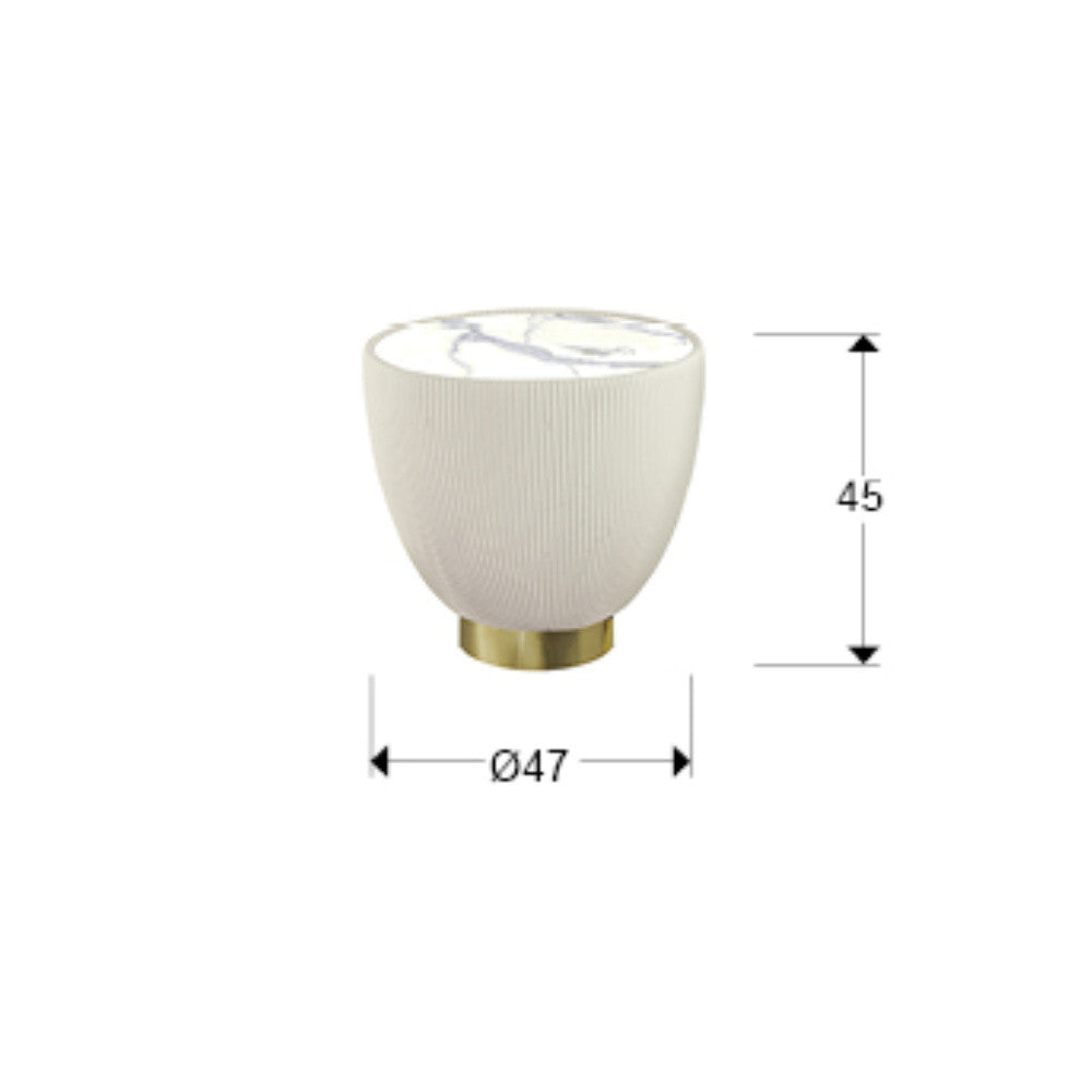O tampo em pedra sinterizada com efeito mármore branco eleva ainda mais o requinte da peça, oferecendo resistência, durabilidade e fácil manutenção. Com um design equilibrado e formas suaves, esta mesa de apoio é perfeita para salas de estar modernas, elegantes ou de inspiração contemporânea, tornando-se um verdadeiro ponto focal do espaço.